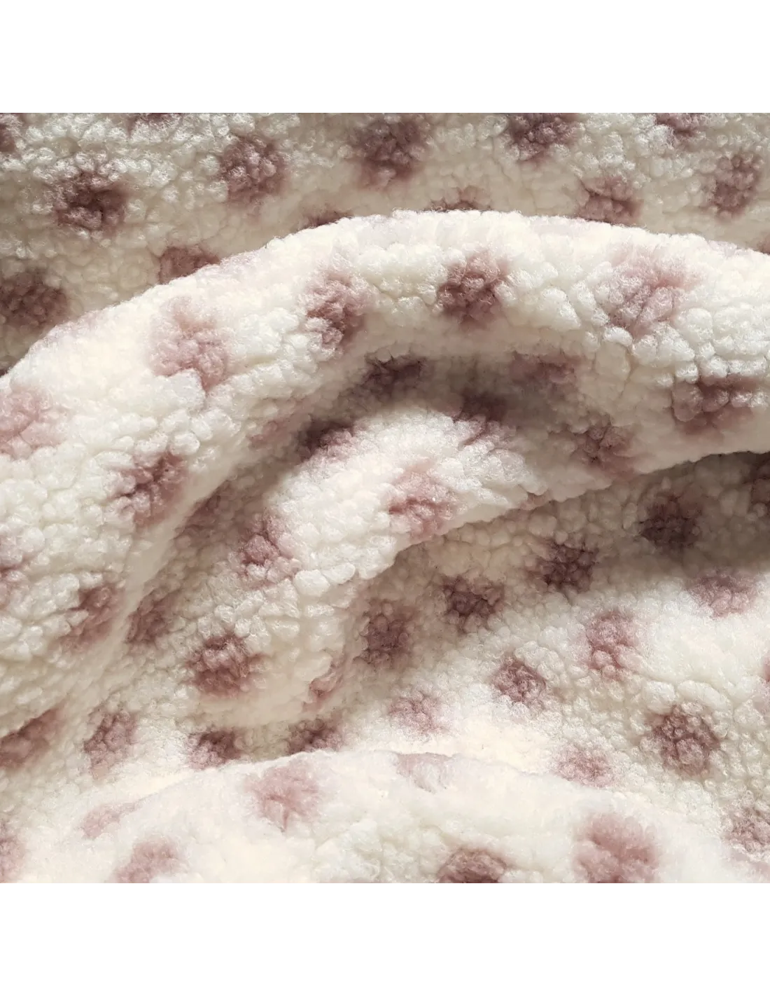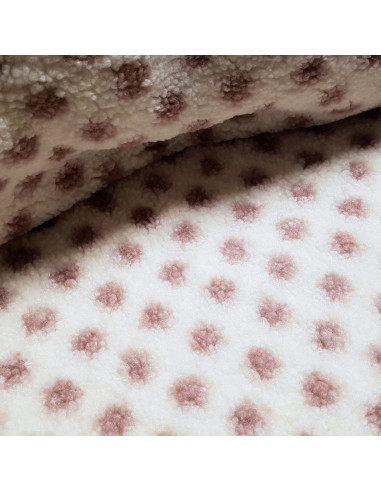 Lainage mouton pois roses poudrés sur fond blanc. Parfait pour la confection d'un manteau, d'une veste ou tout simplement d'une couverture. Doux au toucher.