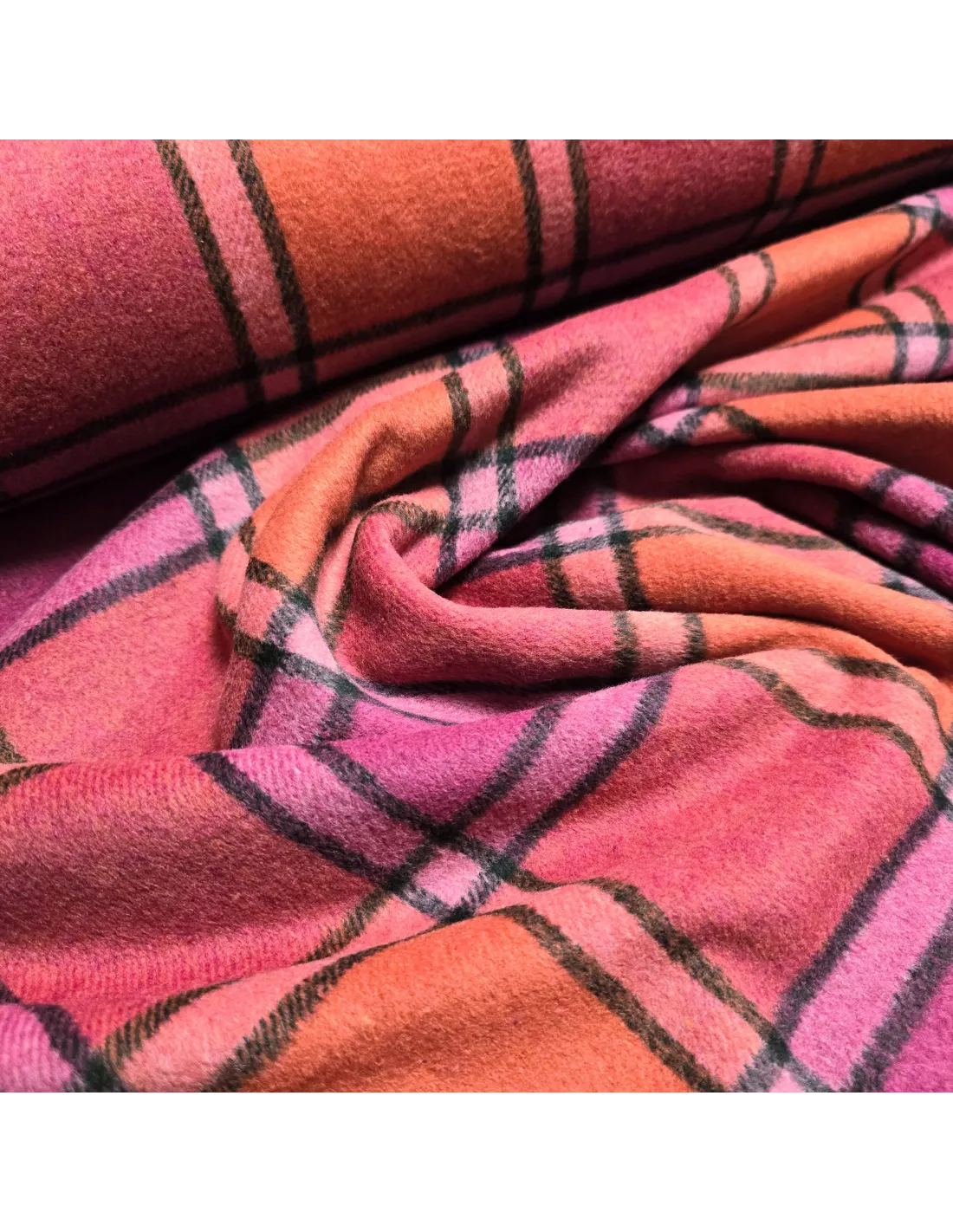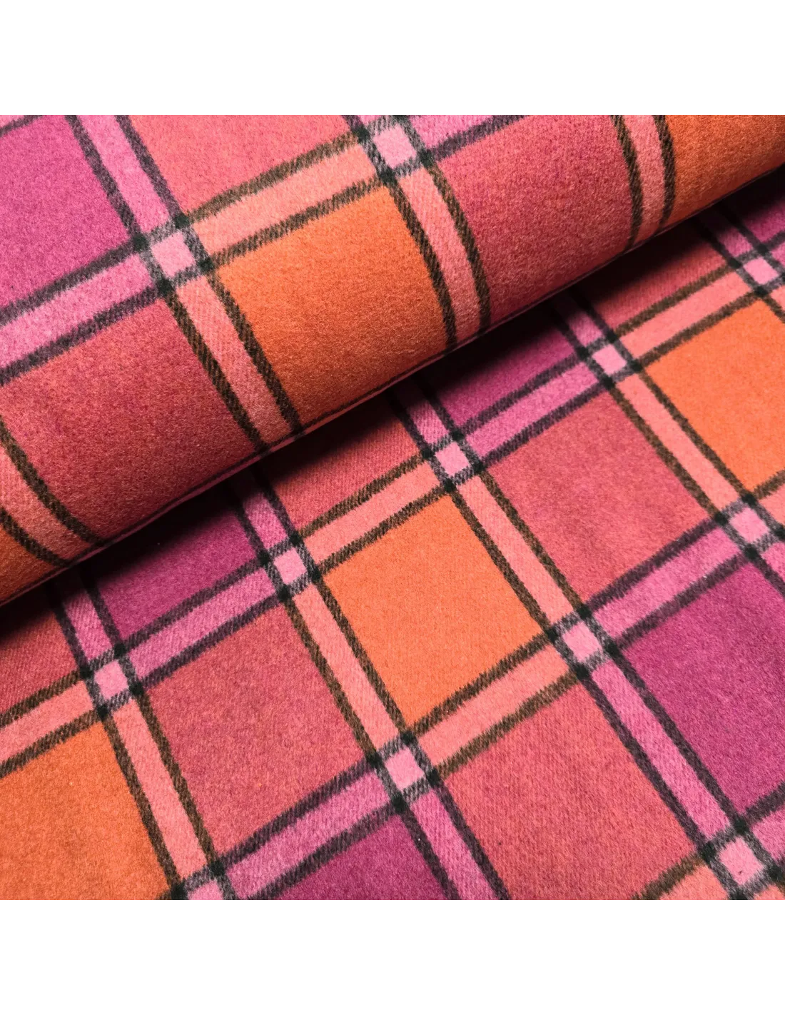 Lainage carreaux roses et oranges. Parfait pour la confection d'un manteau, d'une veste ou tout simplement d'une couverture. Doux au toucher. Envers carreaux.