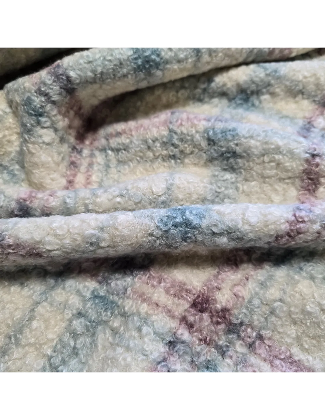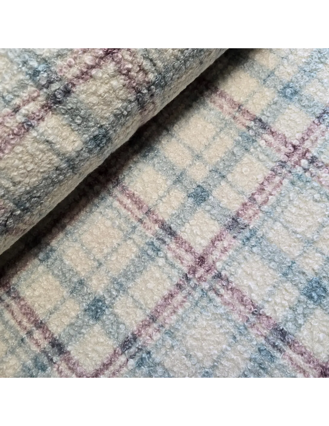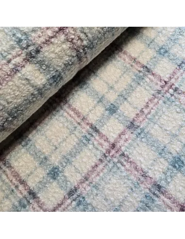 Lainage bouclette carreaux écru mauve et bleu. Parfait pour la confection d'un manteau, d'une veste ou tout simplement d'une couverture. Doux au toucher. Envers carreaux.