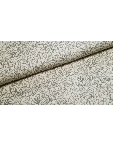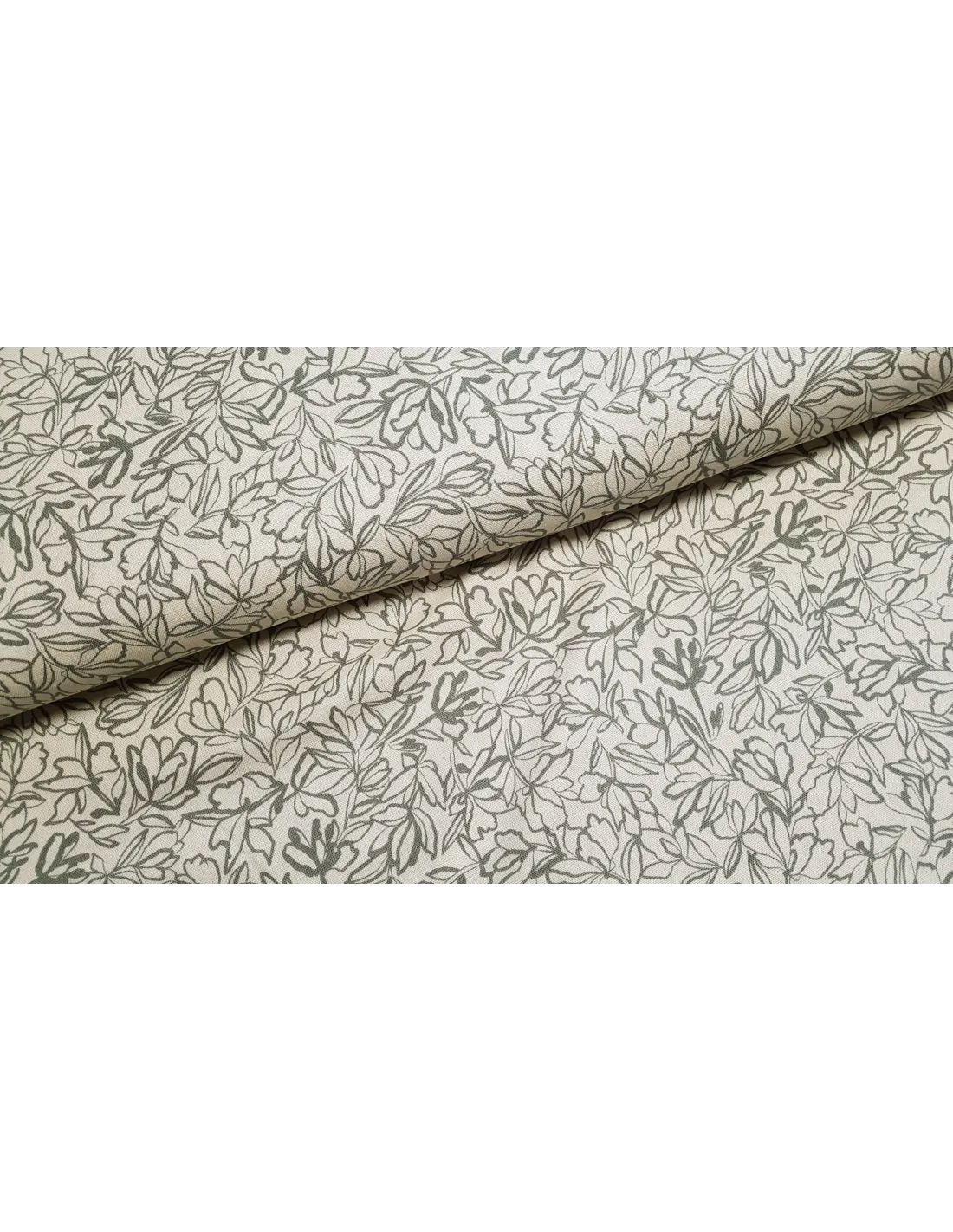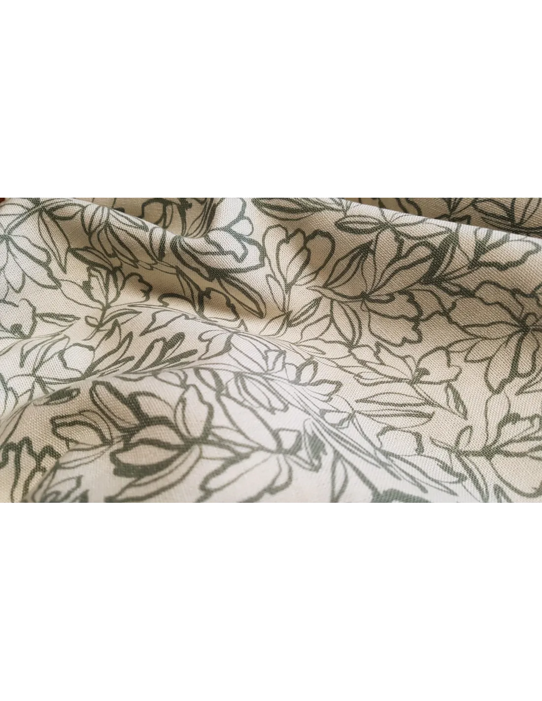 Tissu mélangé lin et viscose, imprimé feuillage sur fond écru. Ce tissu est plus souple qu'un lin 100%. Parfait pour un pantalon d'été ou un short, une chemise...