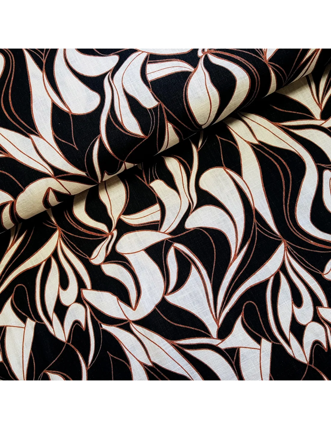 Lin lavé imprimé feuilles art déco. Ce tissu possède une bonne tenue et peut être utilisé pour l'habillement comme l'ameublement