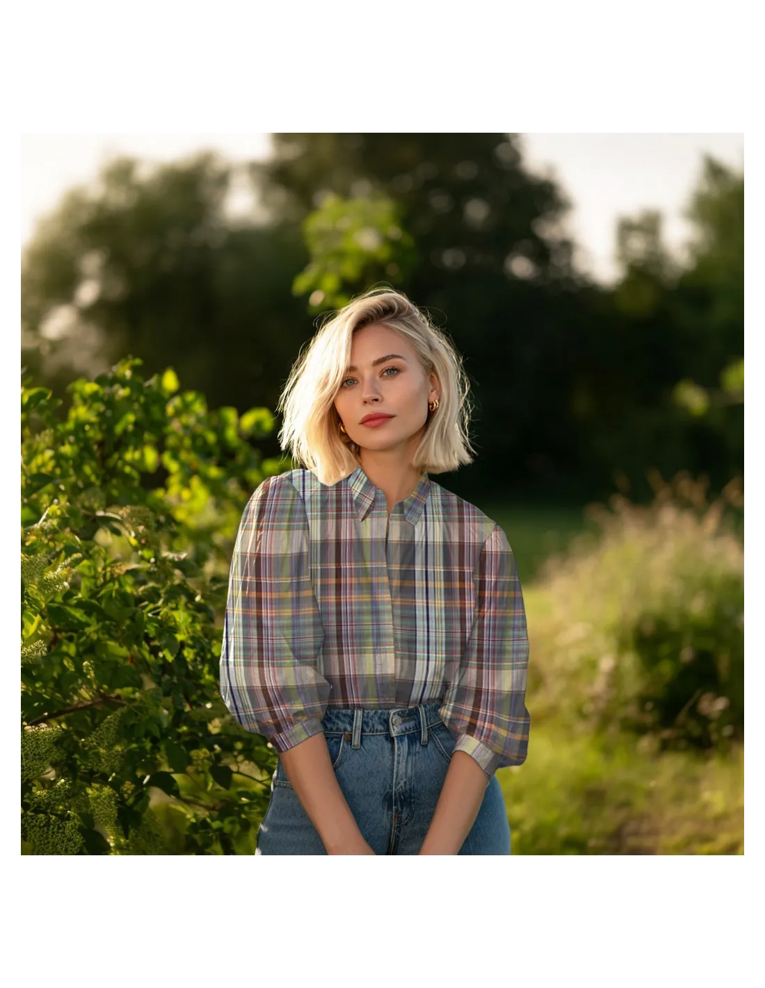 Motif Carreaux Sophistiqués : Un quadrillage délicat associant des teintes de bleu marine, gris perle et blanc, créant un visuel structuré et facile à porter.