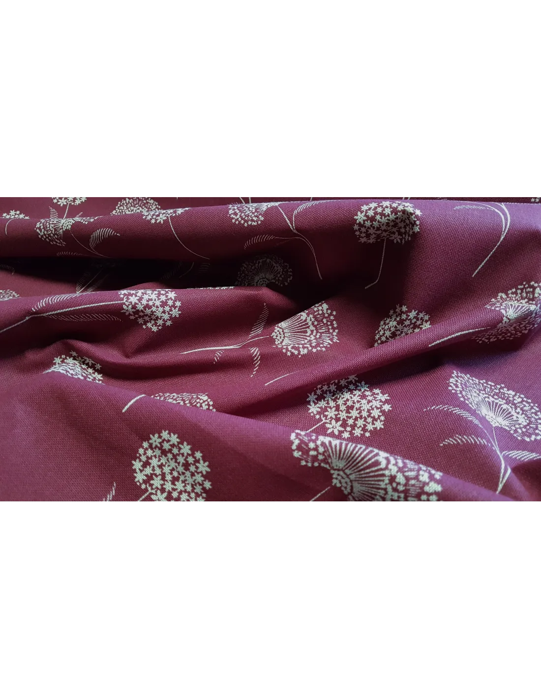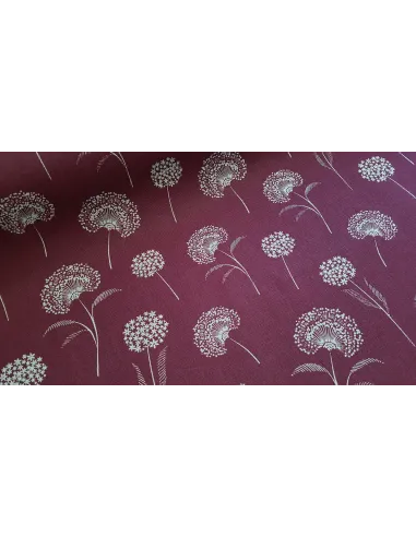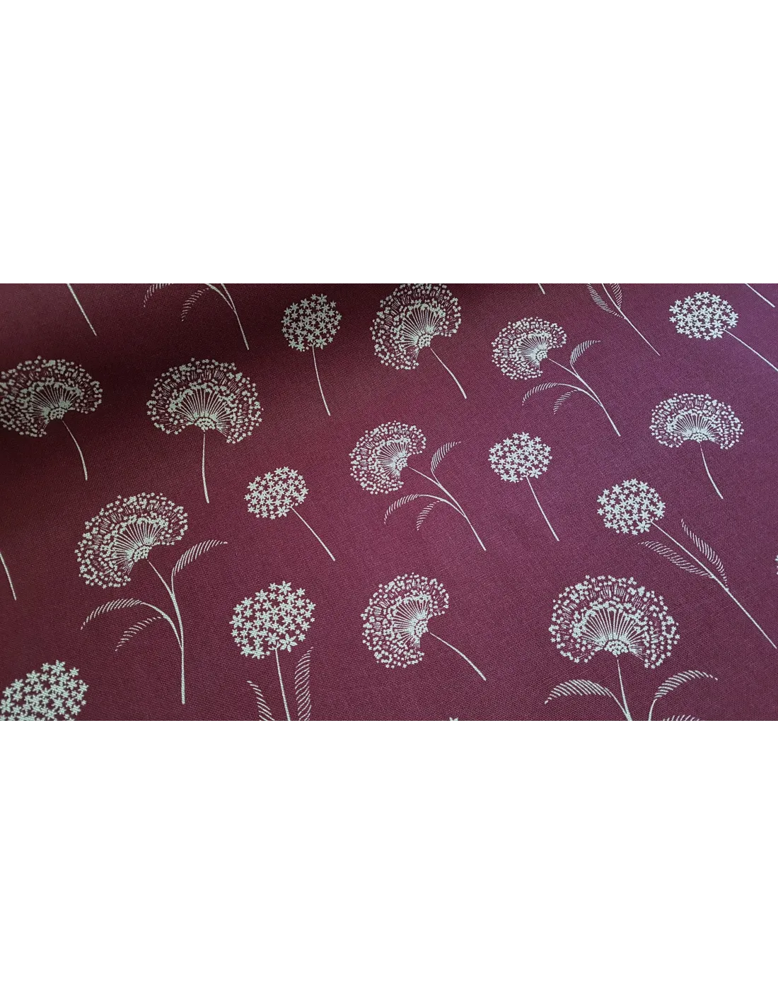 Tissu demi-natté aspect lin avec impression prune pissenlit. Tissu un peu épais (bachette). Convient pour la confection de rideaux, housses de canapé, coussins, sacs...