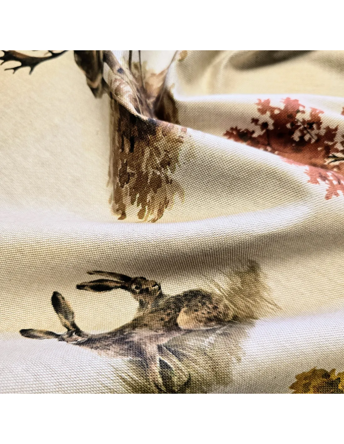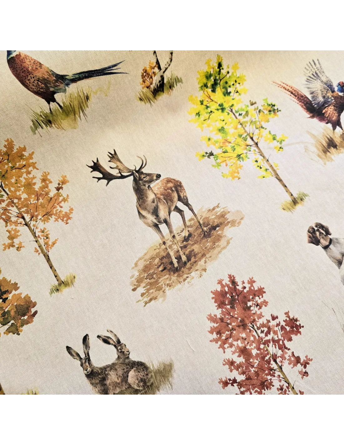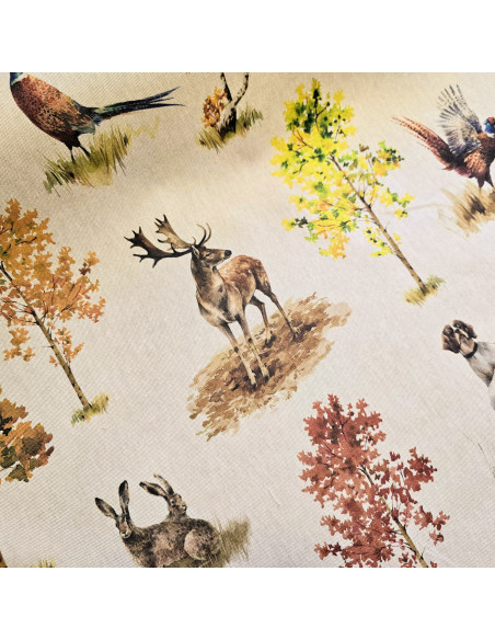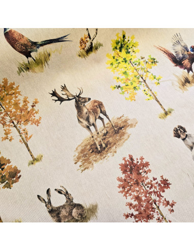 Support imitation lin aux motifs inspiration chasse. Tissu un peu épais (bachette). Convient pour la confection de rideaux, housses de canapé, coussins, sacs...