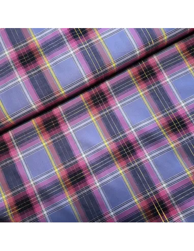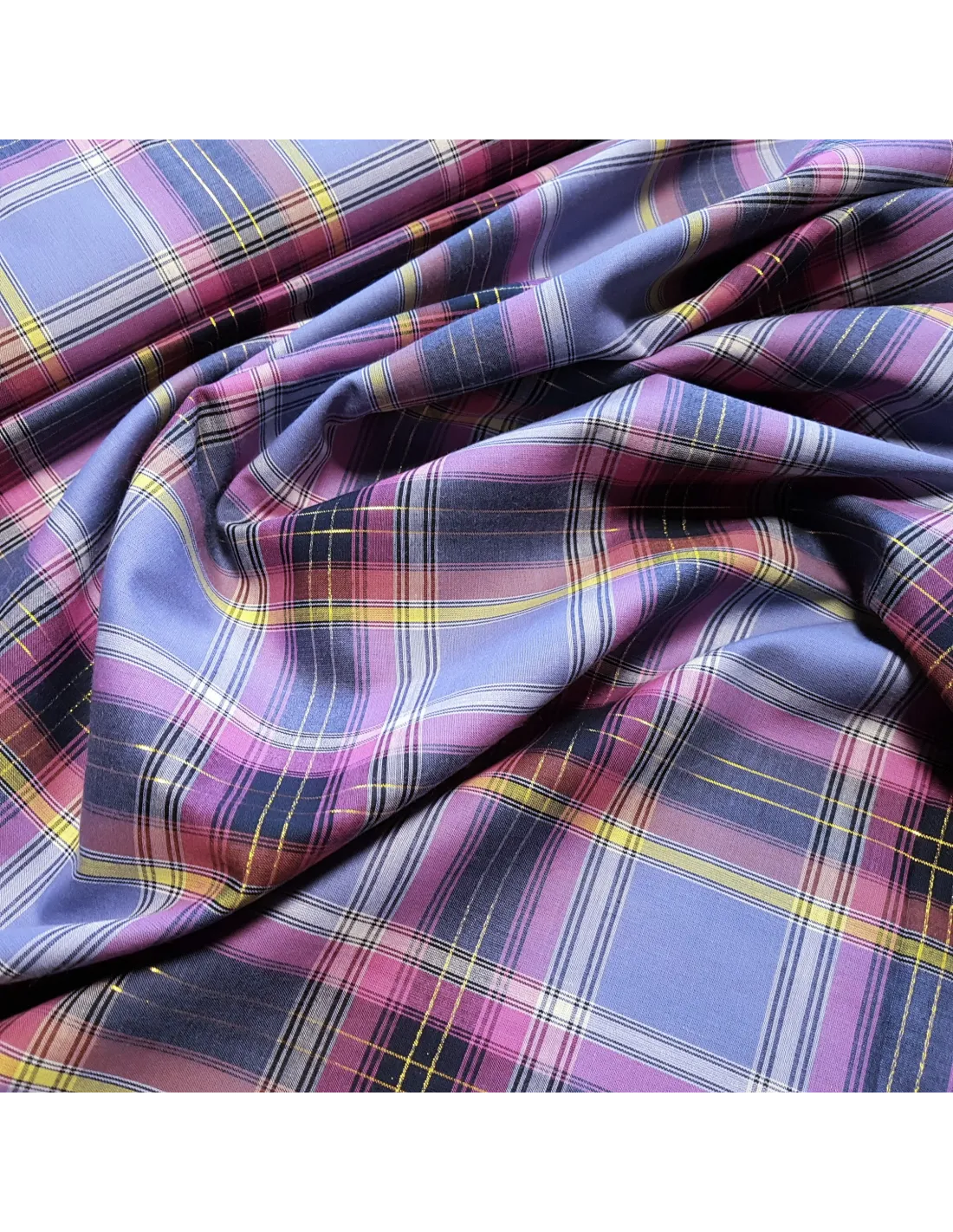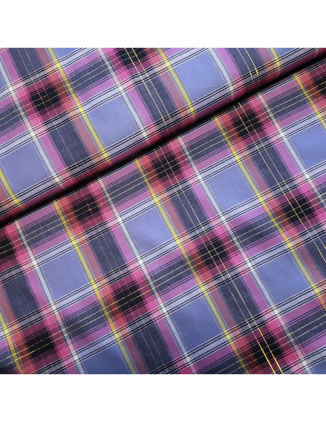 Tissu madras dans les tons violets et rose, avec fil de lurex doré. Superbe pour une chemise ou un top.
