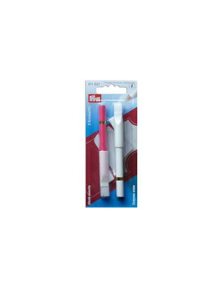 La craie tailleur est lors de la confection et de la couture un outil indispensable pour marquer et tracer les tissus. Avec le crayon craie, des marquages très précis peuvent être appliqués sur le tissu. Une brosse en plastique à l'extrémité du capuchon inséré permet d'éliminer plus tard les lignes de craie tracées. Les crayons craie sont disponibles séparément chez Prym en blanc. Le paquet de 2 contient un crayon en blanc et un en bleu ou en rose et le paquet de 4 offre deux crayons craie blancs, un bleu et un rose. Chaque crayon a son propre capuchon de protection avec brosse à gommer.