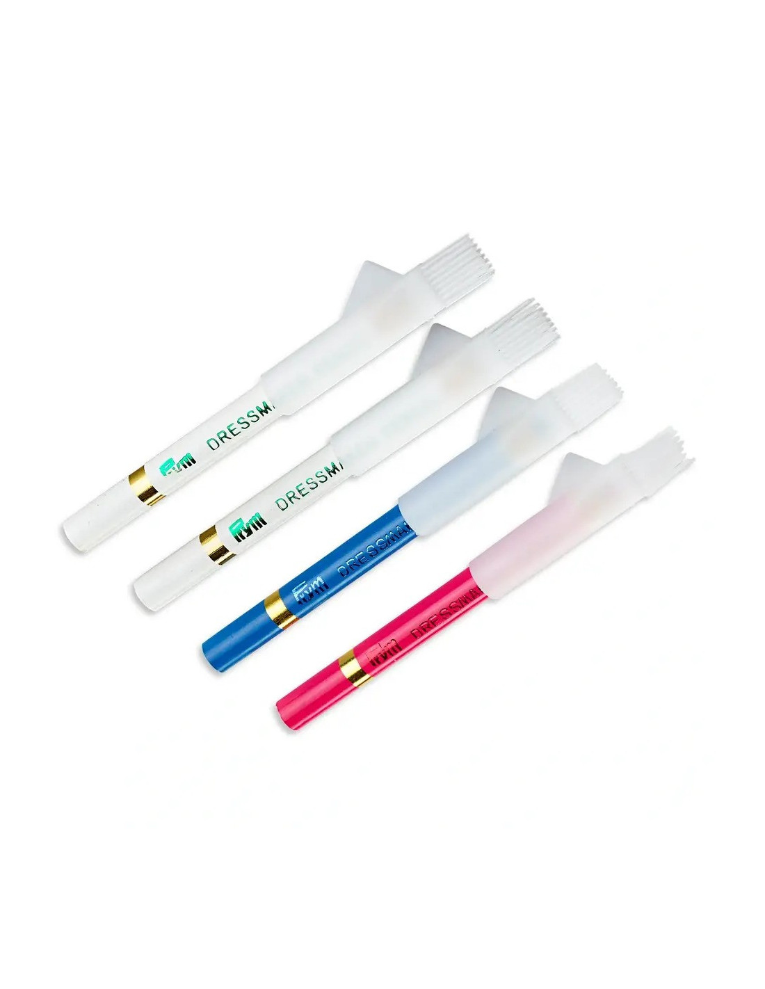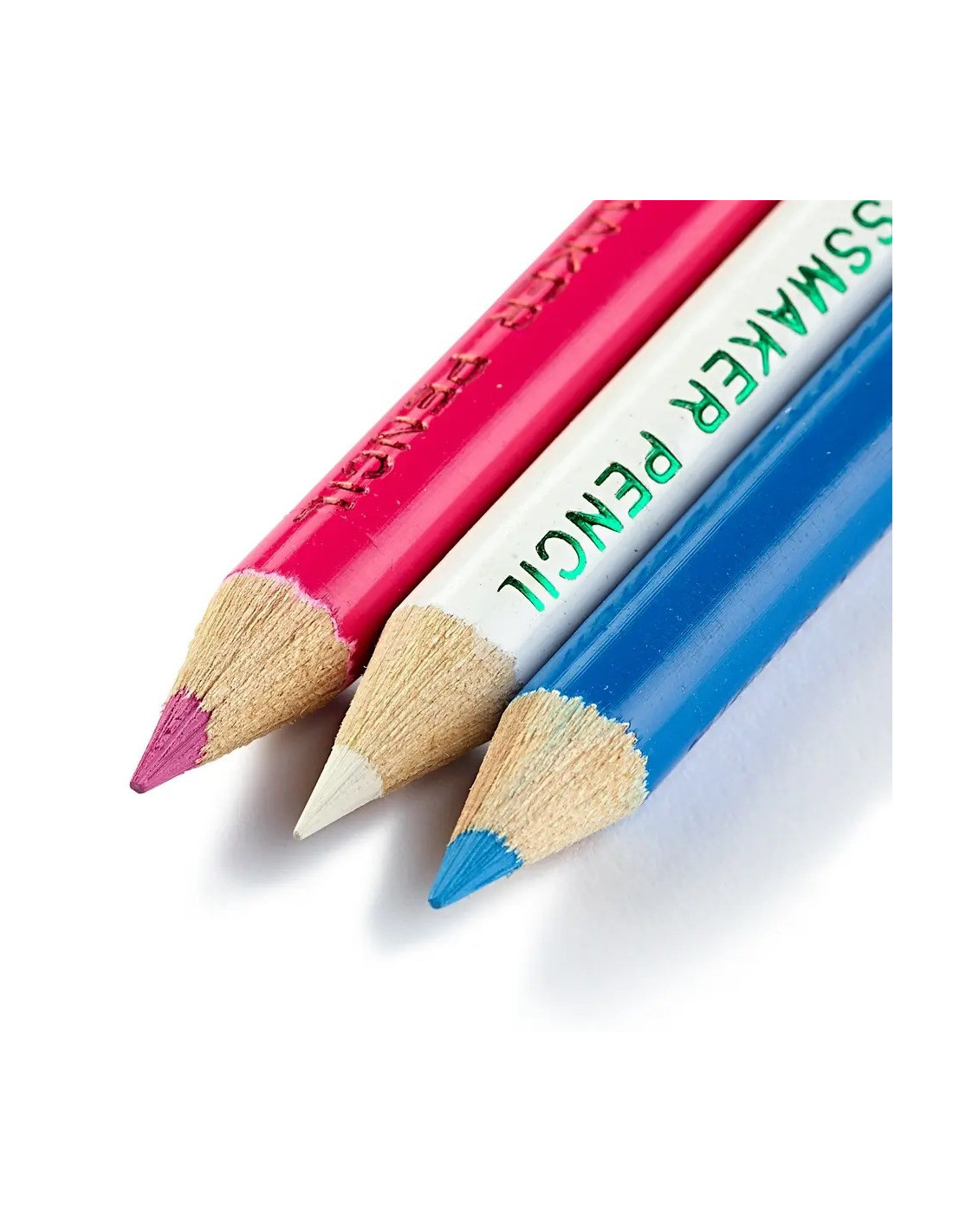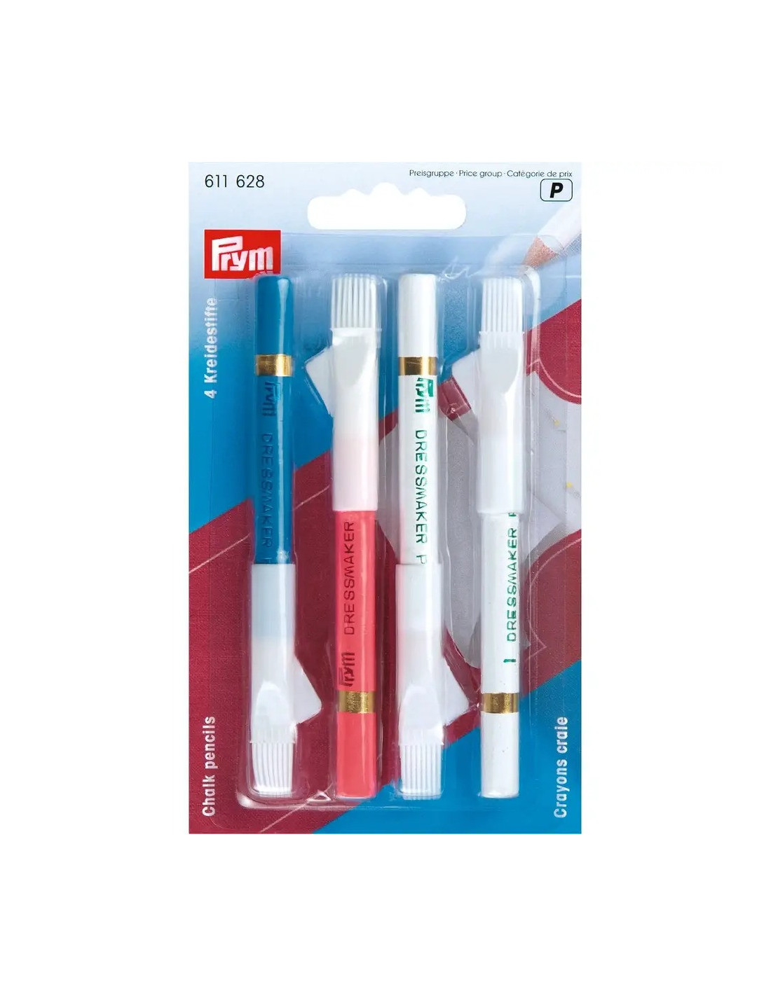 La craie tailleur est lors de la confection et de la couture un outil indispensable pour marquer et tracer les tissus. Avec le crayon craie, des marquages très précis peuvent être appliqués sur le tissu. Une brosse en plastique à l'extrémité du capuchon inséré permet d'éliminer plus tard les lignes de craie tracées. Les crayons craie sont disponibles séparément chez Prym en blanc. Le paquet de 2 contient un crayon en blanc et un en bleu ou en rose et le paquet de 4 offre deux crayons craie blancs, un bleu et un rose. Chaque crayon a son propre capuchon de protection avec brosse à gommer.