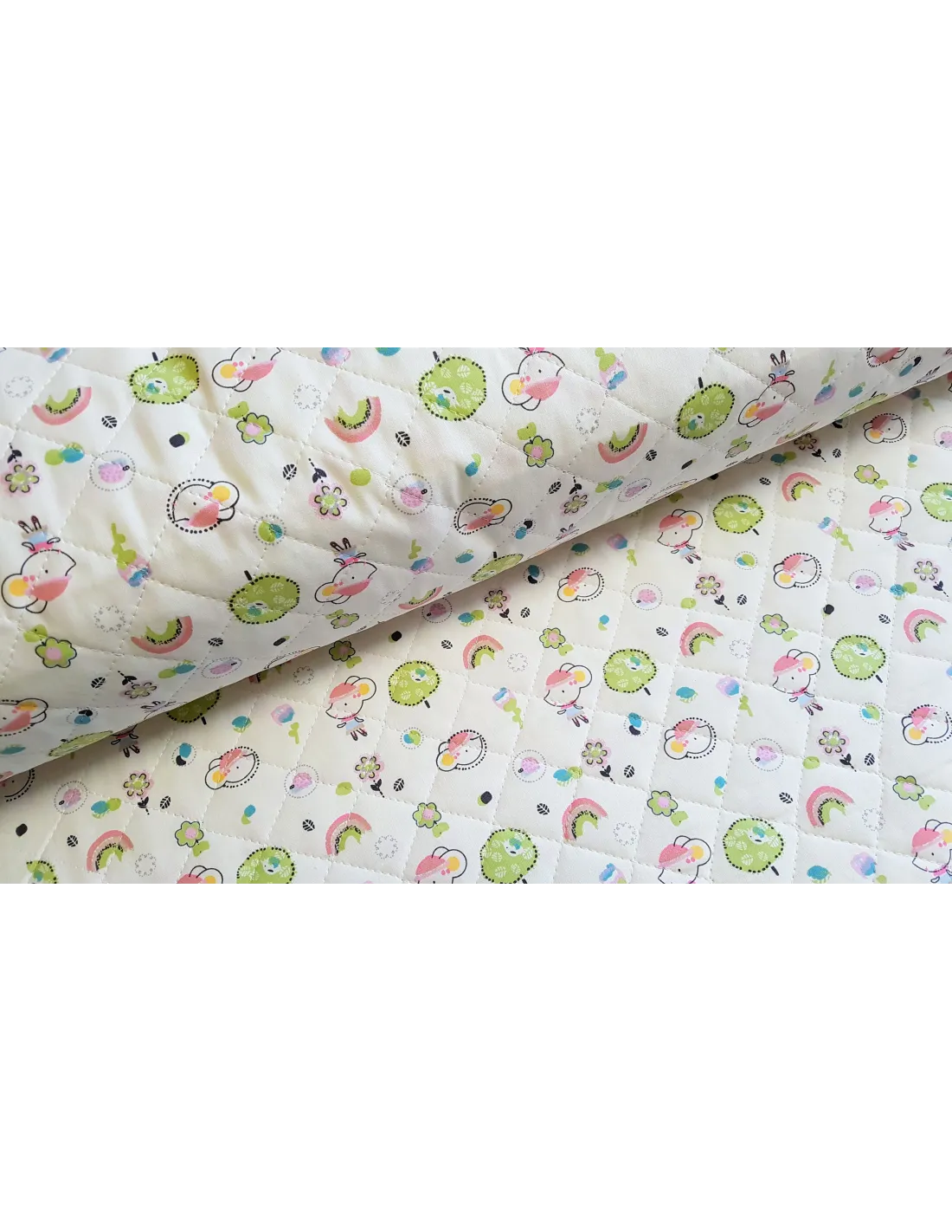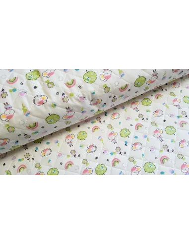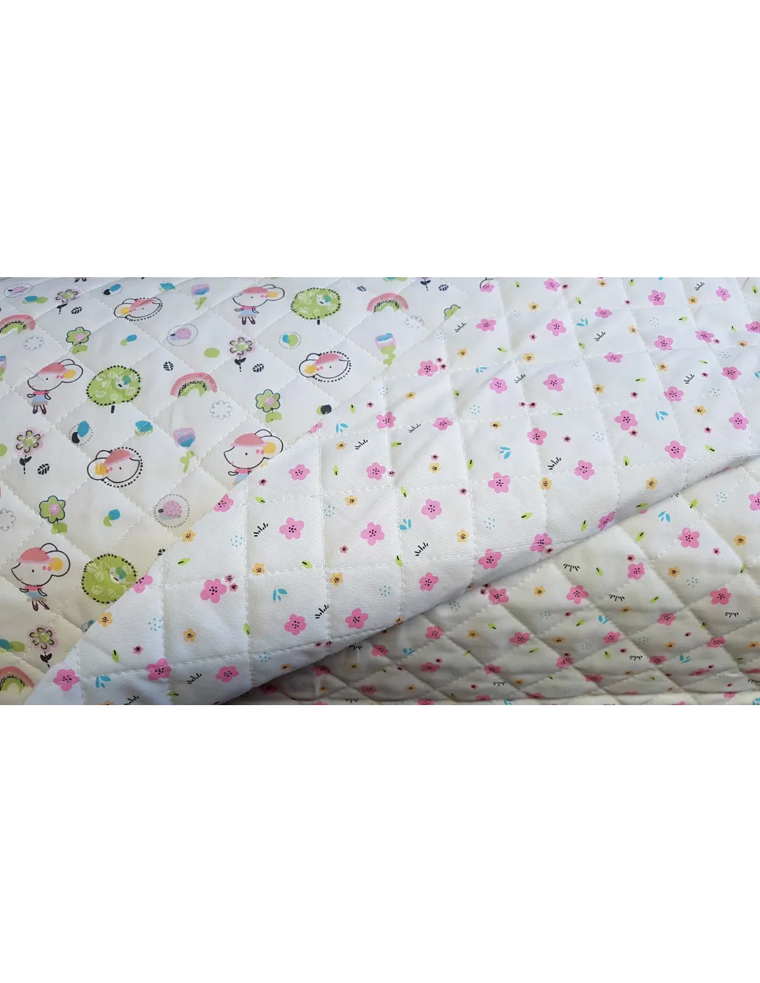 Matelassé imprimé souris fantaisie sur fond blanc avec un envers petites fleurs. Ce tissu est idéal pour la confection d'un nid douillet: gigoteuse, tour de lit, couverture… Il est également possible de réaliser de beaux manteaux.