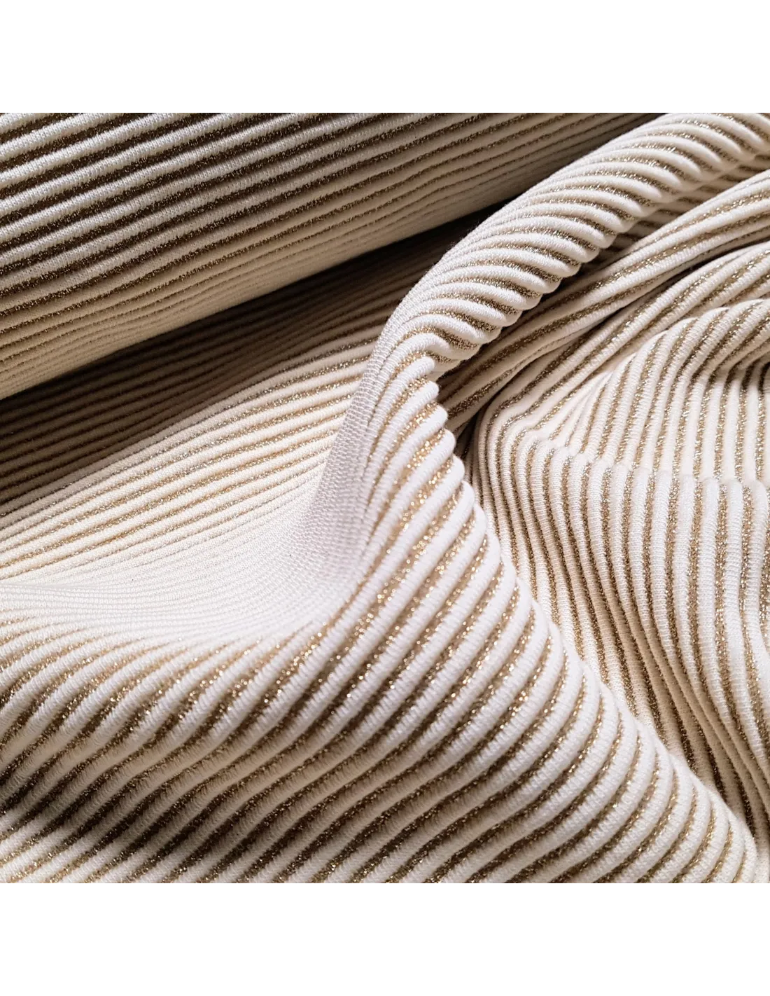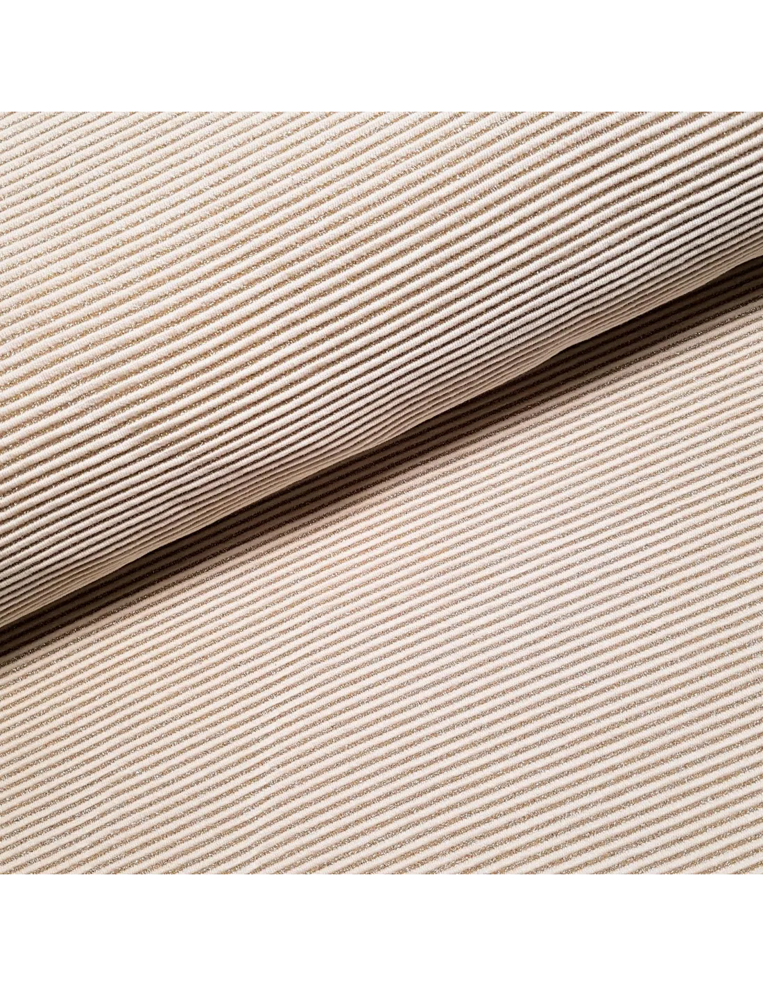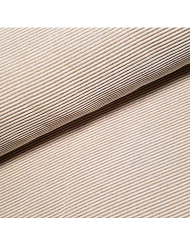 Matelassé rayures dorées sur fond écru. Ce tissu est idéal pour la confection d'un nid douillet: gigoteuse, tour de lit, couverture... Il est également possible de réaliser de beaux manteaux.