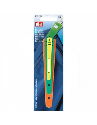 Pour enfiler les rubans élastiques et les tresses de ceinture, de capuche et bien plus encore, les trois enfileurs sont en plastique coloré. Les navettes allongées ont une forme légèrement conique avec une pointe ronde et sont équipées à la partie arrière de deux fentes dentées pour les rubans de largeur 6 mm, 12 mm et 18 mm. Un trou pour fixer un cordon de retour supplémentaire se trouve sur l’extrémité avant de la navette pour remplacer les anciens rubans. Avec ces trois enfileurs assortis, les élastiques et rubans sont remplacés en un tour de main.