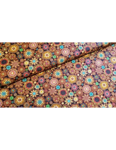 Superbe tissu coton patchwork à imprimés symboles colorés sur fond marron.