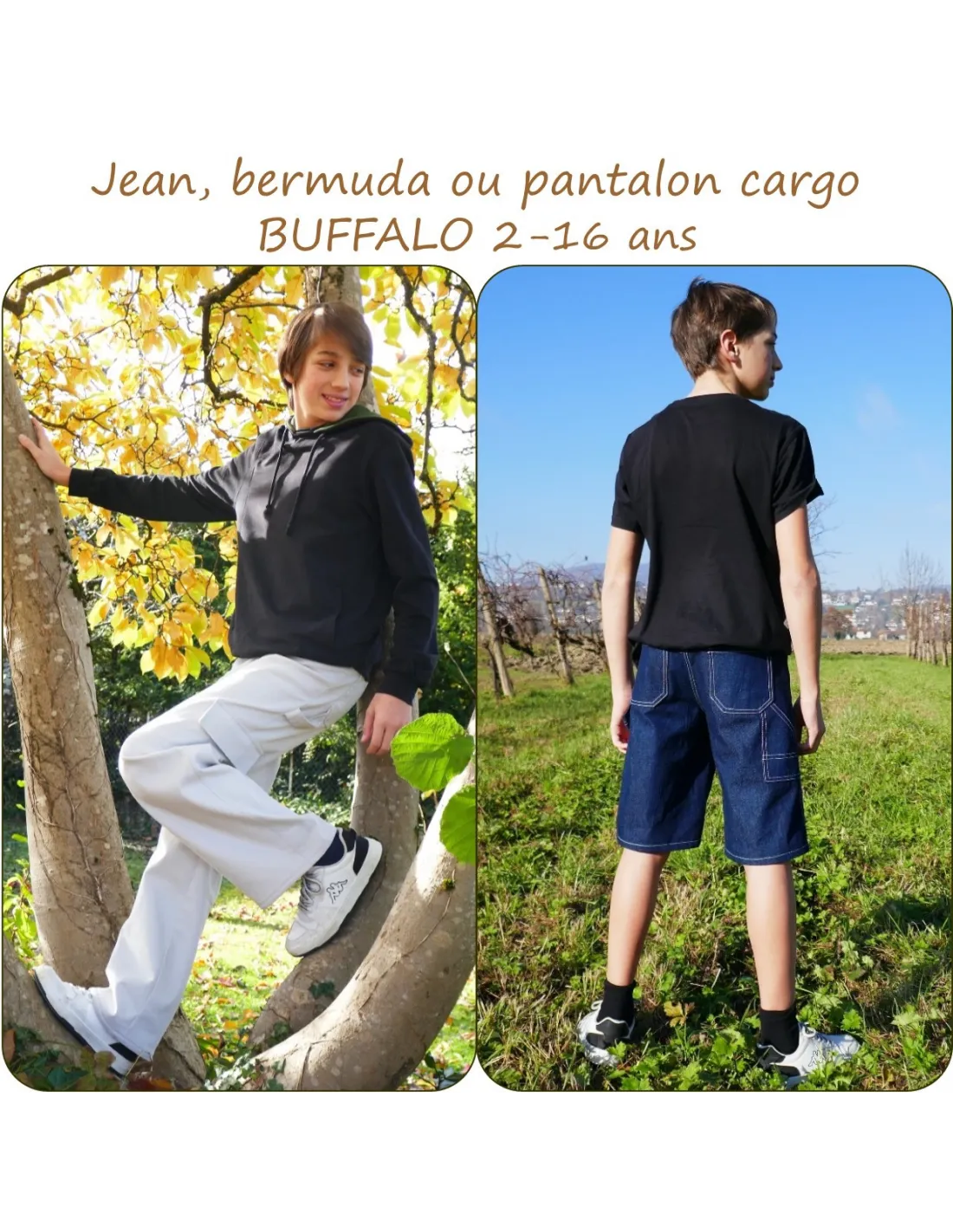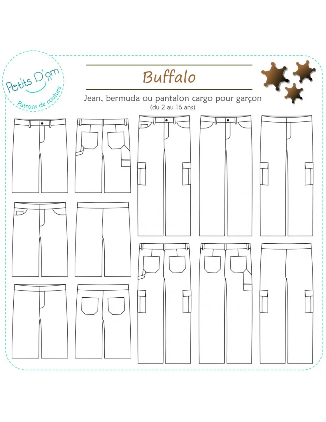 Buffalo est un patron de jean, bermuda ou pantalon cargo pour garçon décliné du 2 au 16 ans.