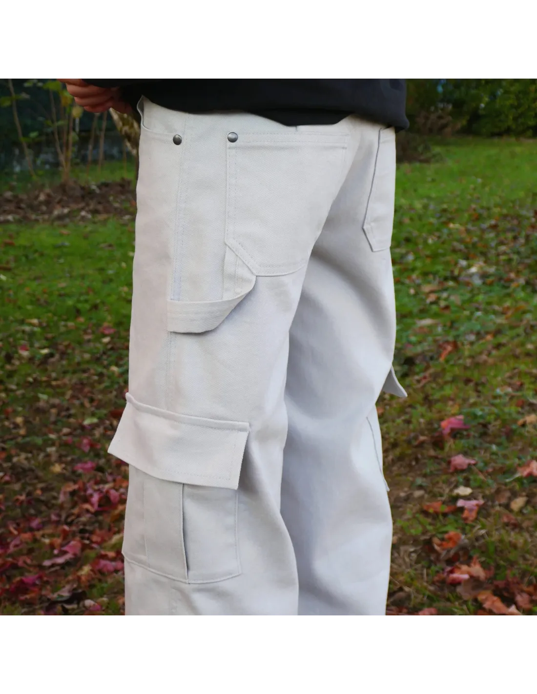 Diverses options de poches sont possibles : poches devant avec option poche gousset, poches plaquées au dos avec options languette et poche à outils, et poches sur les côtés (poches cargo). Les poches cargo ne peuvent pas se coudre sur le bermuda et si vous cousez une poche à outils sur la jambe droite, vous ne pourrez pas y coudre de poche cargo.