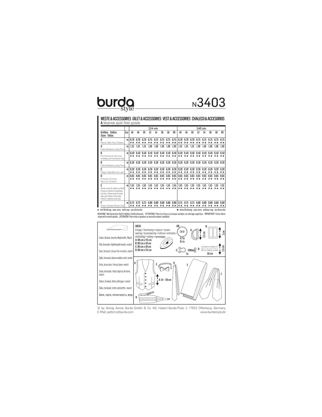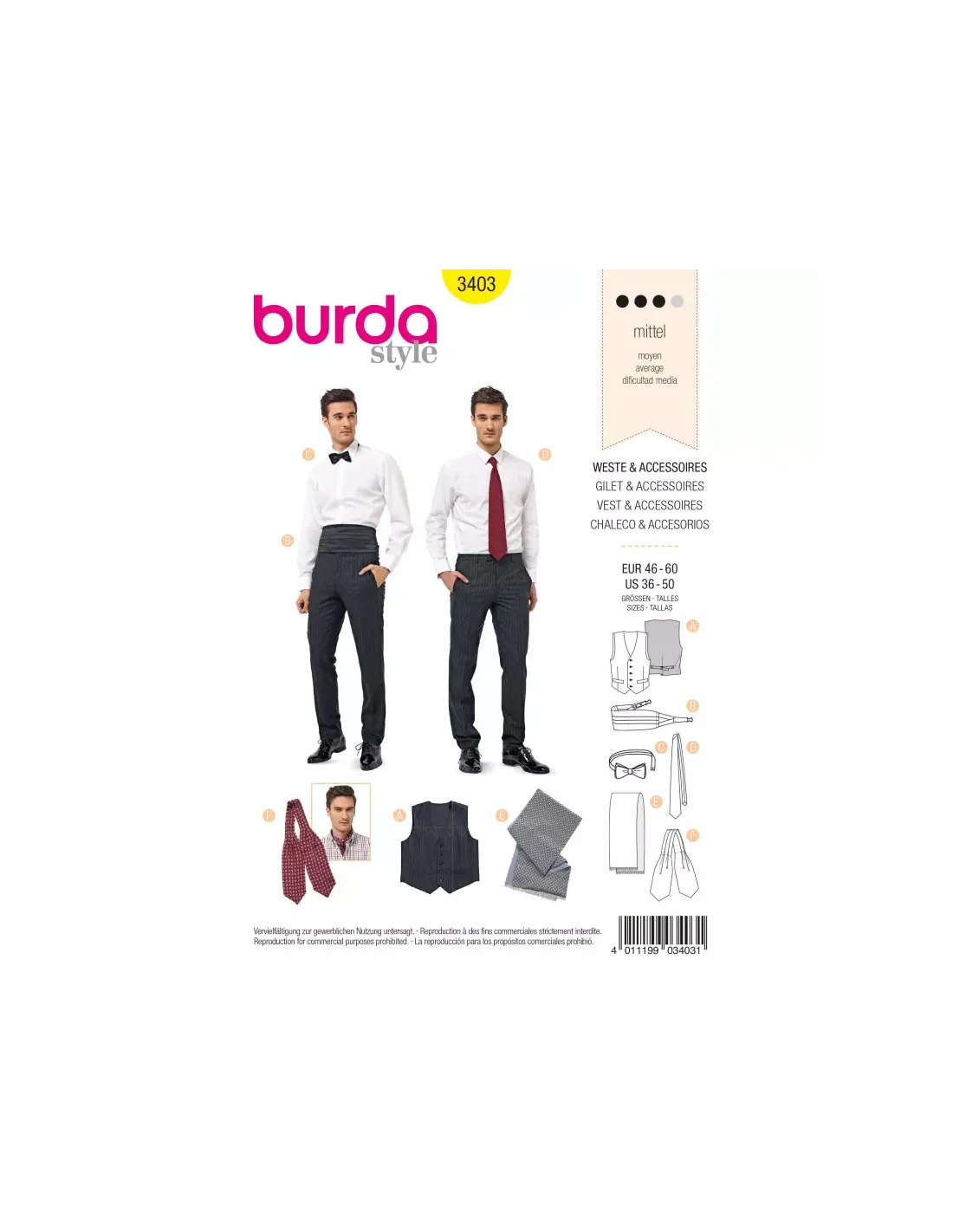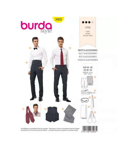 Gilet classique pour homme, aux lignes près du corps, avec poches à patte, dos en doublure et pattes dos. Il est assorti d’accessoires pour chaque occasion: ceinture de smocking, nœud papillon, cravate et deux sortes d’écharpe.Modèle Burda réalisé dans l'émission TV Cousu Main saison2Tissus conseillés: soie, brocart, lainage léger, étoffe moiréeNiveau couture: moyenTailles homme 46 à 60Langues incluses: Français, Deutsch, English, Español, Nederlands, Italiano,Svenska, Dansk, Pусский