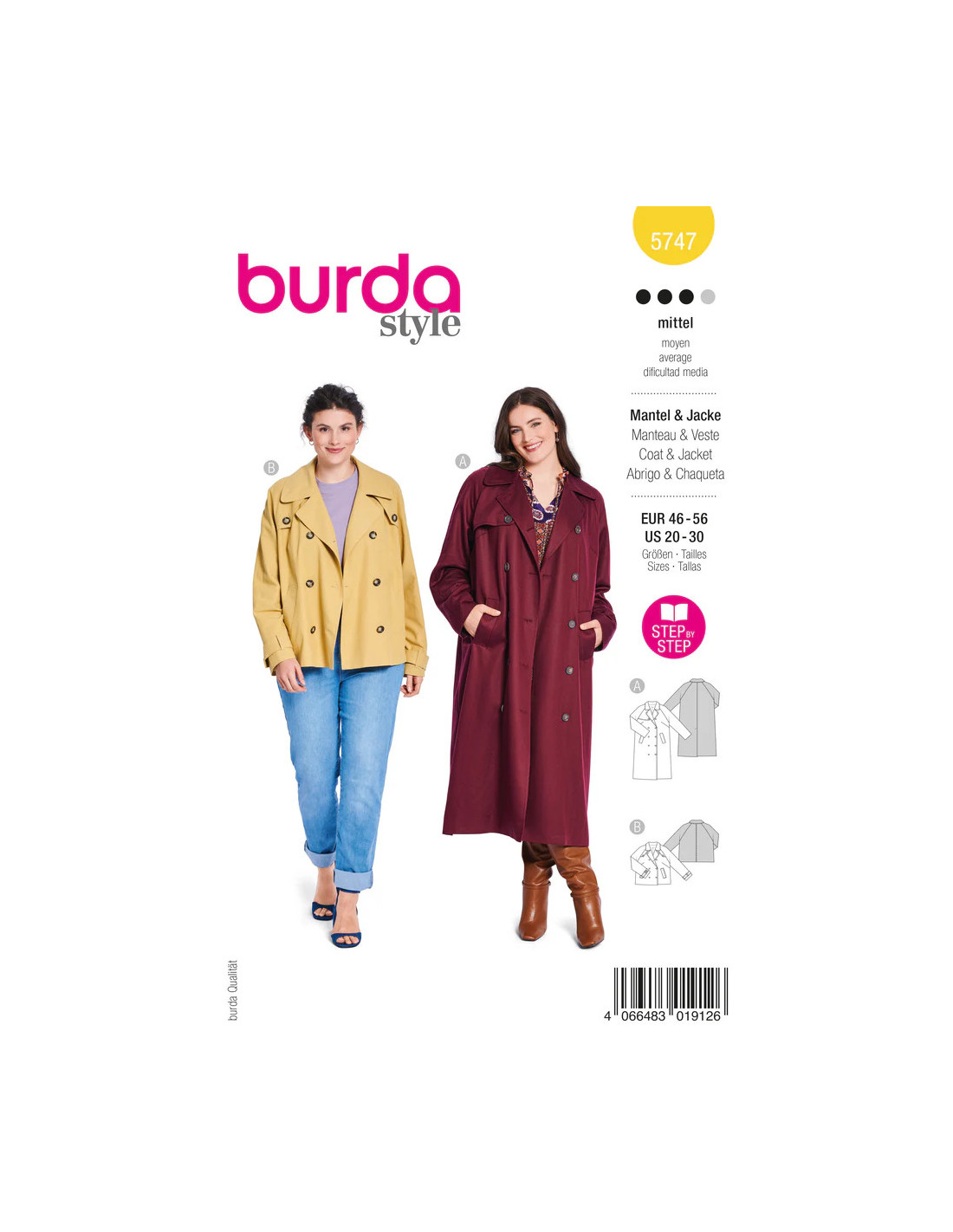Miser sur la tendance de la saison avec ce patron de trench-coat burda curvy ! Les deux variantes apportent un vent frais à ta saison de transition. Le modèle ample avec des manches raglan et des détails typiques tels qu'un col asymétrique, une double fermeture à boutons et de larges poches à rabat est un must-have absolu. La trench-jacket doublée dans un ton sable classique t'accompagne avec élégance à travers les caprices météorologiques changeants du printemps grâce à son grand col et ses passants de manches. Parfait pour les passionnés de couture soucieux de leur style !
