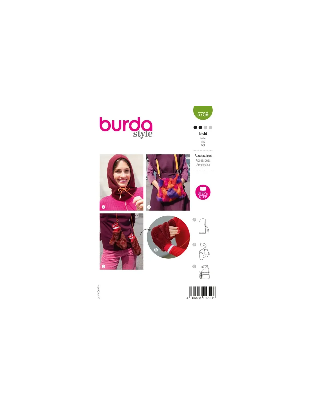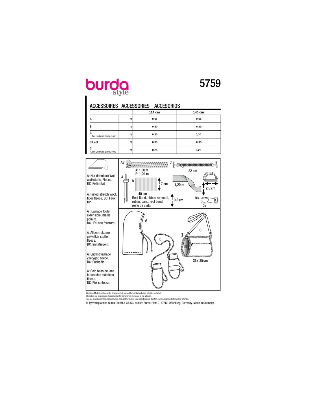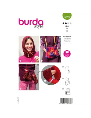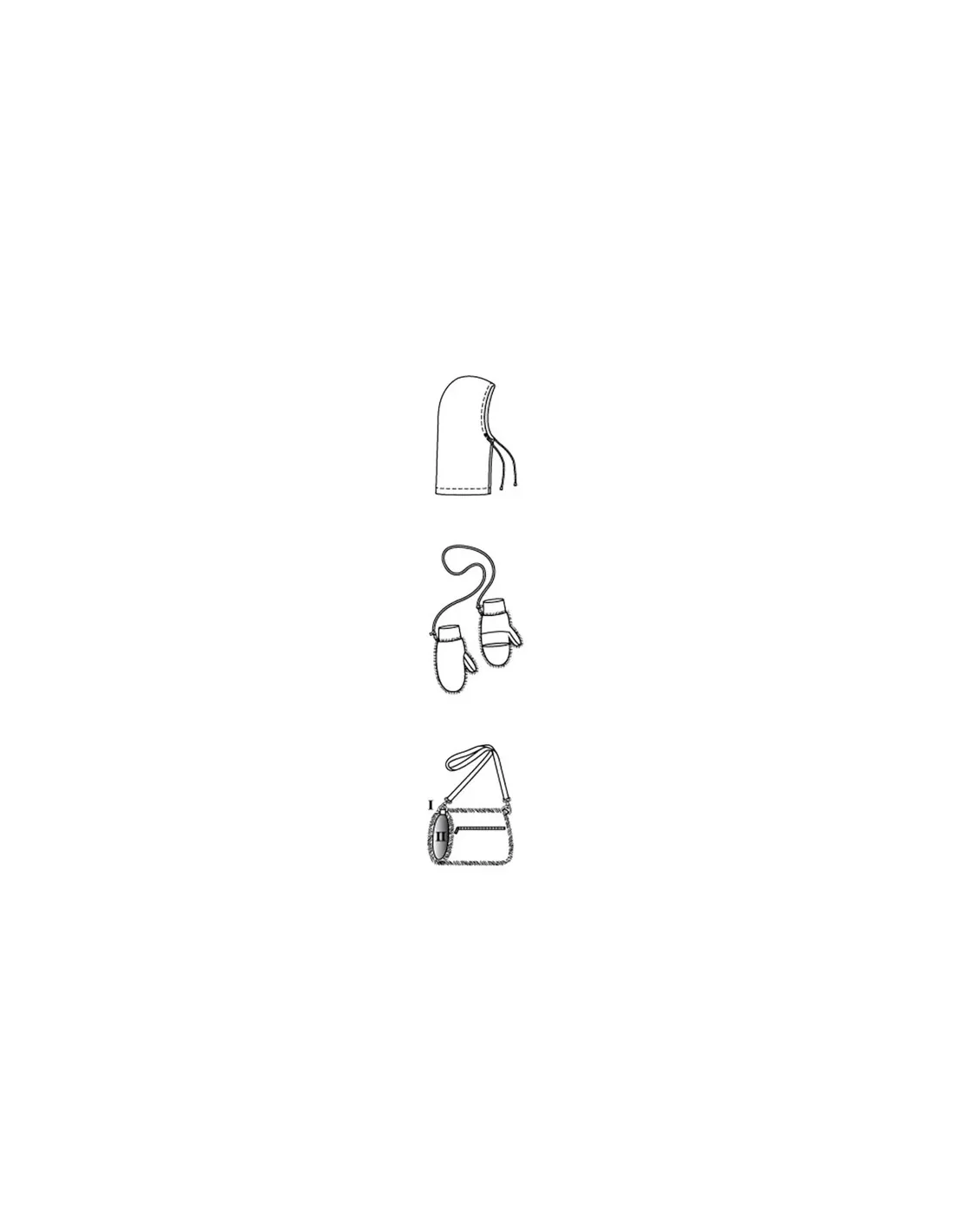 Des accessoires automne/hiver stylés ! Nos patrons sont pratiques et tendance. La balaklava avec des liens colorés, les moufles avec ouverture pour un maximum de liberté de mouvement des doigts et le manchon en fausse fourrure avec poche sont parfaits pour les journées fraîches. Tissus recommandés : fausse fourrure, laine, tissu polaire. Prêt pour une entrée en scène chaude et stylée ! Mercerie: A : cordon : 1,00 m, aiguille jumelée. B : cordon : 1,20 m, bord-côte, largeur 7 cm : 40 cm, reste de ruban, largeur 5 mm. C : fermeture à glissière de 22 cm, ruban, largeur 2,5 cm : 1,20 m, 2 anneaux en D, 2,5 cm. BC : 2 mousquetons.