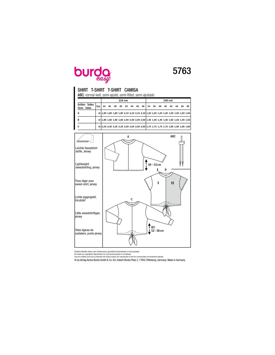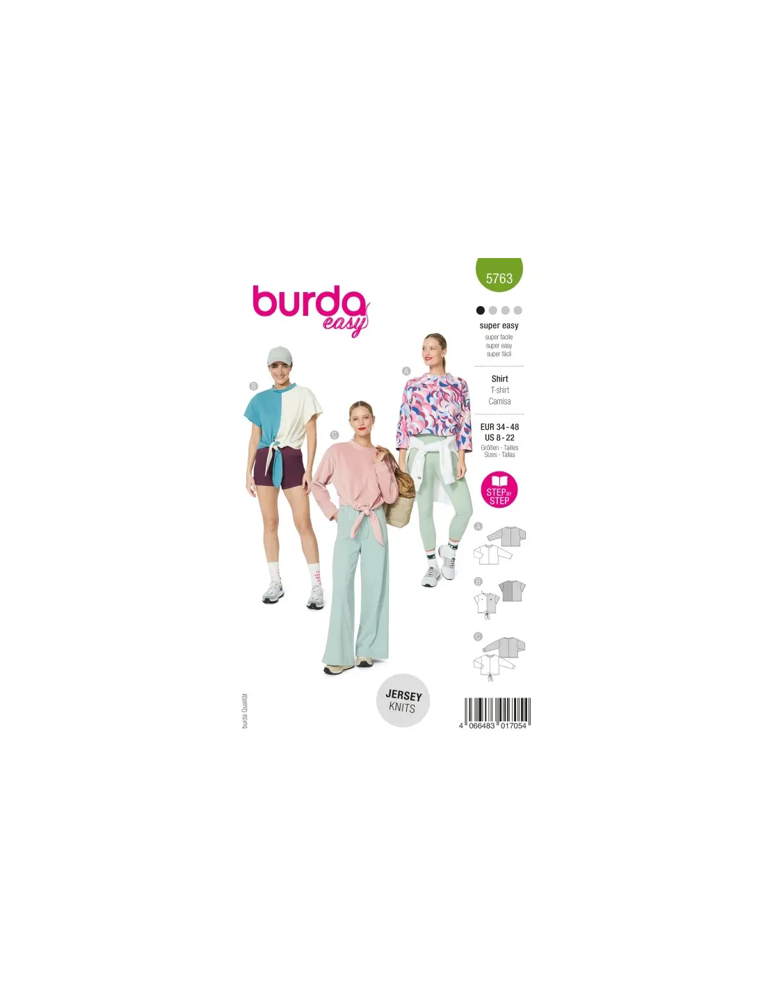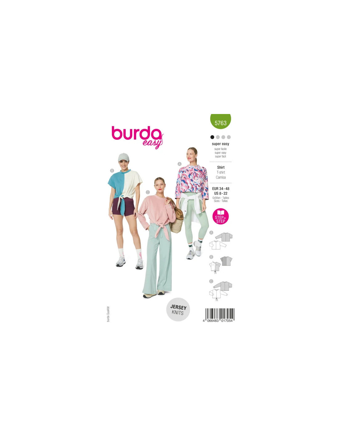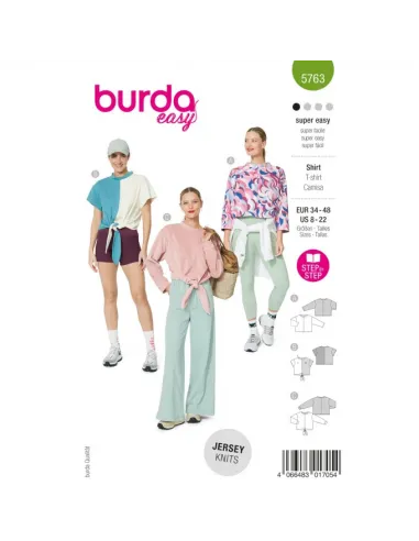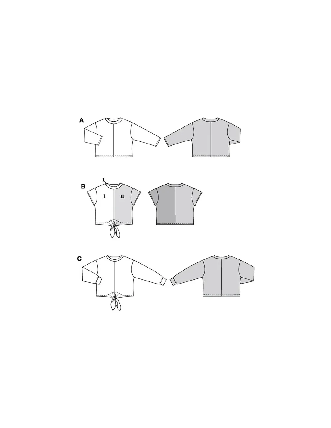 Découvre des patrons polyvalents ! Un t-shirt large et court à la taille en jersey sweat durable avec des épaules décontractées et des manches 3/4. Un t-shirt à nœuds avec un effet color blocking grâce à deux tissus jersey de couleurs différentes. Et un pull raffiné en nicki bio doux avec un détail de nœud amusant à l'ourlet. Tissus recommandés : Tissus légers pour sweat-shirts et jersey. Mercerie: aiguilles jumelées