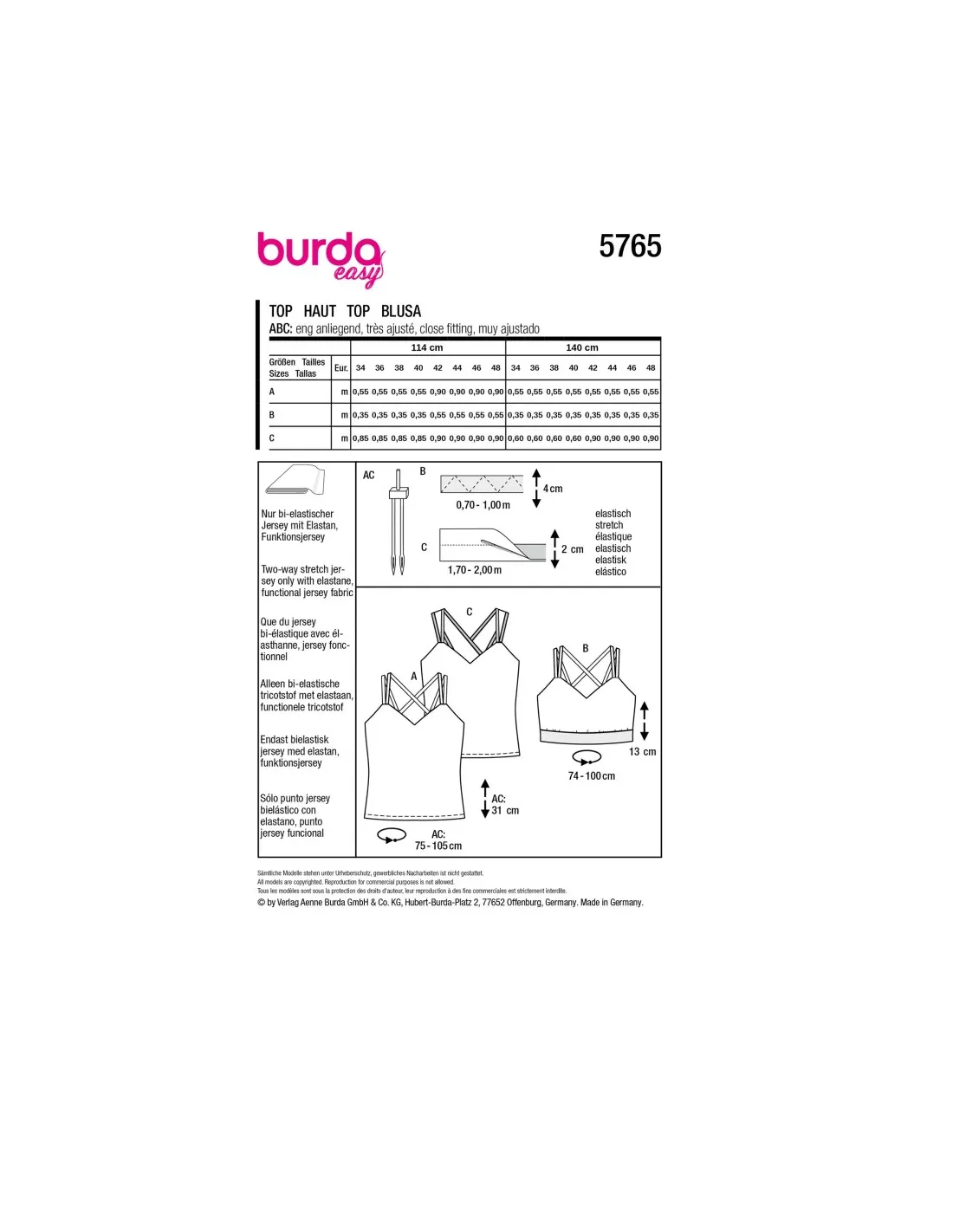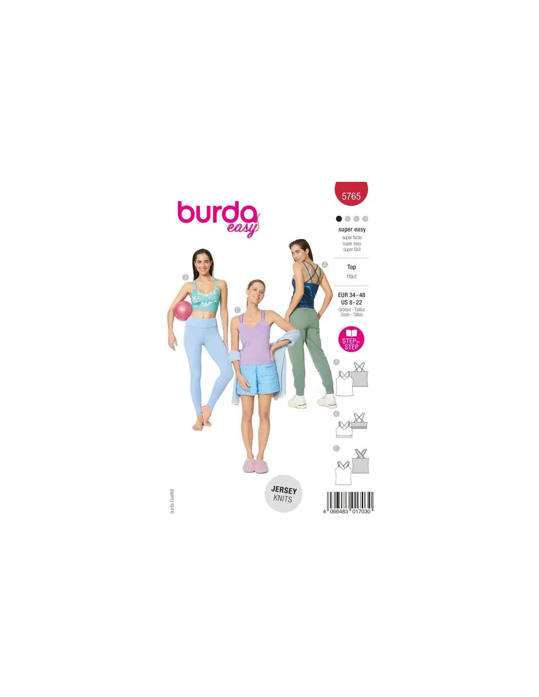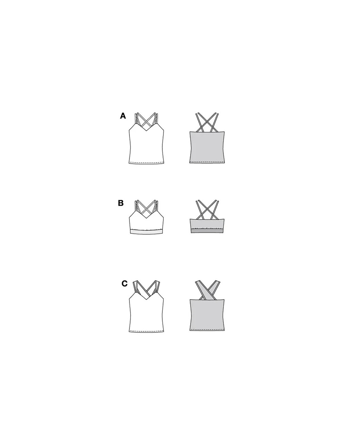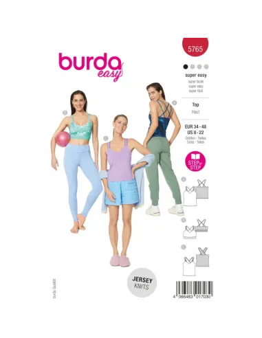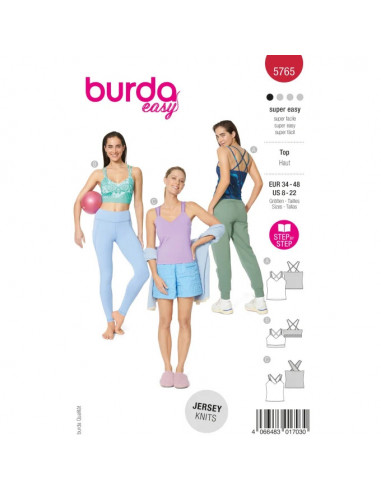 Découvre les tops sportifs ! Du modèle moulant avec un haut à double couture au modèle mignon en jersey fonctionnel, en soutien-gorge ou sans ventre. Combinaison parfaite de style et de confort avec des bretelles croisées. Tissus idéaux : jersey bi-élastique avec élasthanne, jersey fonctionnel et matières élastiques. Mercerie: AC : aiguille jumelée. B : élastique, largeur 4 cm : 0,70 - 1,00 m. C : ganse élastique, largeur 2 cm : 1,70 - 2,00 m.