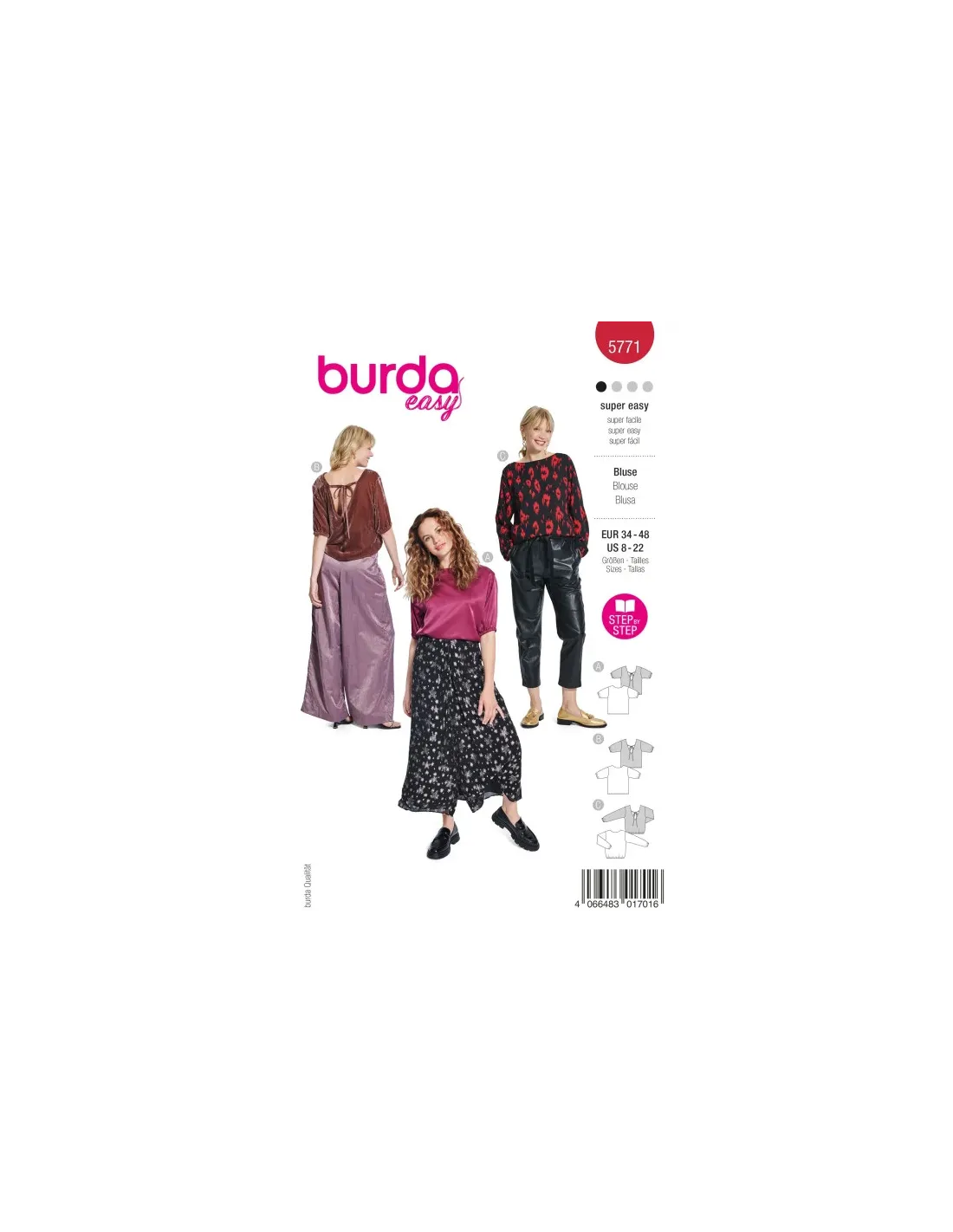 Un patron, trois blouses : une chemise en soie raffinée à la coupe décontractée et à l'ourlet des manches élastiqué est parfaite pour un style de fête. Simple devant, séduisant derrière - grâce à un profond décolleté dans le dos et à un long ruban à nouer en velours. Tu peux aussi choisir le magnifique t-shirt en velours à manches mi-longues et décolleté en V avec un ruban à nouer au dos pour un look tendance. Ou opte pour le chemisier mode en viscose à motifs rouges et noirs avec un profond décolleté dans le dos, des manches longues et une bande élastique à la base pour un style cool et décontracté. Tissus recommandés : Satin, panne de velours et viscose. Mercerie: ABC : entoilage thermocollant, élastique, largeur 7 mm AB : 60 - 85 cm. C : 1,40 - 1,80 m, ruban de satin, largeur 2 cm : 1,50 m.