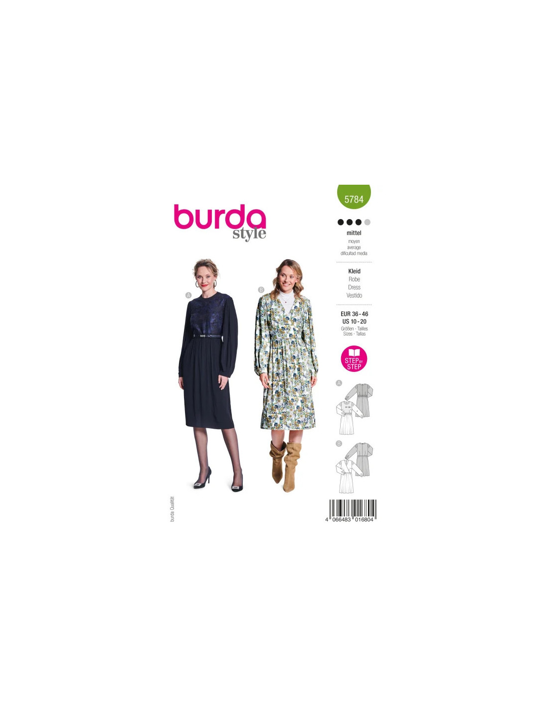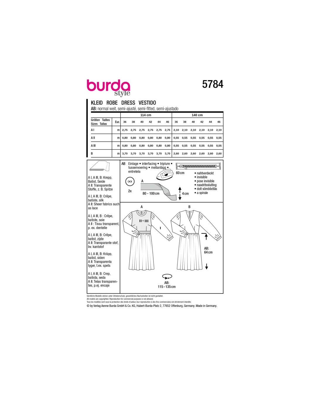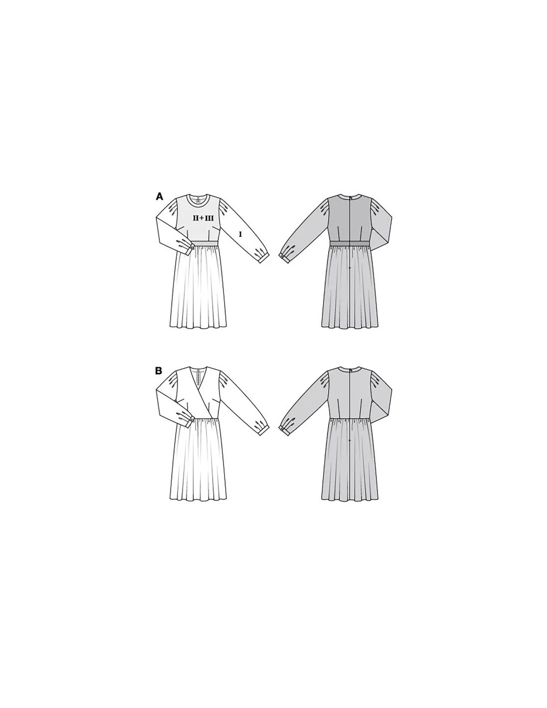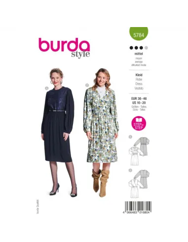 Robe d'inspiration couture avec des manches ultra-volumineuses, de la dentelle doublée dans la partie supérieure et une jupe au tombé doux. La taille est soulignée par un panneau qui agit comme une ceinture. Une robe tendance avec un effet cache-cœur dans le haut, des manches soulignées avec des plis qui donnent du volume en haut et des manchettes classiques en bas. Tissu conseillé : AI et AIII : crêpe, batiste, soie. AII : tissus transparents comme la dentelle. Mercerie: AB : entoilage thermocollant, fermeture à glissière invisible de 60 cm, 2 boutons. A : ruban de reps, largeur 4 cm : 80 - 100 cm.