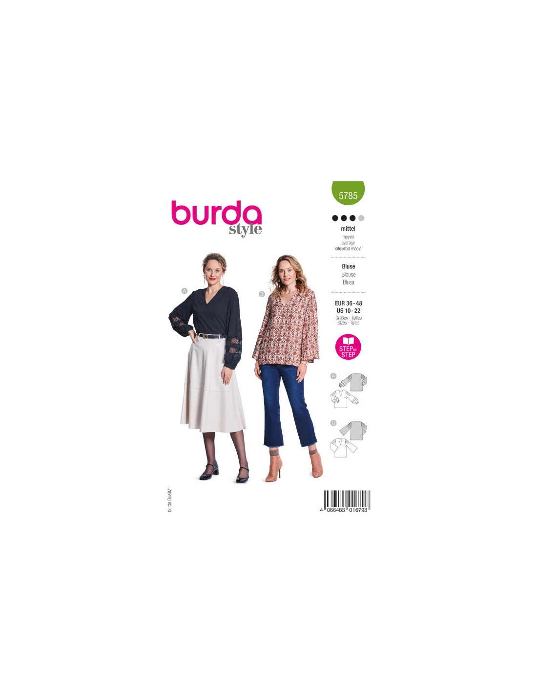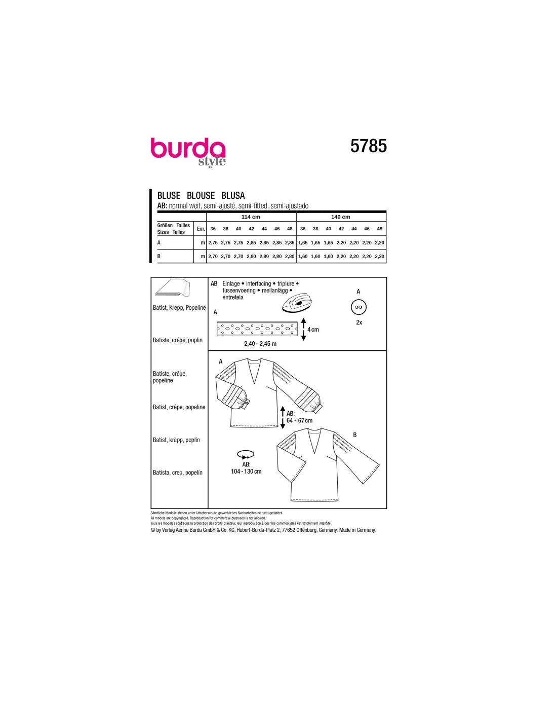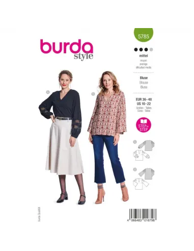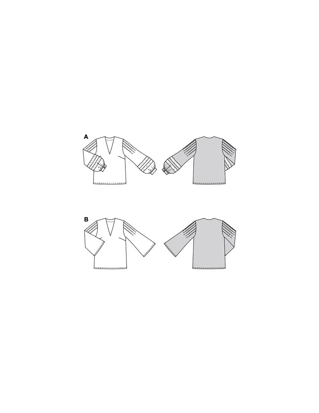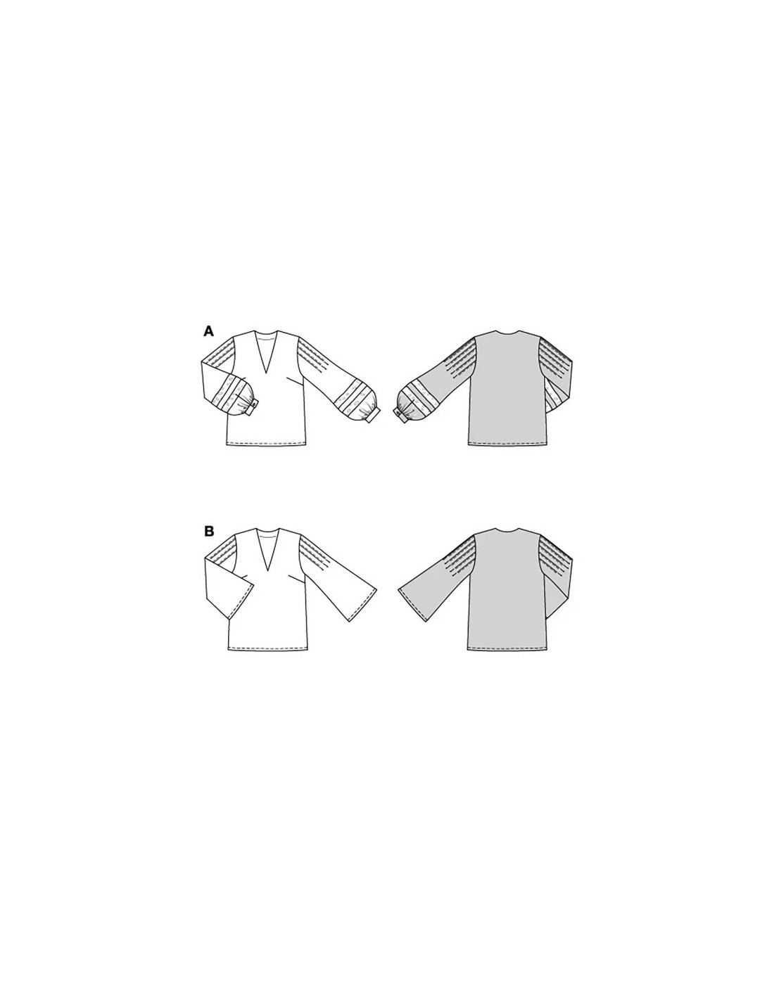 Blouse d'inspiration couture avec des manches étroites soulignées par des nervures, qui sont dramatiquement évasées vers le bas. Différentes options comme les bandes de dentelle ou l'organza peuvent être utilisées pour les ornements. Le chemisier en viscose est léger comme une plume et possède une encolure en V profonde. Pour réduire l'ampleur de l'encolure, on peut porter un top sans manches ou un top à bretelles en dessous. Tissu conseillé : batiste, crêpe, popeline. Mercerie: AB : entoilage thermocollant. A : 2 boutons, ruban de dentelle, largeur 4 cm : 2,40 - 2,45 m.