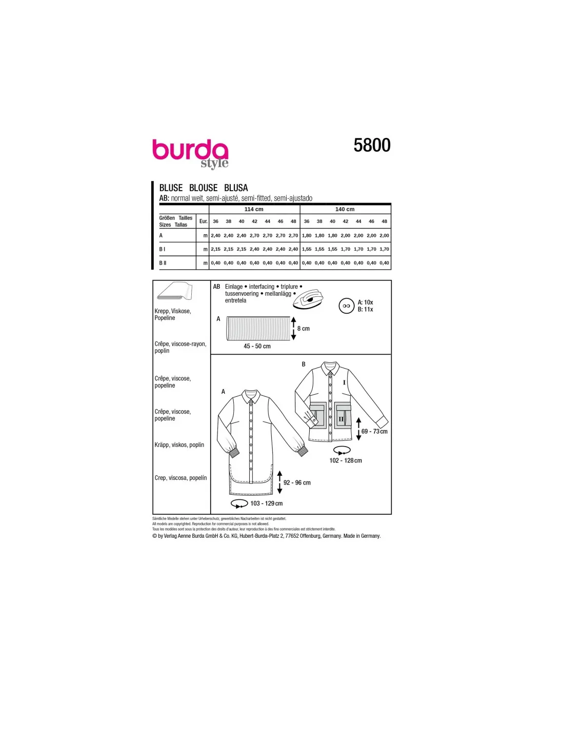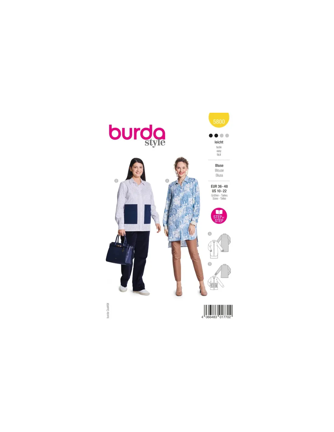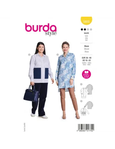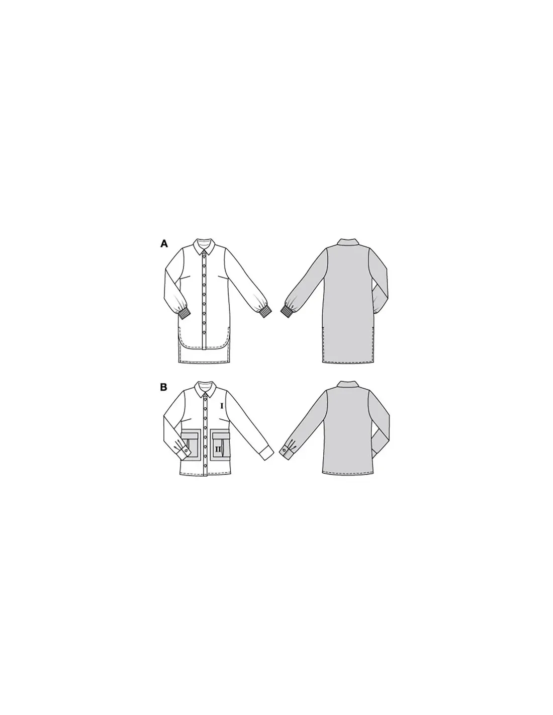 Découvre la diversité de ce patron ! Notre patron de chemisier pour femme offre deux styles en un : la tunique à l'imprimé romantique et aux poignets sportifs en maille est un must absolu pour toute garde-robe. Ou opte pour la chemise à rayures d'inspiration marine avec de très grandes poches cargo - un twist créatif pour ton look ! Idéal pour le crêpe, la viscose ou la popeline. Mercerie: AB : entoilage thermocollant. A : bord-côte, largeur 8 cm : 45 - 50 cm, 10 boutons. B : 11 boutons.