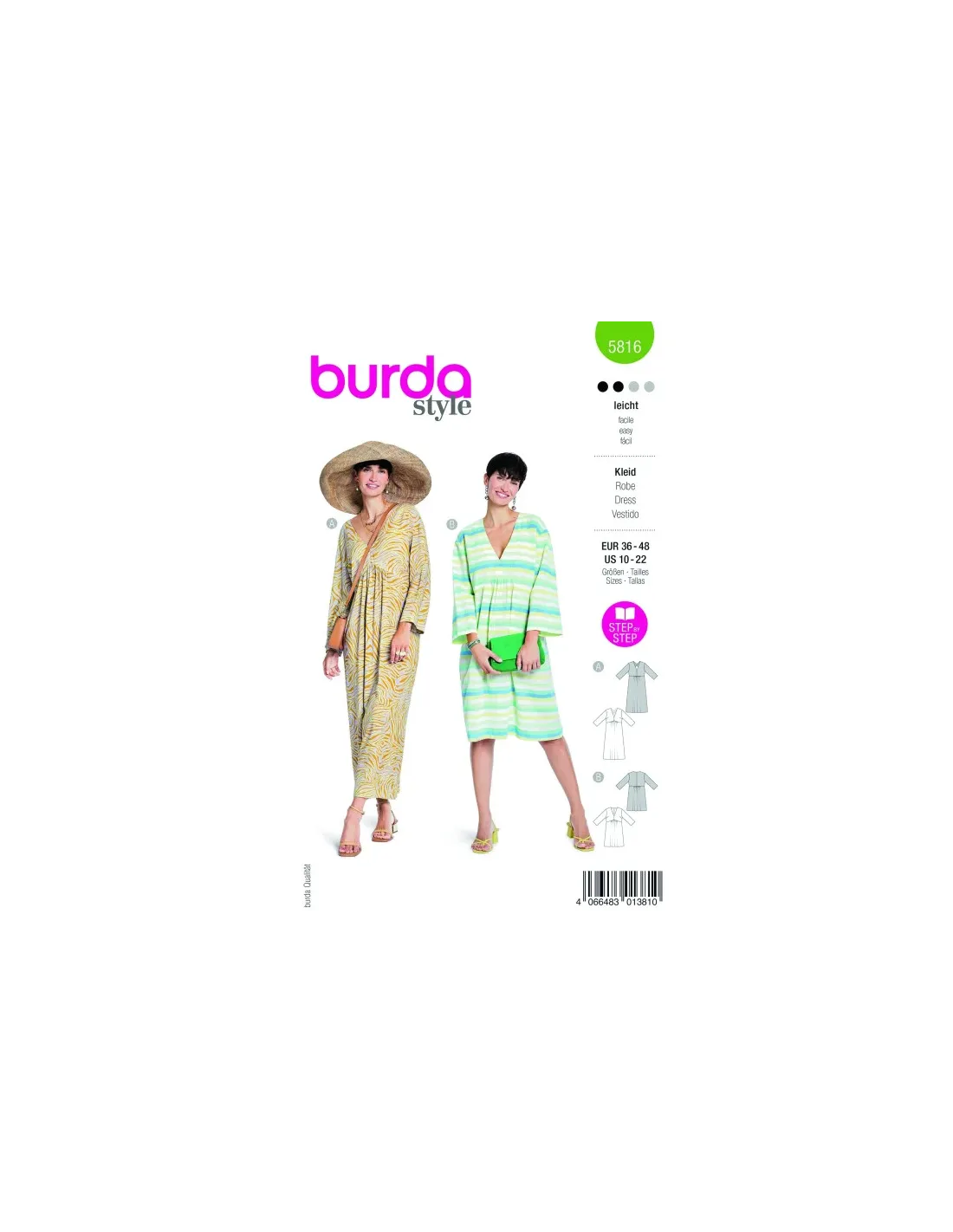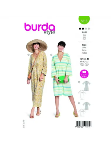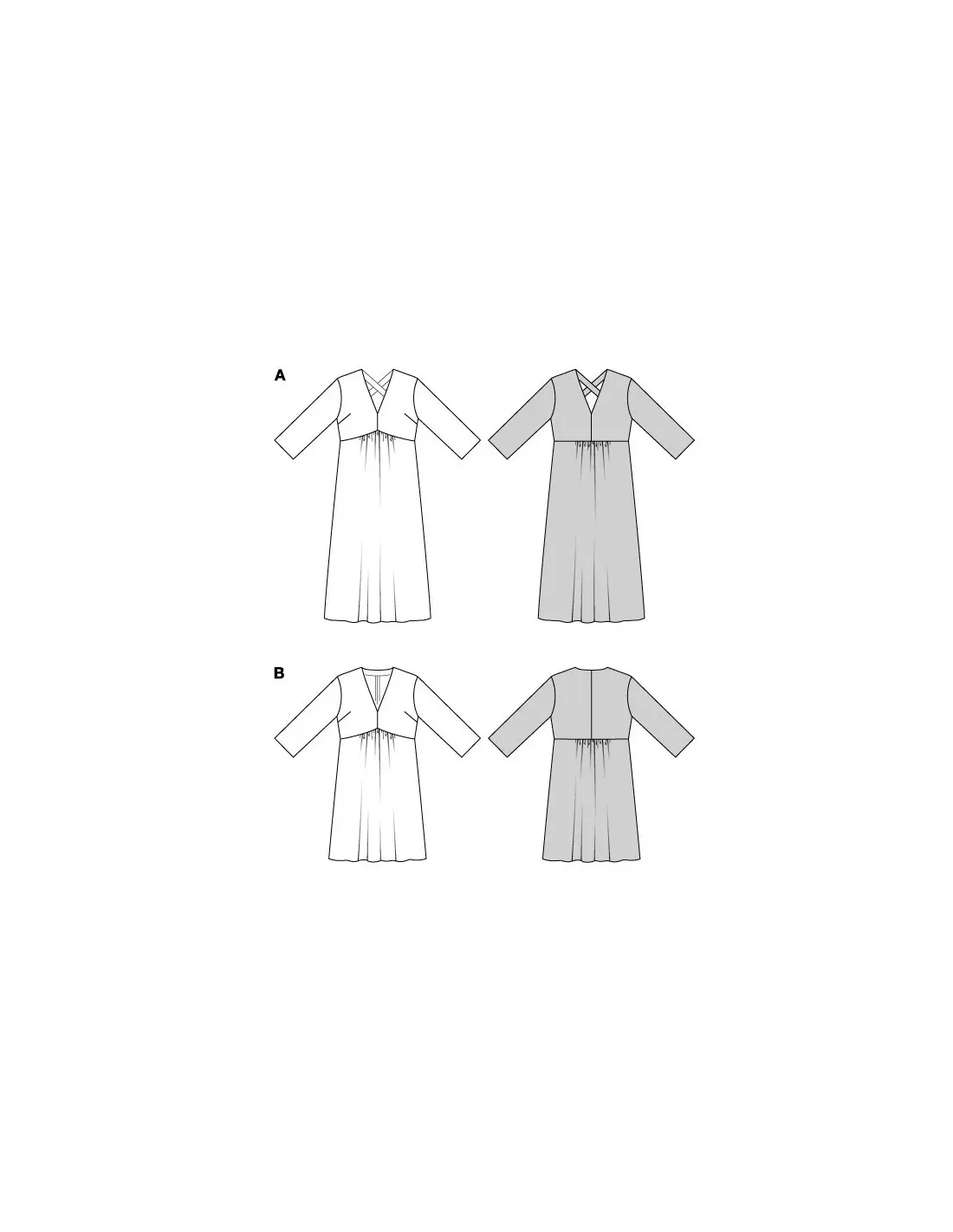 Notre ensemble exclusif de robes d'été t'offre de multiples variantes de coupe. Il comprend une maxi-robe confortable avec une couture empire et des épaules recoupées - parfaite pour des fêtes et des aventures sans fin. Le deuxième patron est une robe d'affaires qui arrive au genou avec un profond décolleté en V, des manches larges et une jupe qui frise. Si tu préfères une robe plus aérée, couds-la en lin. Deux patrons de vêtements élégants dans un seul set - au niveau de difficulté 2 ! Tissus recommandés: Tissus en coton, viscose, lin, crêpe. Mercerie nécessaire: AB : dépôt