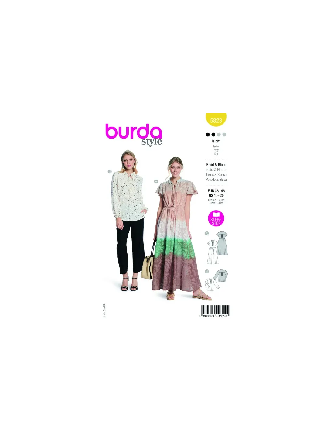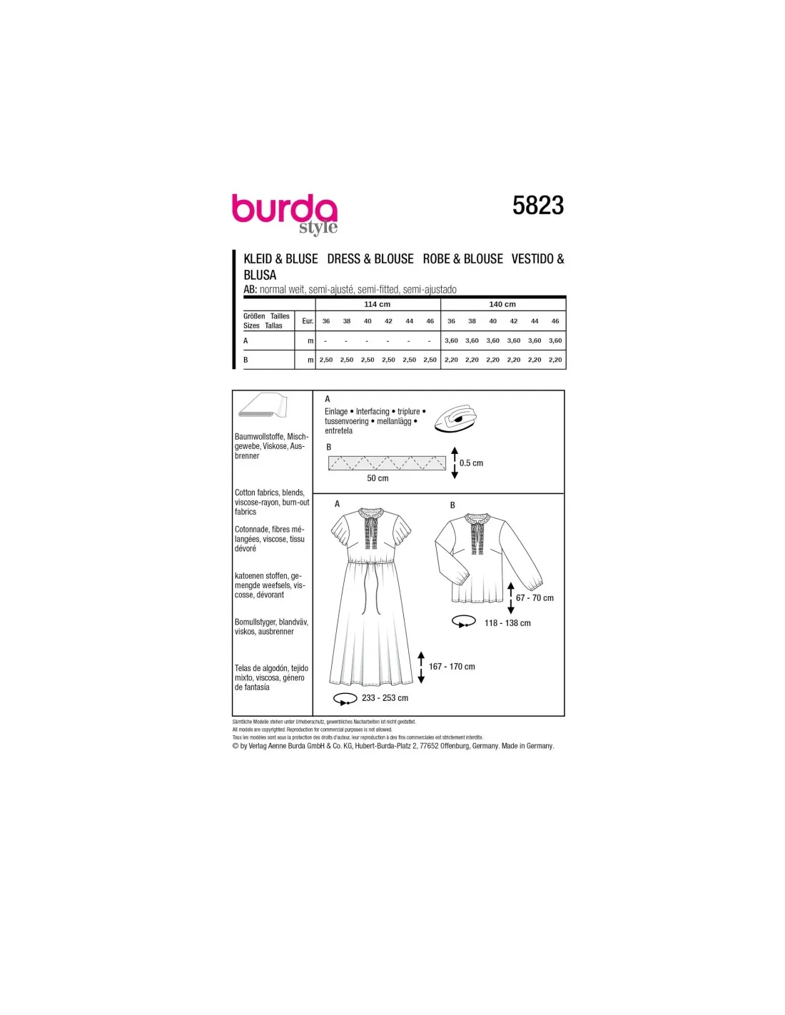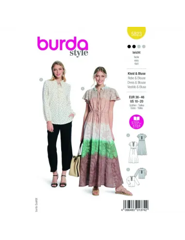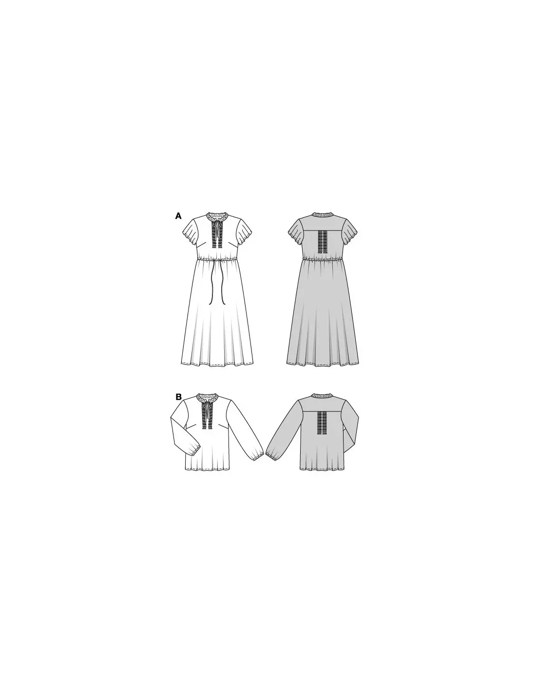 Cette maxi-robe rayonne d'une élégance toute féminine. Elle est flatteuse avec son petit col montant et ses délicates manches papillon et peut également souligner merveilleusement la silhouette grâce au cordon de serrage autour de la taille. Un cordon de serrage permet également de resserrer facilement le col montant de la chemise de style plastron et les petits plis à l'encolure créent un look adorable. Un patron burda style à tomber amoureux ! Tissus recommandés: Tissus en coton, tissus mélangés, viscose, dévorés. Mercerie nécessaire: A : insert, B : caoutchouc 0,5cm