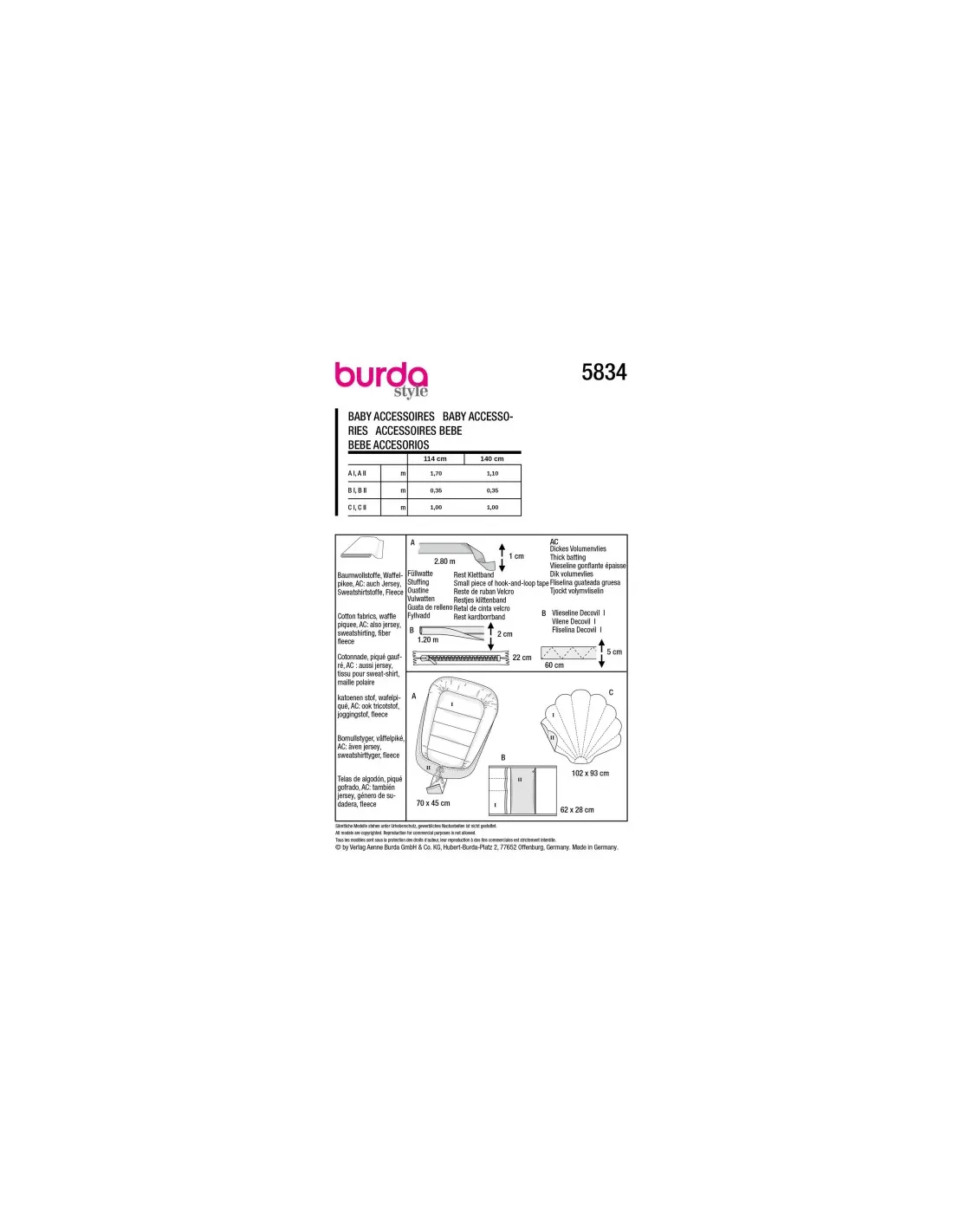 tissu pour sweat-shirt, maille polaireA : ouatine, ruban, largeur 1 cm : 2,80 m, Reste de ruban Velcro. AC : Vlieseline gonflante épaisse. B : ganse pré-pliée, largeur terminée 1 cm : 1,20 m, Vlieseline Decovil I, 1 fermeture à glissière invisible de 22 cm, élastique, largeur 5 cm : 60 cm