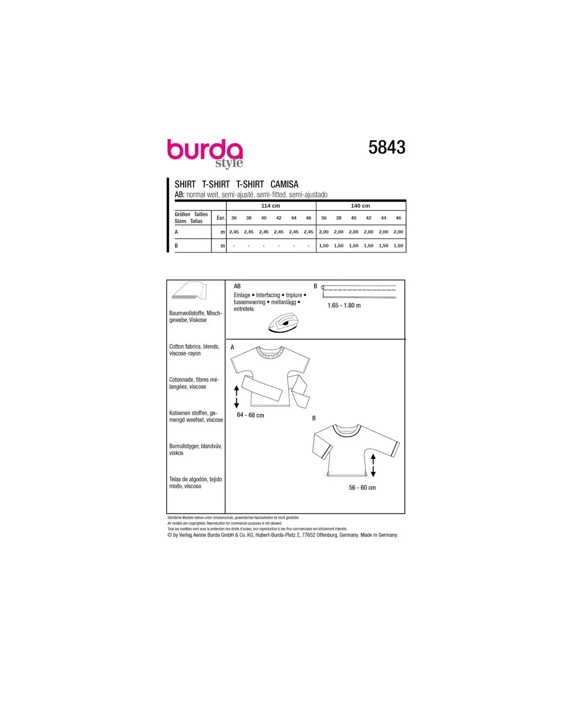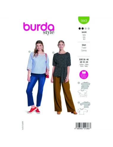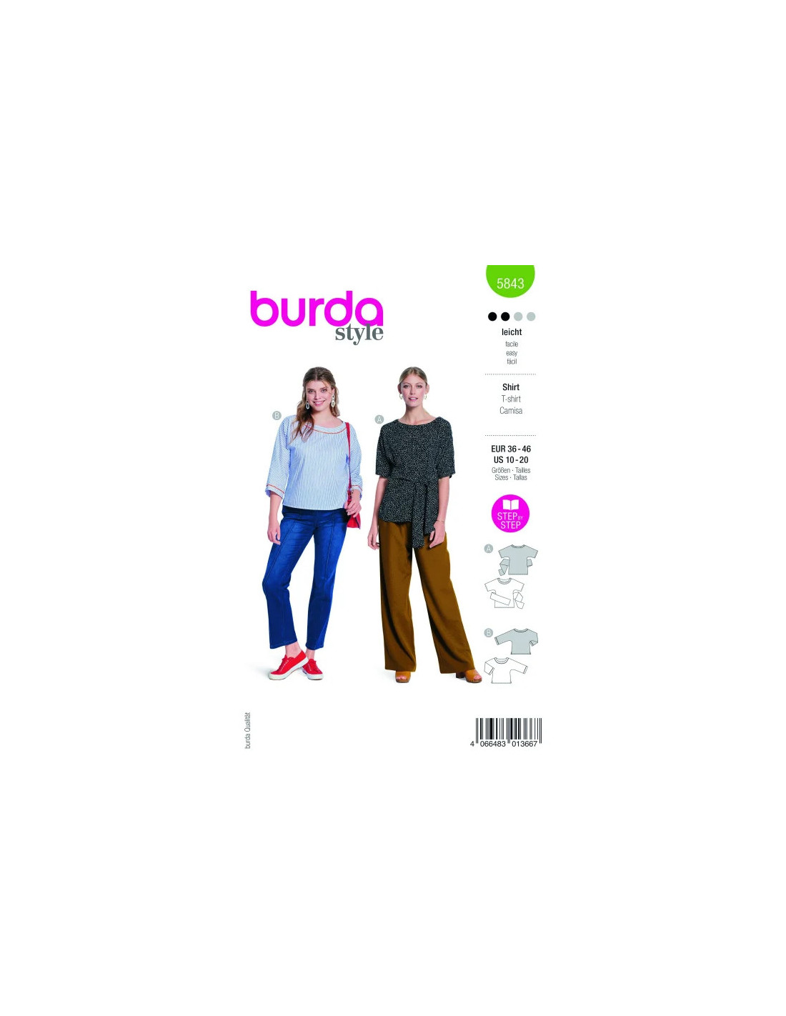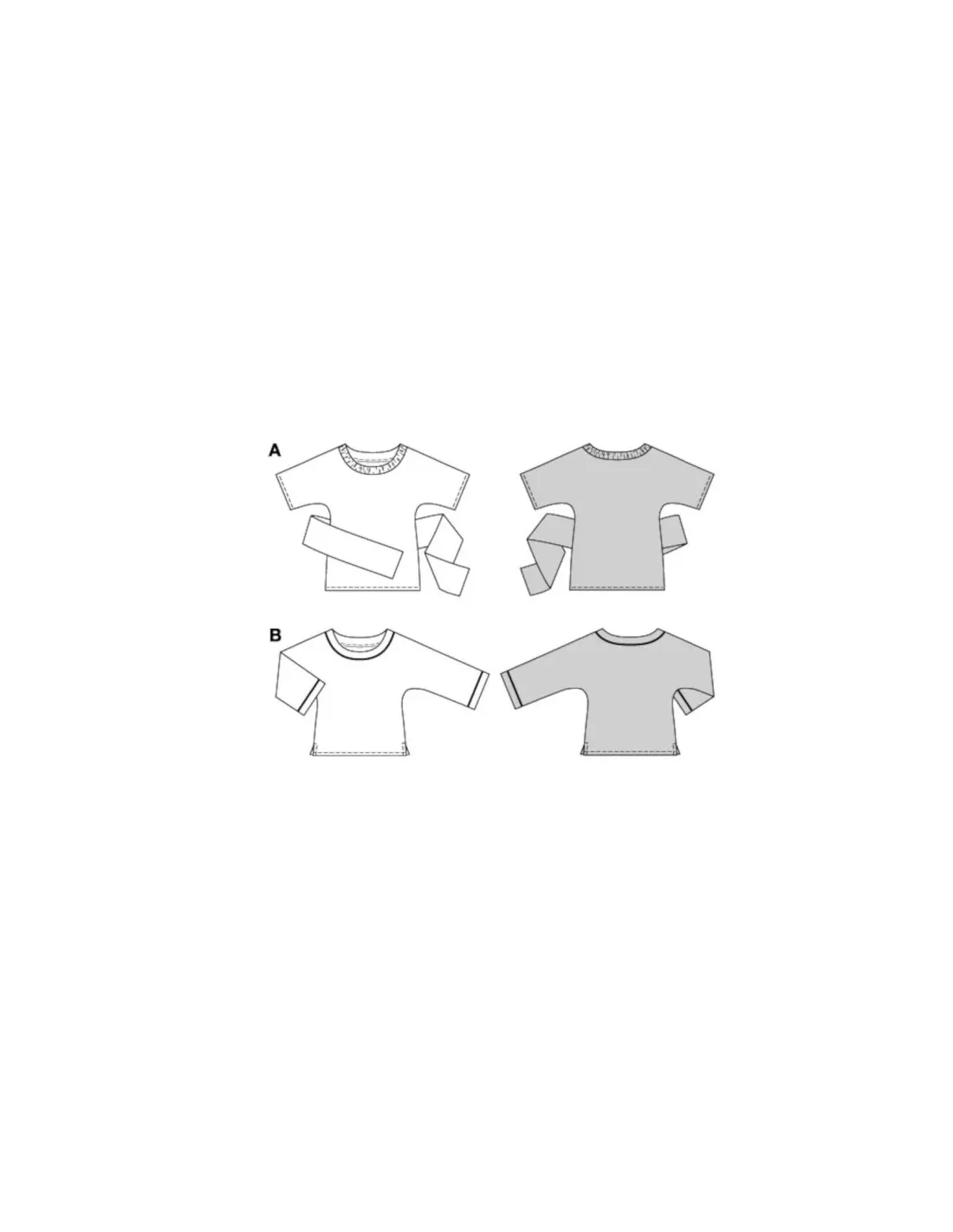 Deux patrons dans un seul set : l'un ludique avec un grand nœud et l'autre droit et simple. Les deux t-shirts convainquent cependant par leur col rond avec des détails particuliers qui font de ces coupes quelque chose de spécial. Les larges liens à nouer pour ajuster la taille du premier modèle et la coupe droite de l'autre t-shirt te permettent de réaliser différentes silhouettes. Tissus recommandés: Tissus en coton, tissus mélangés, viscose. Mercerie nécessaire: A. Insert, B : Insert, passepoil