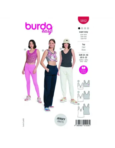 Le sportswear à la conquête de la ville : le top stylé en trois longueurs avec des petites fronces devant fait une bonne performance en gymnastique ainsi que dans la rue. Pour accentuer les bords, on opte pour une ganse de couleur contrastante. N'utiliser que du jersey bi-élastique, jersey fonctionnel1 aiguille jumelée, élastique, largeur 0,7 cm : 15 cm, ganse élastique, largeur 2 cm : 1,85 à 2,20 m