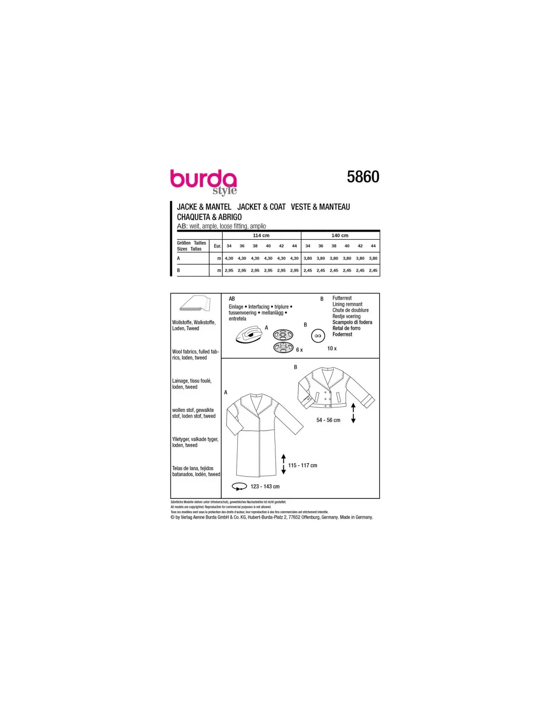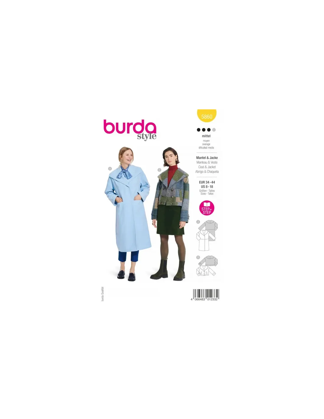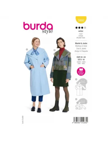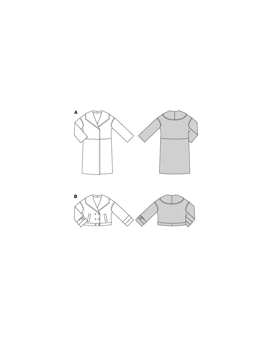 Le manteau et la veste affichent un col châle généreux et se ferment avec deux rangées de boutons. Le manteau A mise sur des poches prises dans les coutures et captive avec sa coupe épurée. La veste B est un peu plus élaborée avec une ceinture et des pattes aux poches et aux manches. Les deux modèles se passent de doublure.Lainage, tissu foulé, loden, tweedAB : entoilage thermocollant. A : 6 boutons-pression à coudre. B : 10 boutons, reste de doublure.