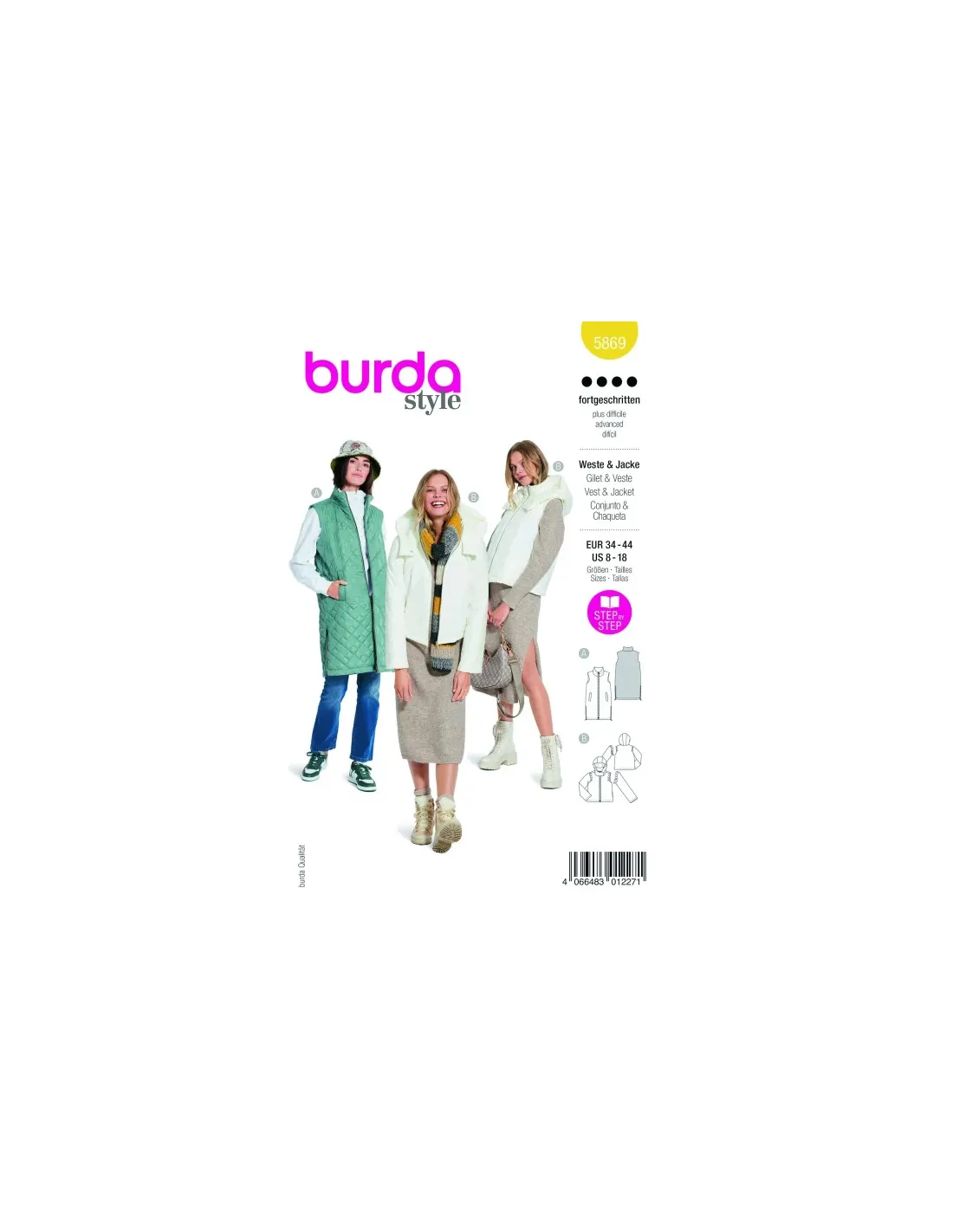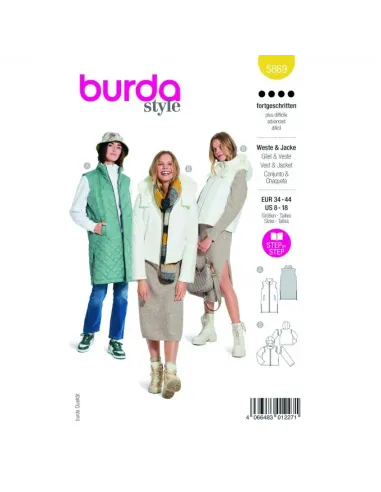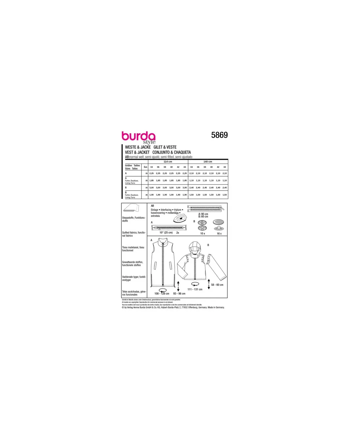 Les longs gilets matelassés sont à la pointe de la mode, notamment avec des poches à pattes, un col droit et des fentes latérales zippées. La veste à col droit et capuche se transforme vite en un gilet sans manches puisqu'il suffit de les déboutonner.Tissu matelassé, tissu fonctionnelAB : entoilage thermocollant. A : 1 fermeture à glissière séparable de 90 cm, 2 fermetures à glissière de 25 cm. B : 1 fermeture à glissière séparable de 60 cm, 10 boutons-pression à coudre, 16 boutons-pression à riveter