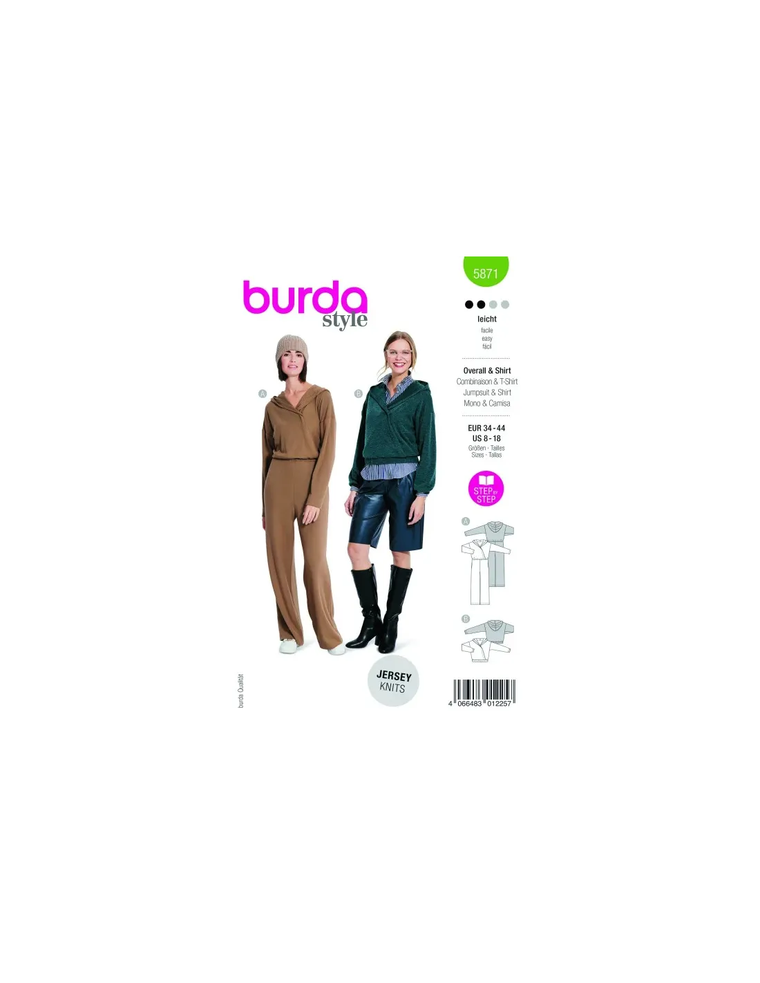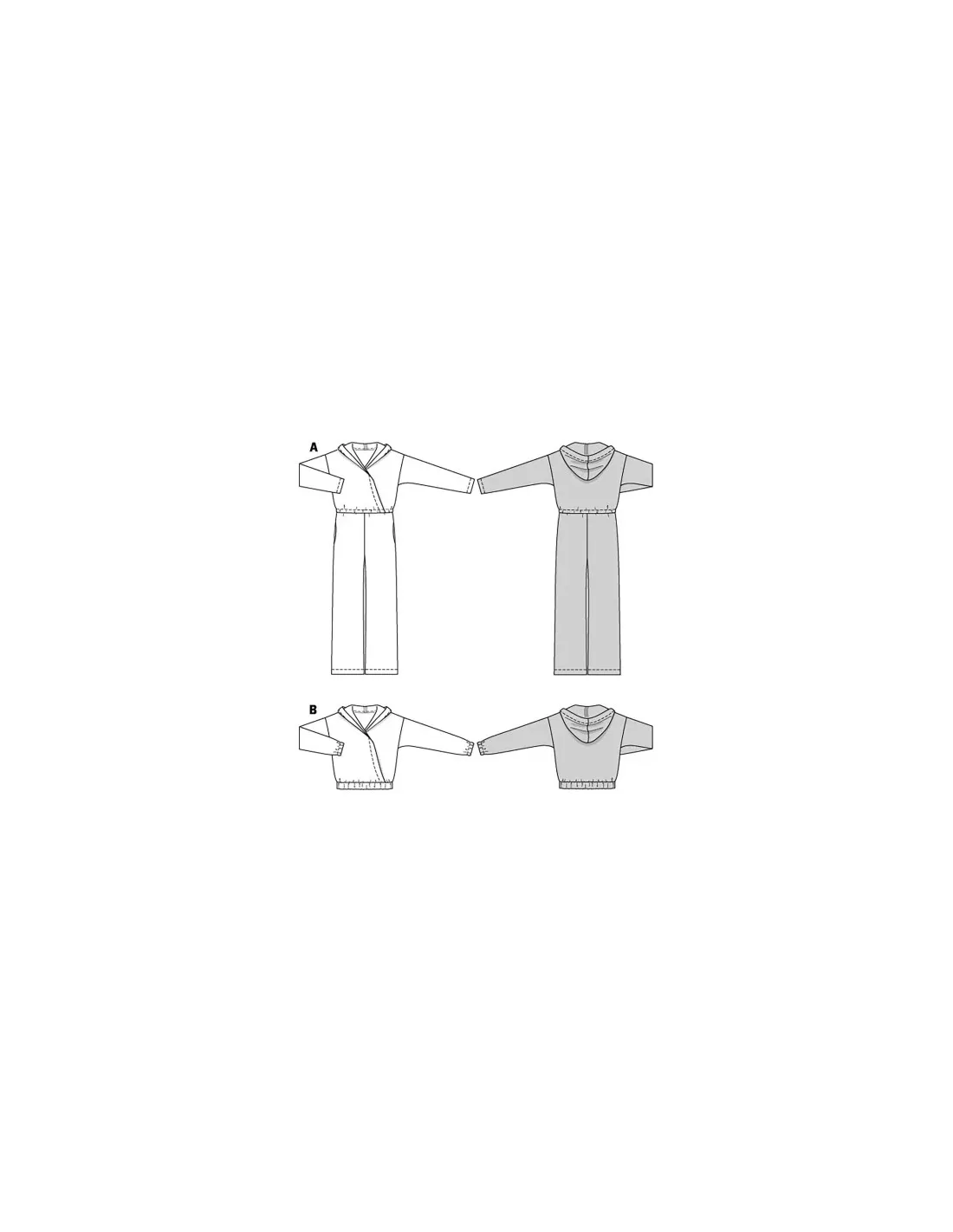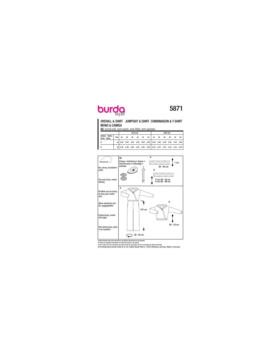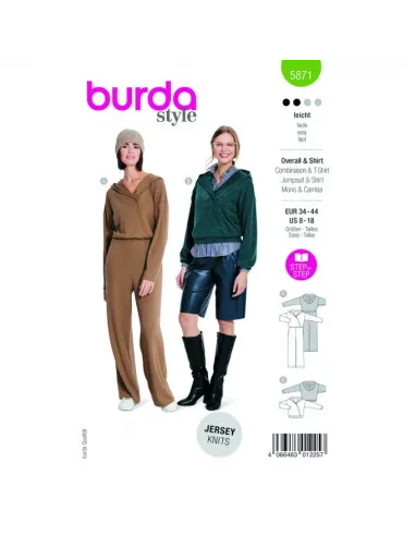 À la base du modèle, le super hoody décontracté B avec effet croisé et coulisse élastiquée. Pour la variante A on ajoute le pantalon avec de larges jambes droites et des poches dans les coutures latérales - la combinaison stylée est déjà prête et peut devenir la pièce favorite.N'utiliser que du jersey, des tissus pour sweat-shirtAB : entoilage thermocollant, 1 aiguille jumelée, 1 petit bouton-pression à coudre. A : élastique, largeur 1 cm : 80 - 95 cm. B : élastique, largeur 2 cm : 50 - 55 cm, élastique, largeur 4 cm : 80 - 90 cm