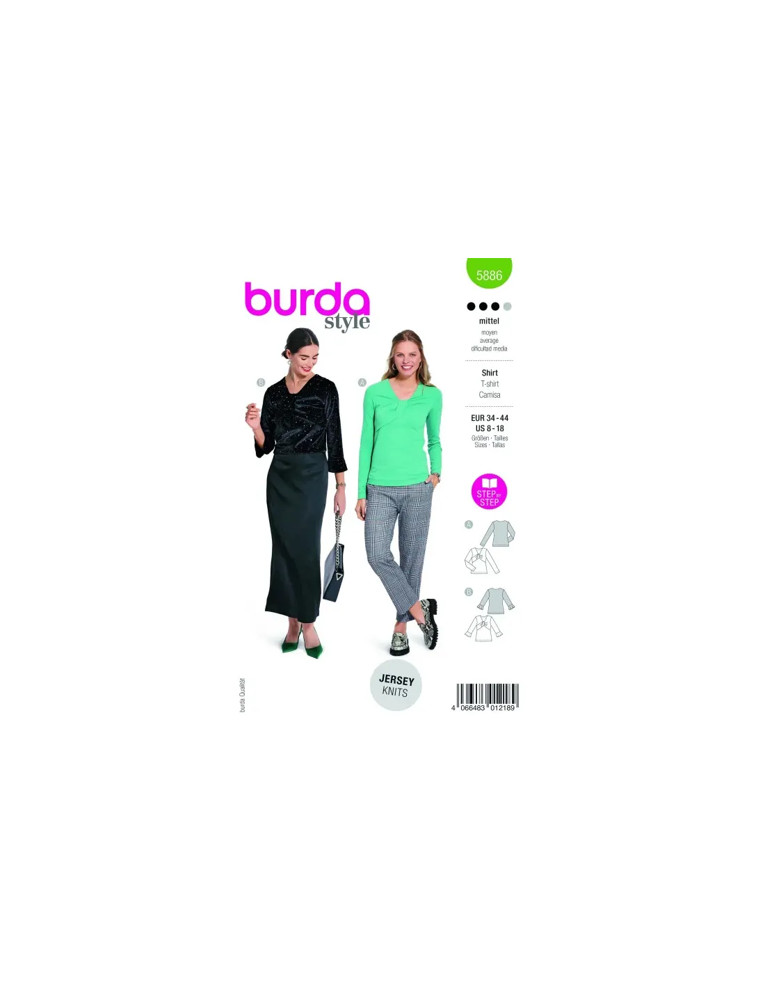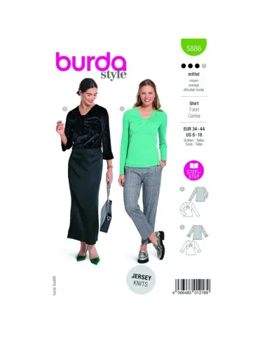 Ces tee-shirts sont uniques, la belle encolure et la coupe asymétrique avec des entrelacements apportent une note originale. Les manches, tantôt étroites et longues ou bien de longueur 3/4 ornées d'un volant, font la différence. N'utiliser que du jersey élastiqueEntoilage thermocollant, 1 aiguille jumelée