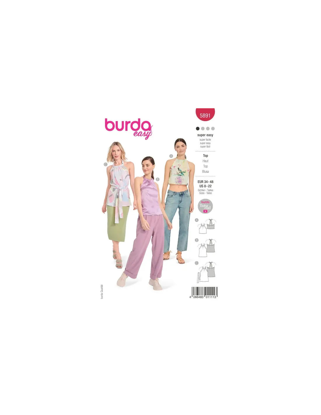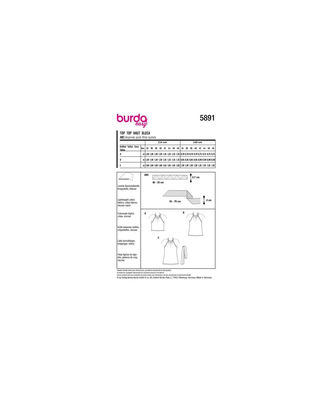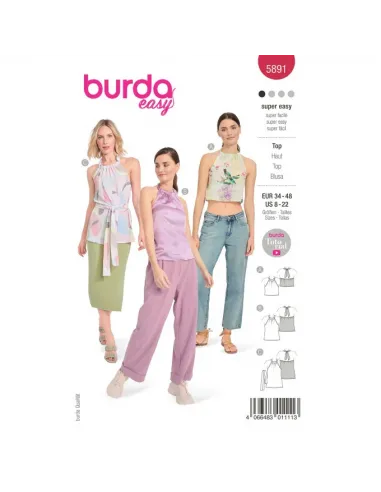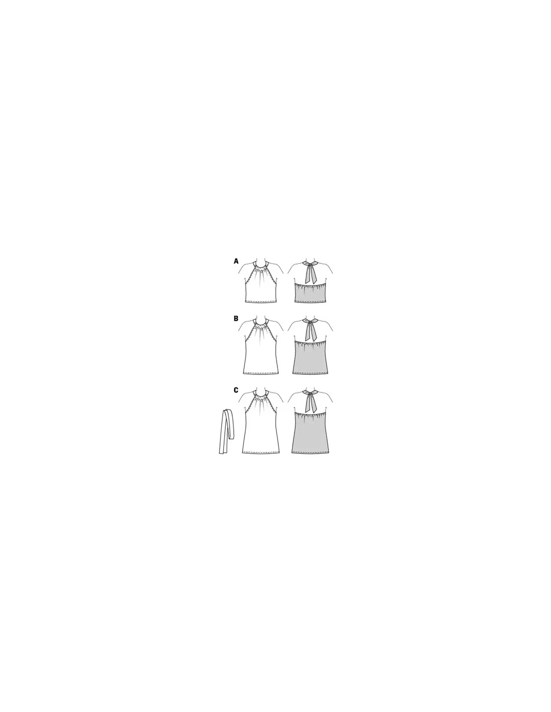 De formidables dos-nus en trois longueurs différentes. A en crop top, B en longueur normale, C rallongé sur les hanches et avec une ceinture à nouer. La coulisse élastiquée dans le dos garantit un bon maintien et le ruban dans le même tissu qui fronce le devant, est noué dans le dos.
