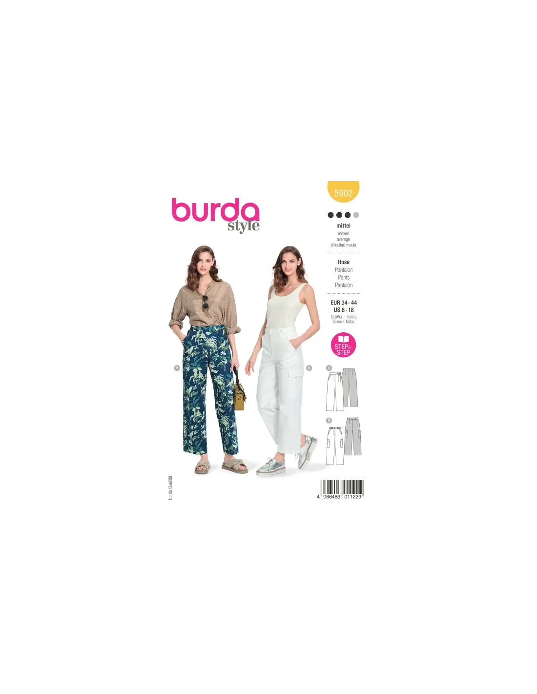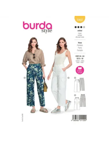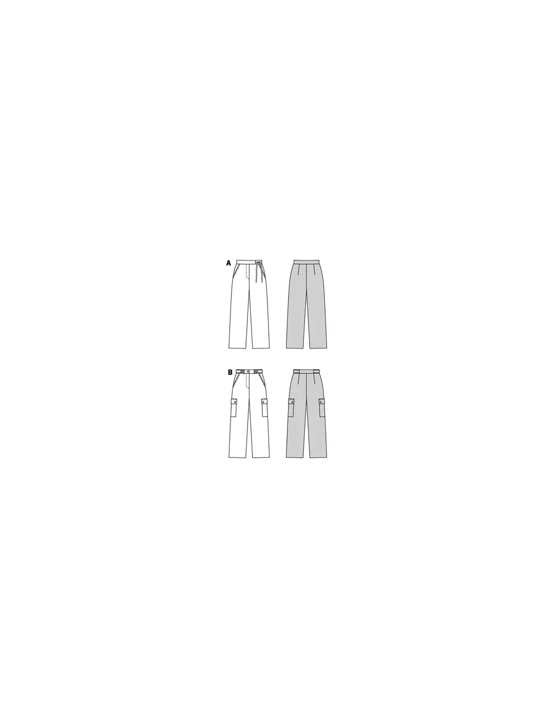 Des pantalons droits avec des poches sur empiècement de hanche, ornés de détails originaux ! La ceinture de la version A se ferme avec des liens à nouer. Pour un look cargo discret, la version B s'attribue des poches plaquées à rabat et des pattes boutonnées à la ceinture.