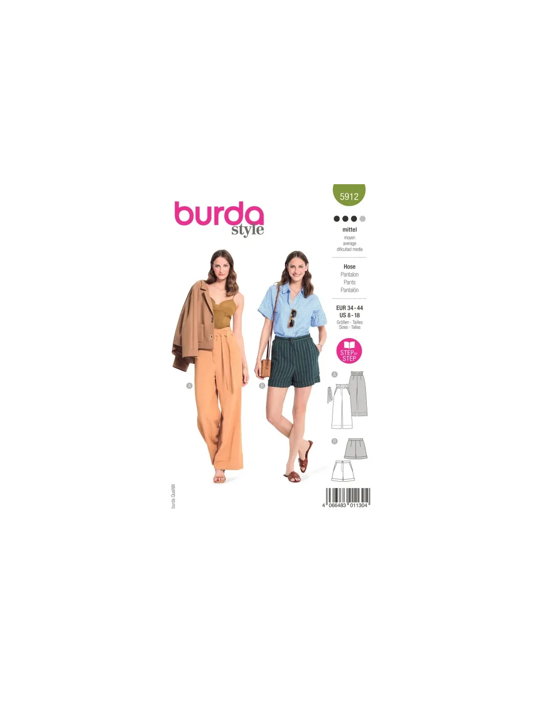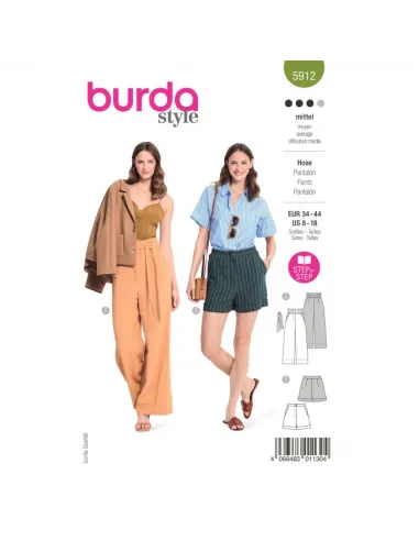 Un pantalon et un short décontractés, avec une fermeture à glissière et des poches sur empiècement de hanche. A dans le style paper bag branché avec une ceinture à nouer à part, des jambes amples et un large ourlet. Le short B a des revers de jambe rapportés et une ceinture classique, fermée par un bouton.