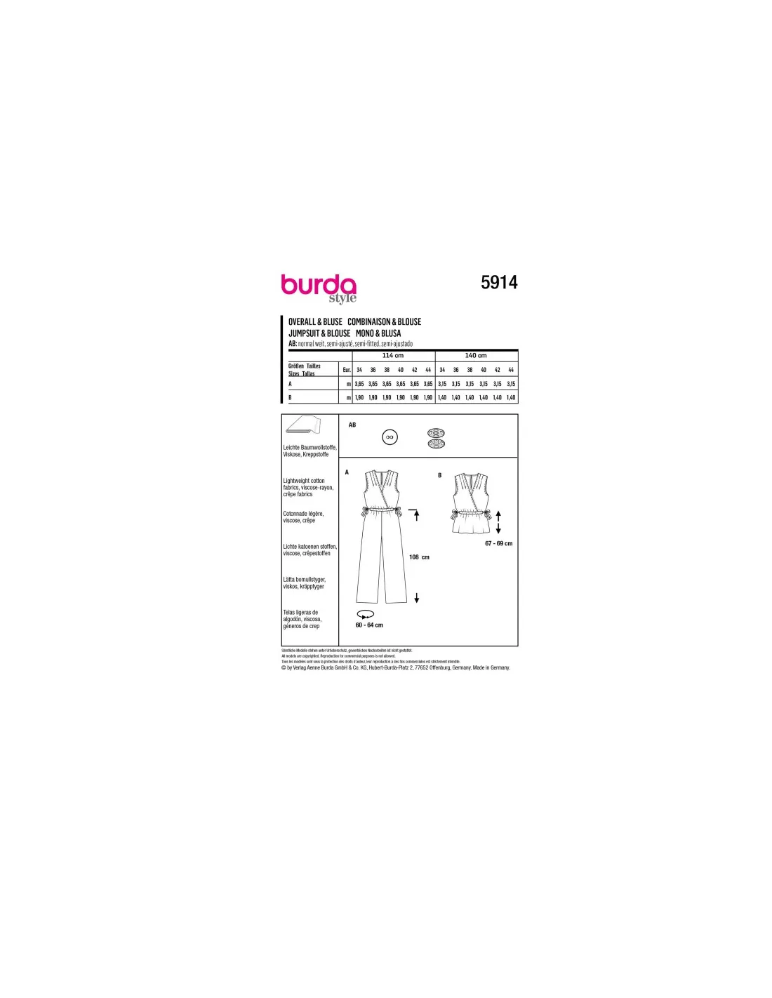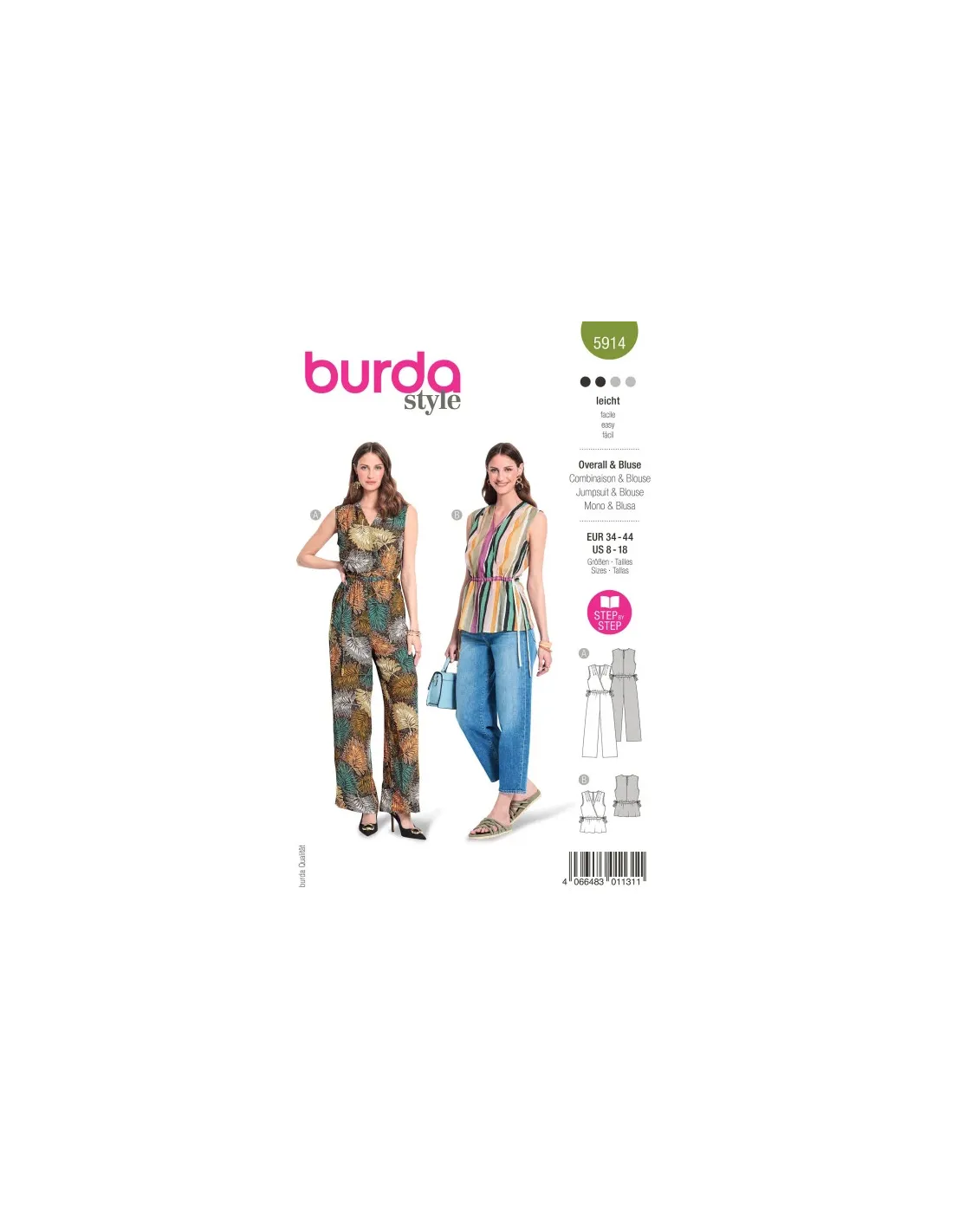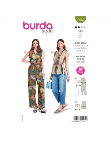 Le haut sans manches, façon cache-cœur, est complété par un pantalon pour la combinaison A, et par une basque pour la blouse B. Deux pièces légères et confortables à porter en été. Des rubans à nouer sur les côtés adaptent la combinaison et la blouse à la morphologie.