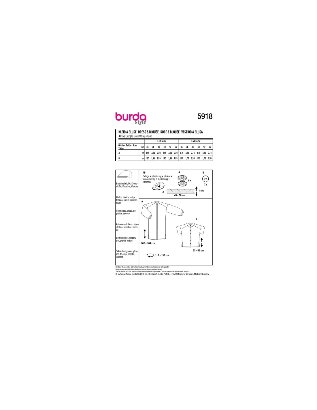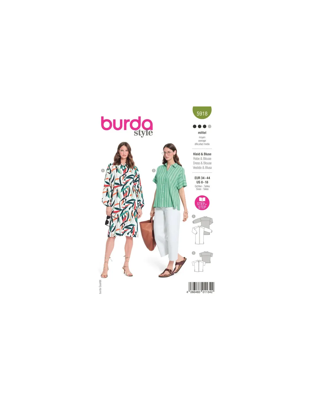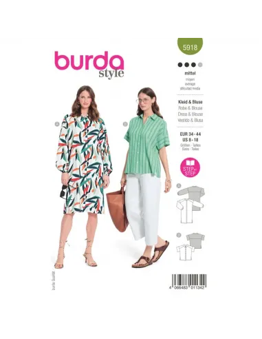 La robe chemise et la blouse arborent une fermeture boutonnée classique sur le devant ainsi qu'un large empiècement d'épaule et des fentes latérales. La robe A avec un col montant et de larges manches longues qui sont resserrées avec un élastique. La blouse B préfère un petit col et des manches courtes.