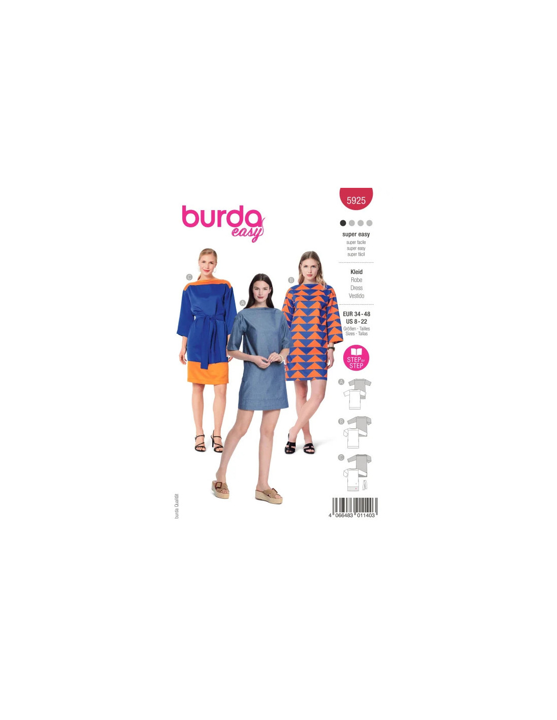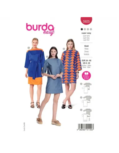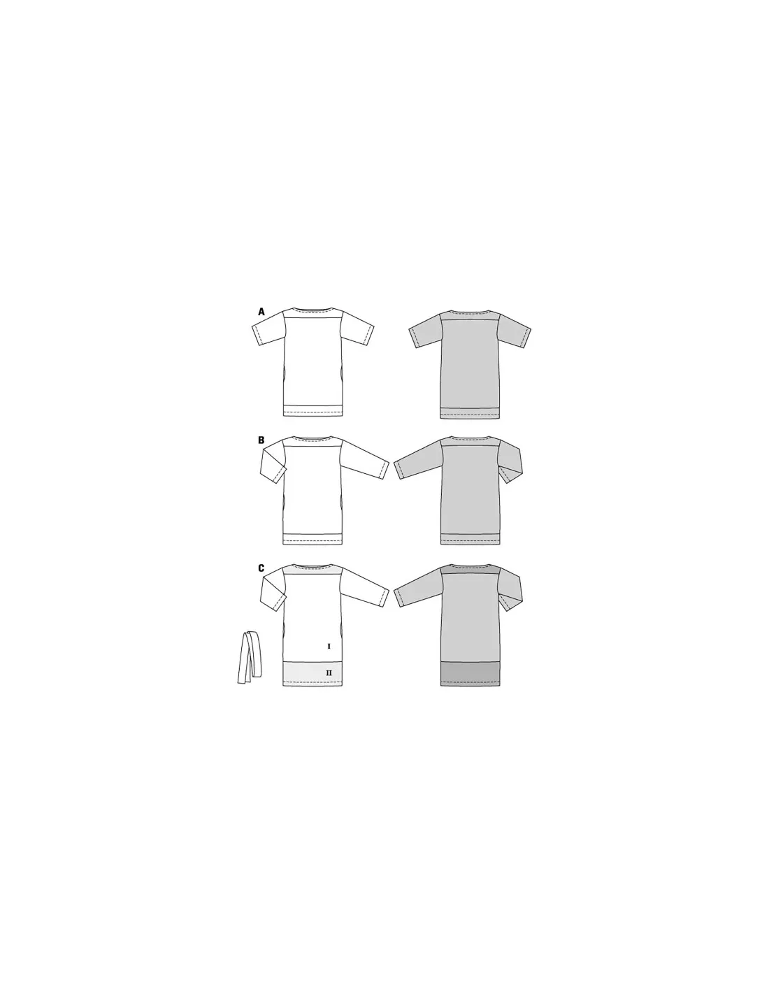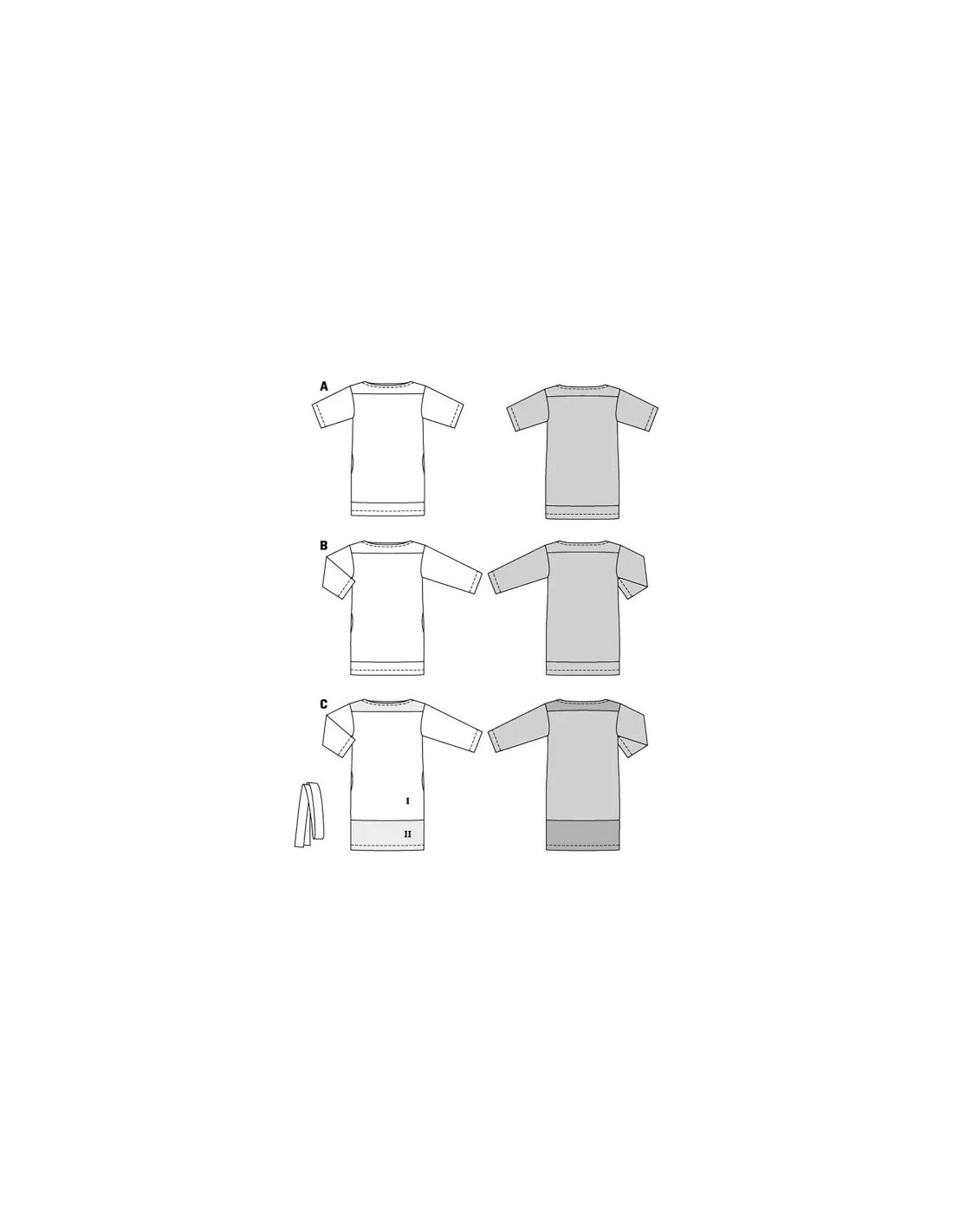 Ces robes de coupe droite avec une encolure bateau et des poches prises dans les coutures conviennent bien aux débutants et invitent à la créativité. Réalisées dans un tissu, les coutures de découpe sont presque invisibles. En associant des étoffes de diverses couleurs, on obtient un look color-bloc tendance. La robe C opte pour une ceinture à nouer.