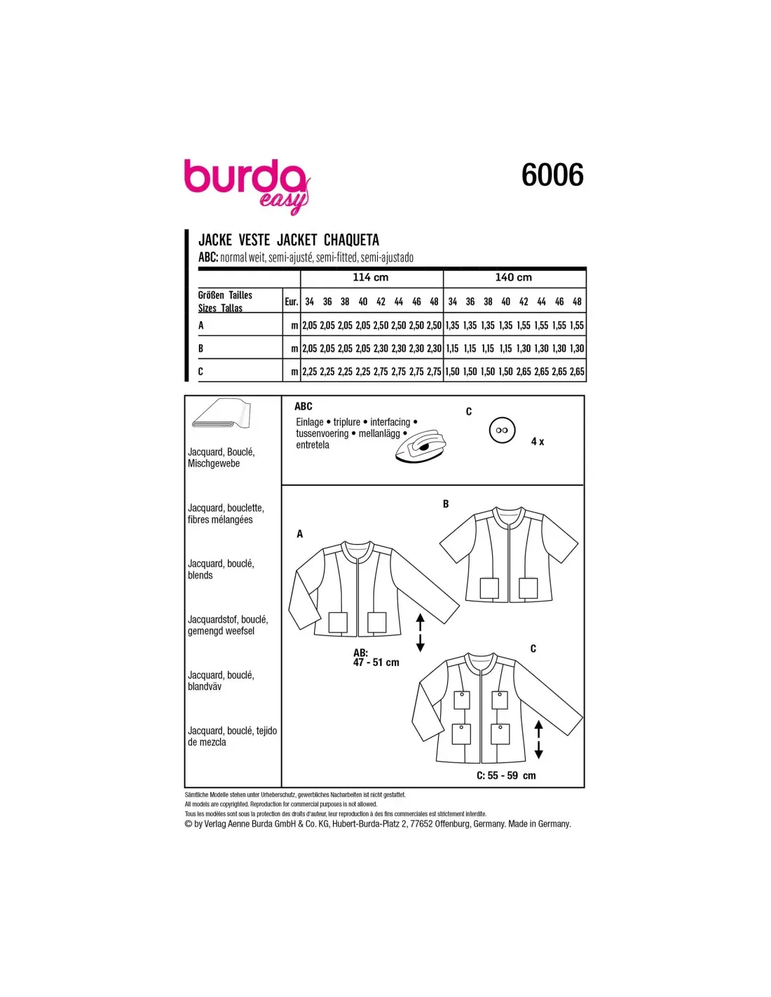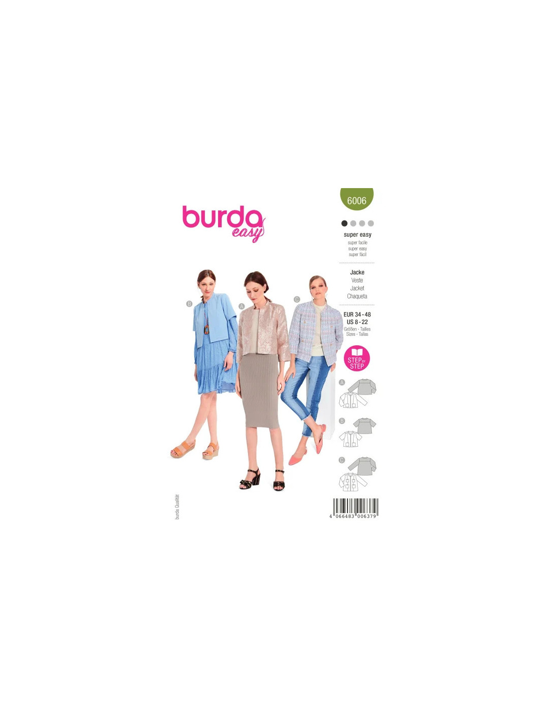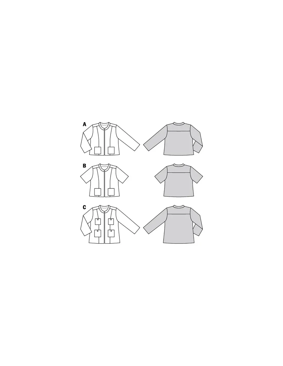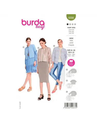 Une petite veste courte de coupe droite, digne de nombreuses occasions. Tantôt à manches longues, tantôt à manches courtes, toujours avec des poches plaquées, un petit col droit et une fermeture devant bord à bord.