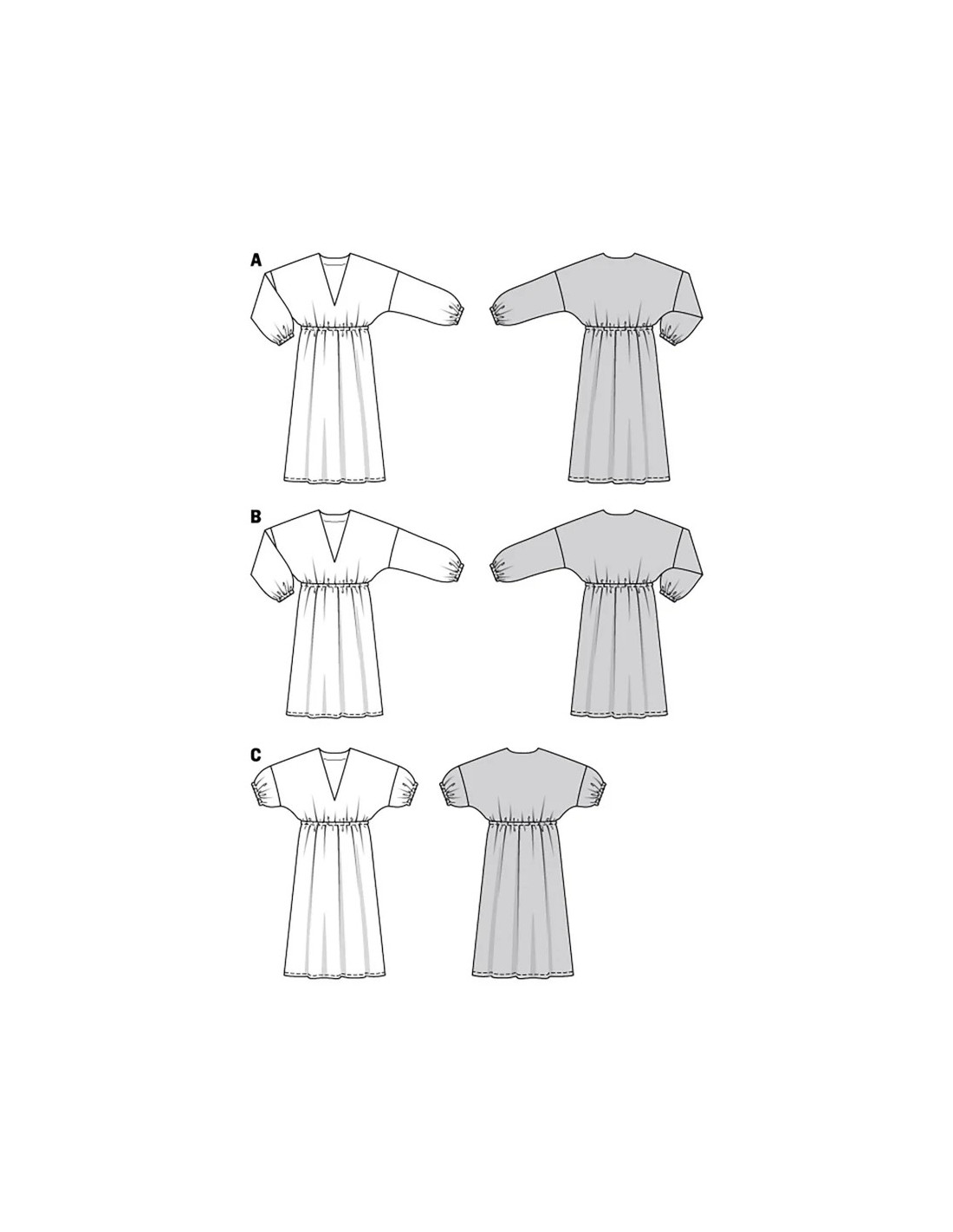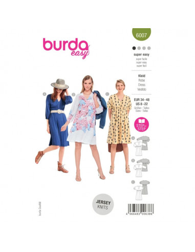 Tellement simples à réaliser, ces robes sans fermeture avec une encolure en V et des élastiques à la taille ainsi qu'aux bords inférieurs de manche s'adaptent à toutes les morphologies. Il ne reste plus qu'à les enfiler. Des jerseys imprimés au tombé fluide mettent ces modèles bien en valeur.