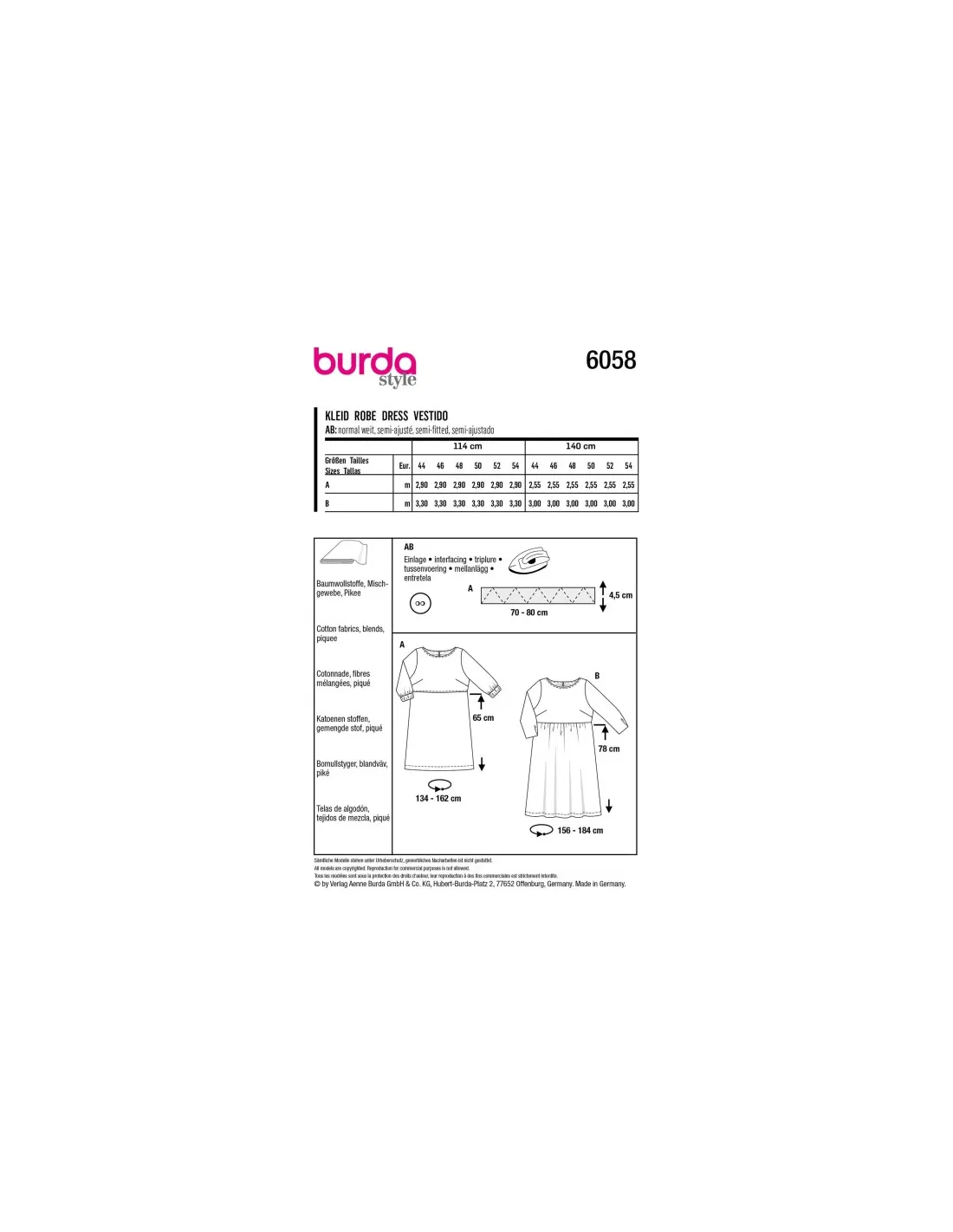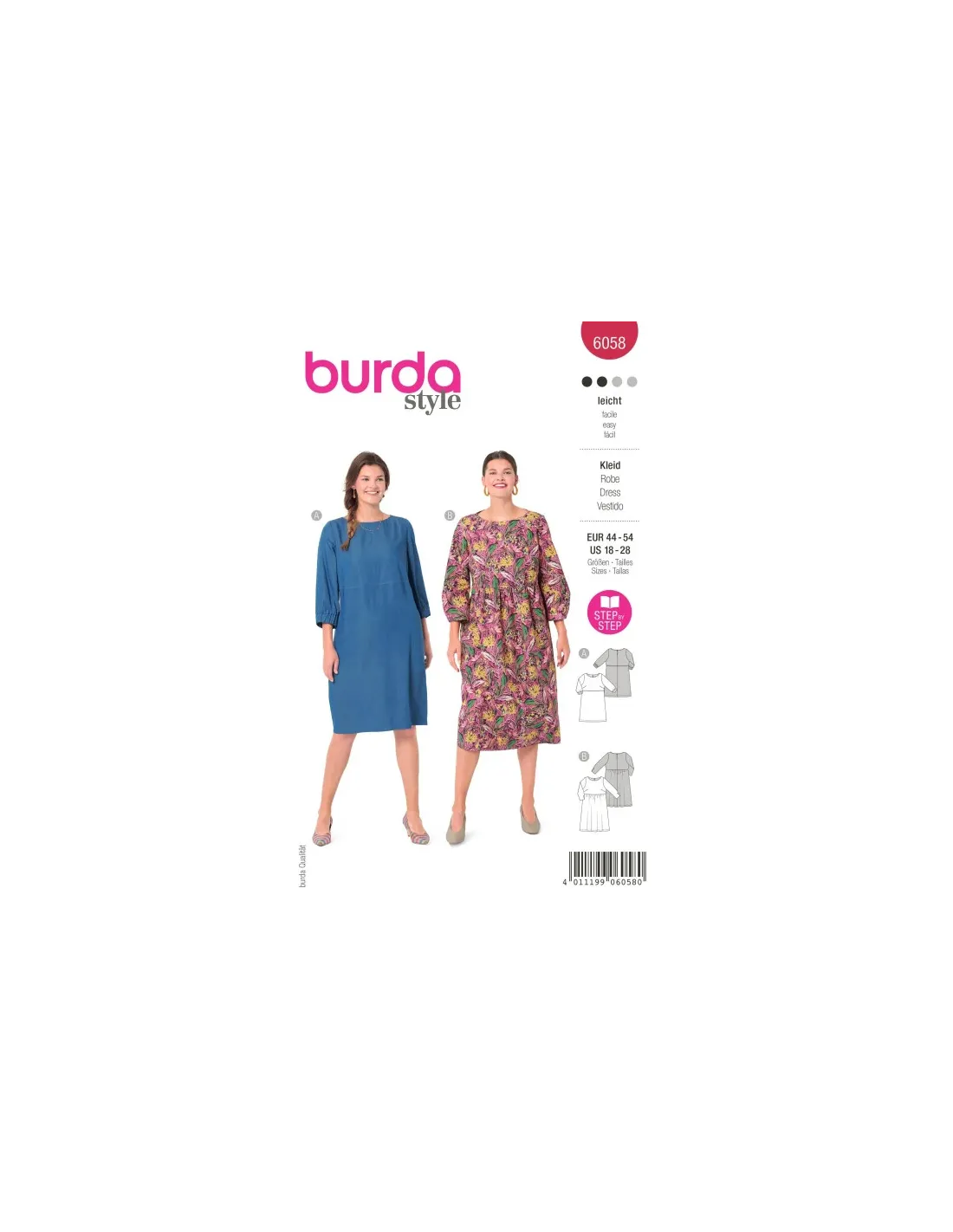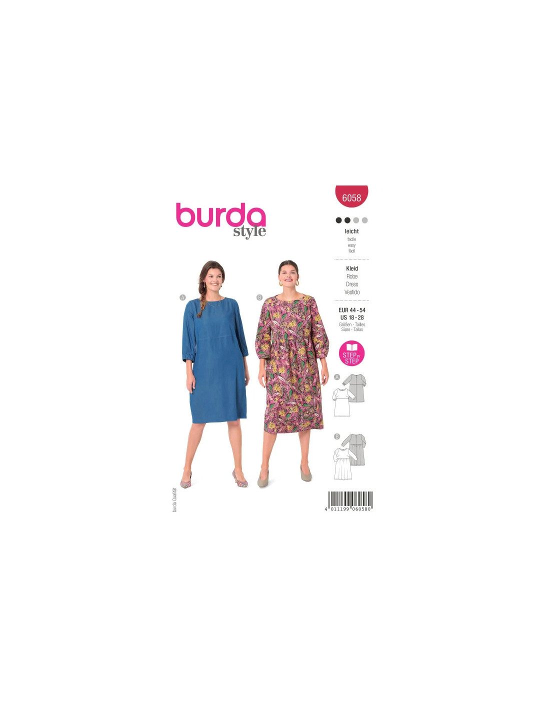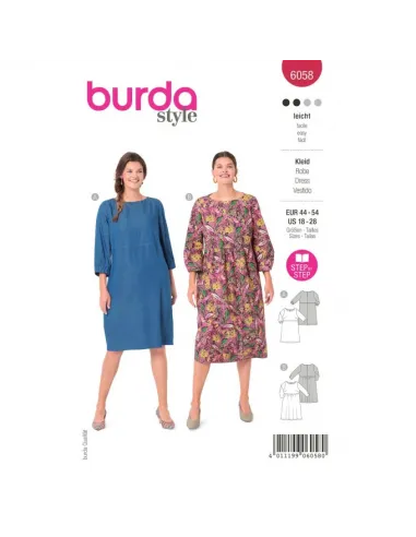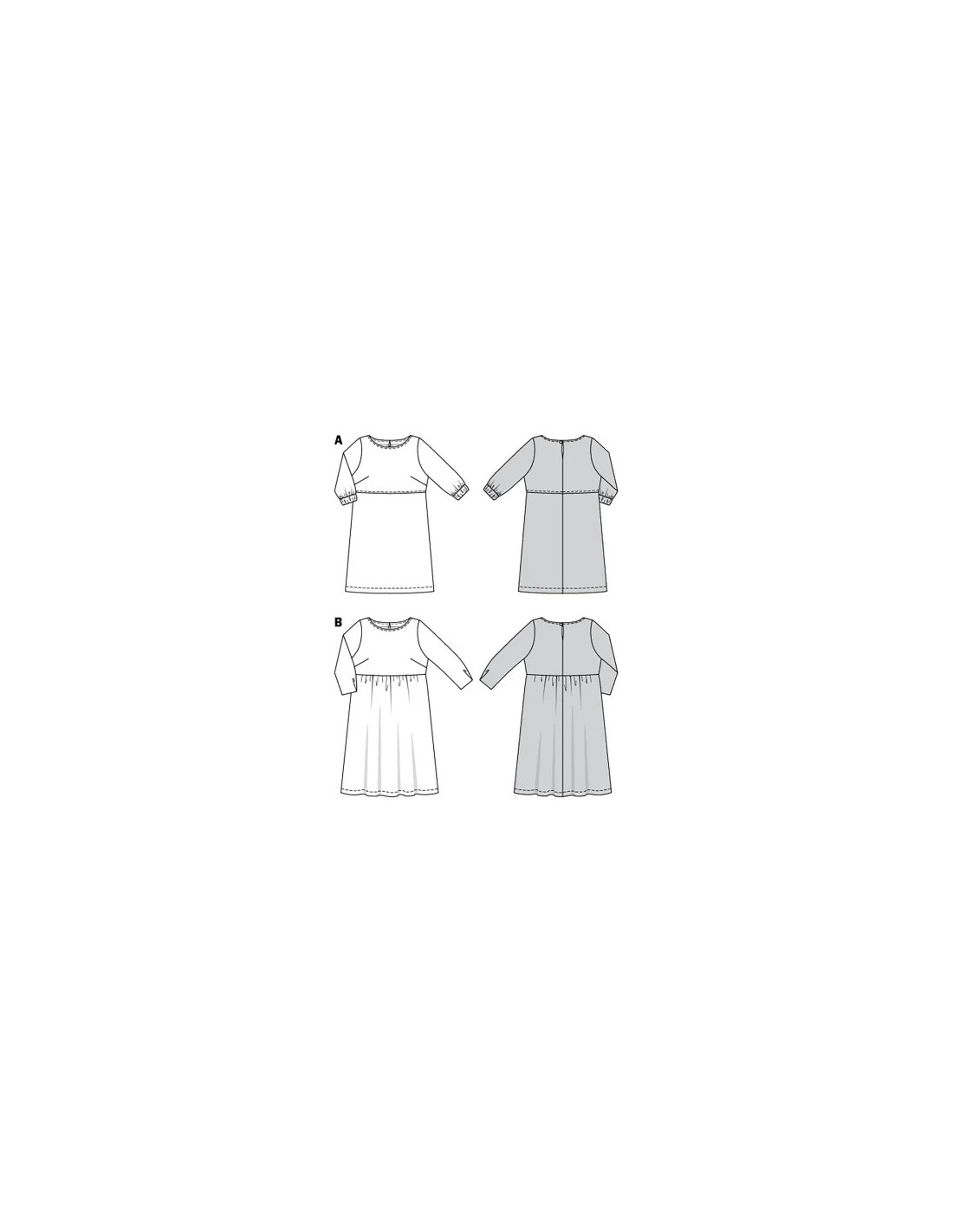 Adaptées à diverses morphologies, ces robes à encolure arrondie arborent sur l'arrière une petite fente avec un bouton et une bride. La variante B se caractérise par une taille haute froncée qui lui confère plus de mouvement.