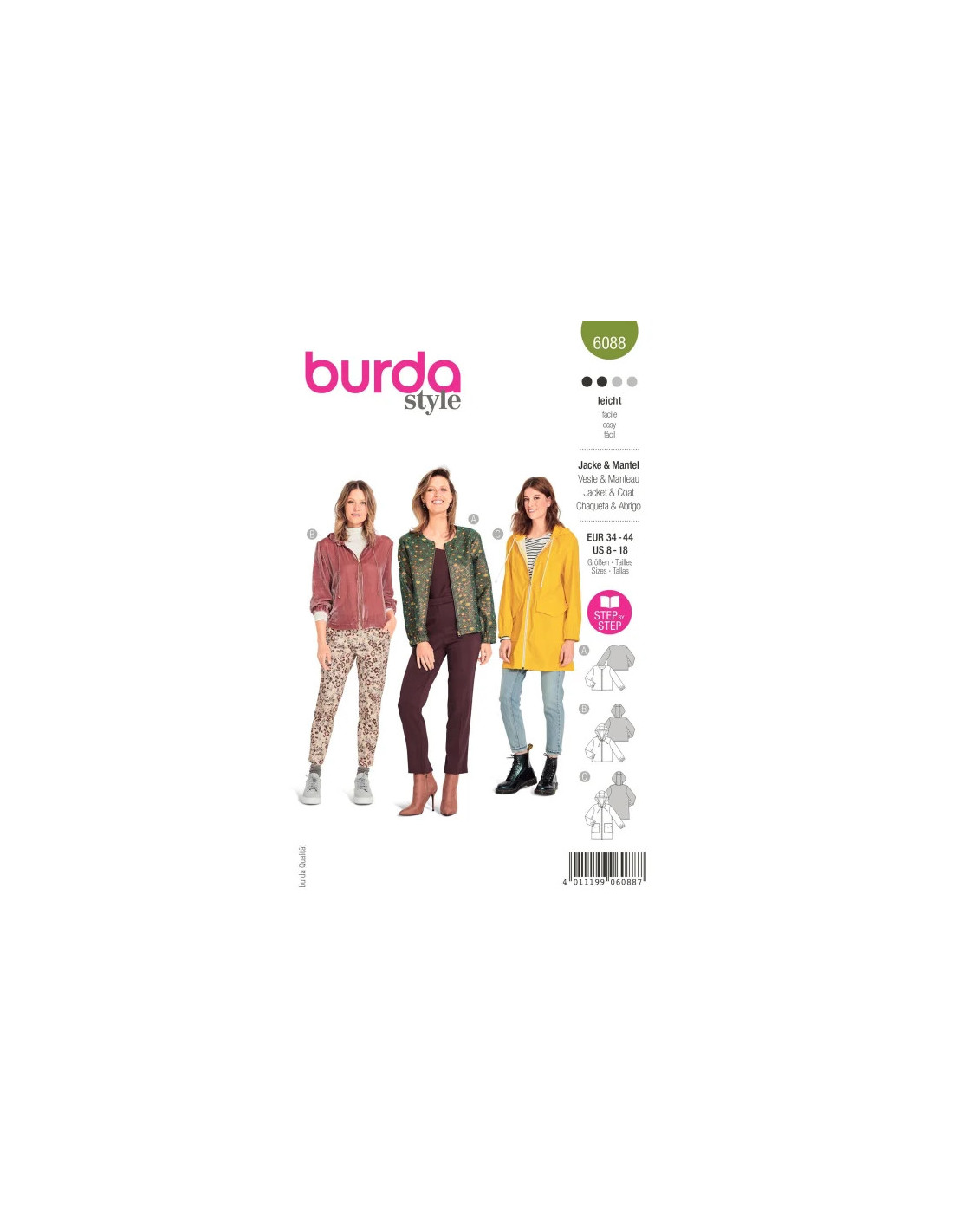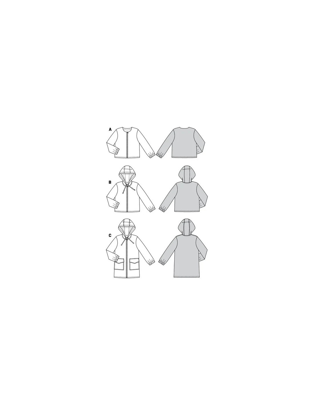 Une forme de veste sobre avec une fermeture à glissière dans différentes longueurs. Elle est la base non seulement d'une veste sportive à capuche et d'un imperméable court muni de poches, mais aussi d'une veste chic pour les sorties. Le choix du tissu et les détails font la différence.