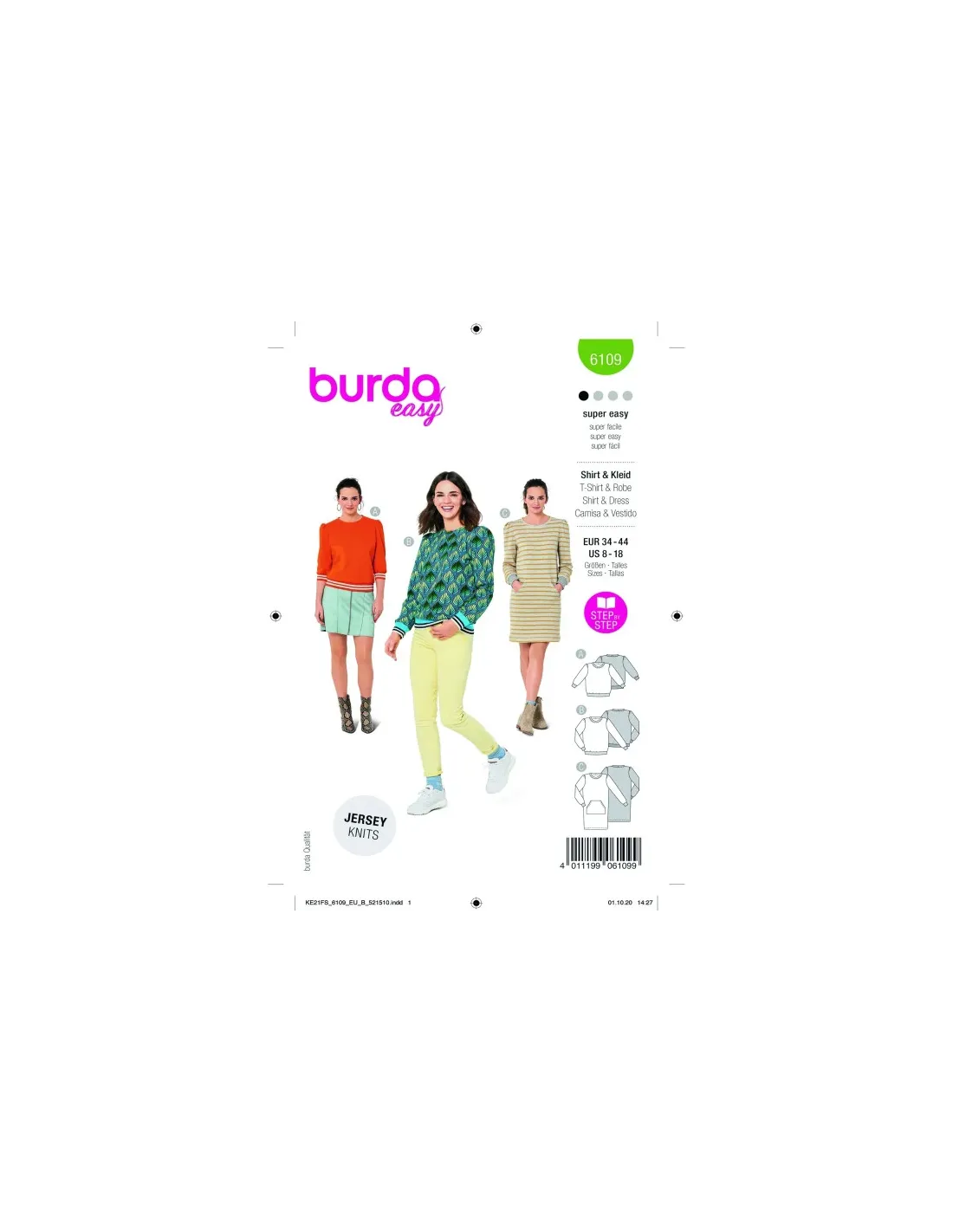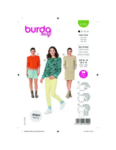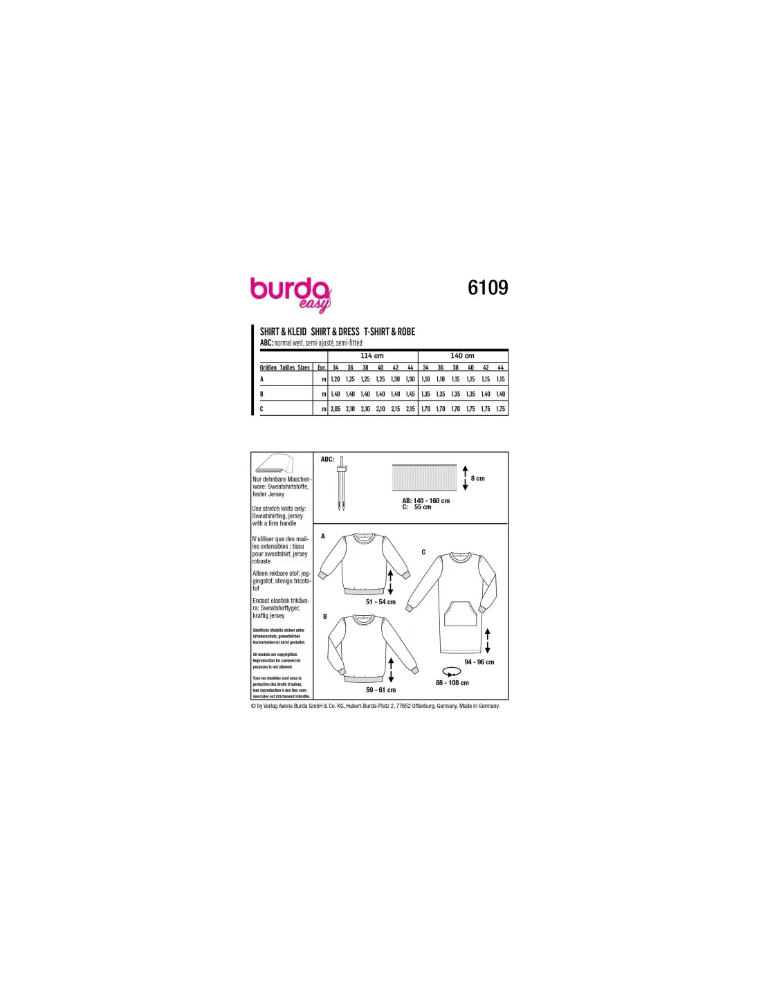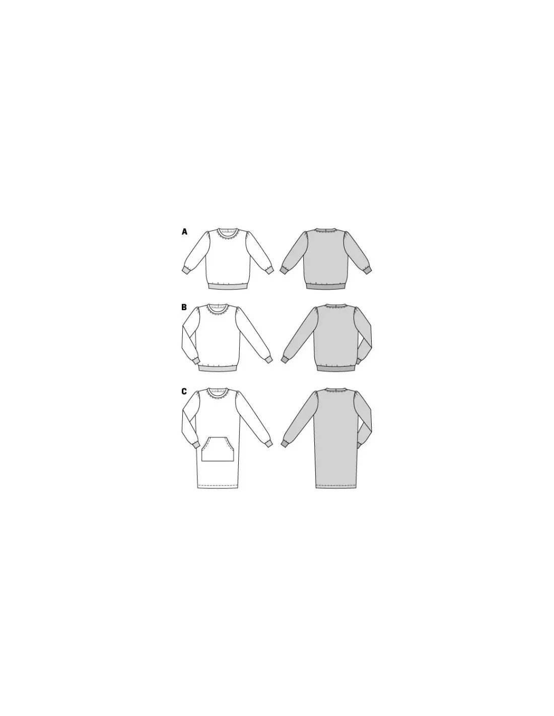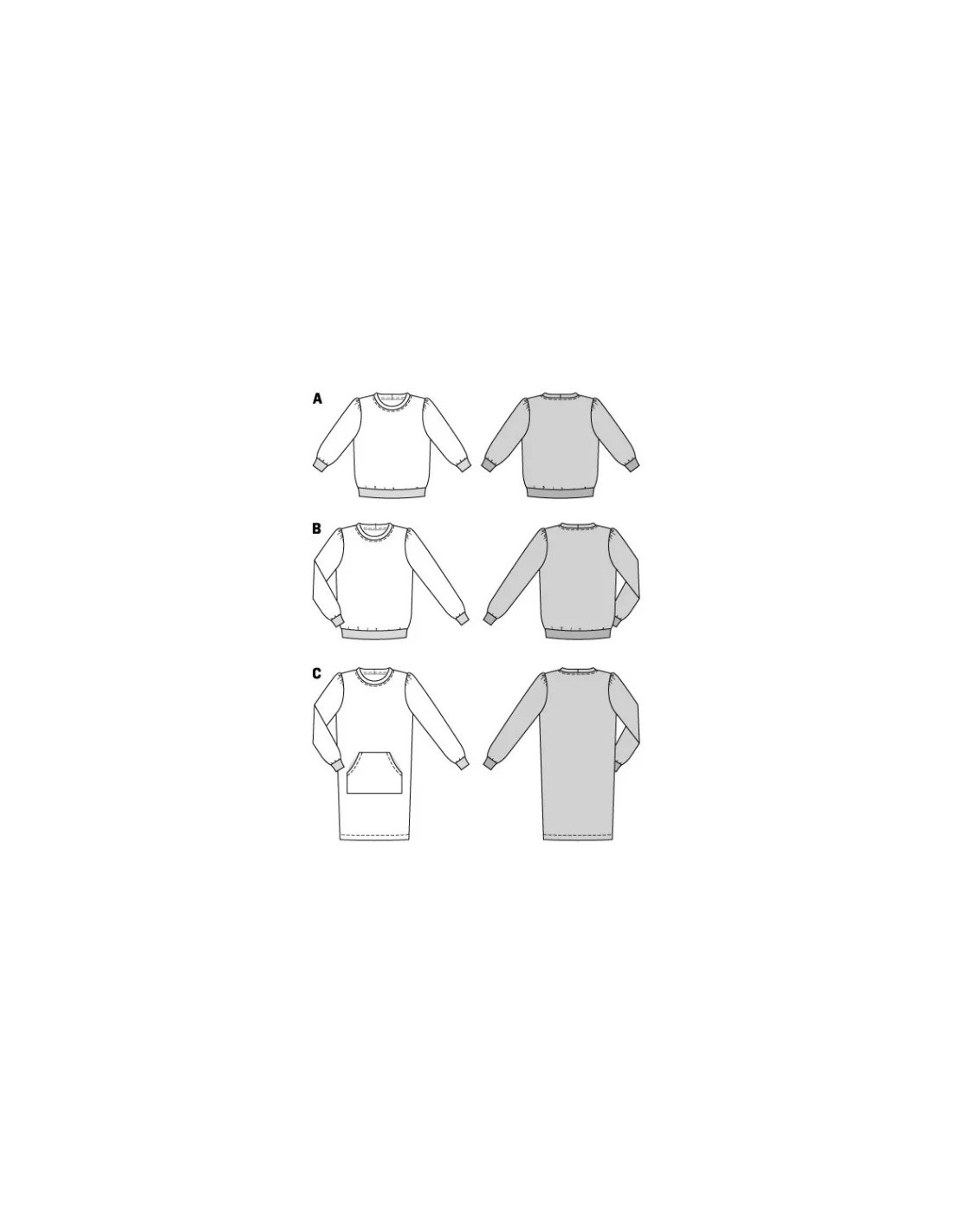 Des sweat-shirts confortables sont incontournables surtout s'ils s'offrent de jolies bordures rayées et de nouvelles manches, désormais froncées selon la tendance mode. Quant à la version robe avec sa poche kangourou, elle a du potentiel et deviendra vite la pièce préférée de la garde-robe.Tissus conseillés: N'utiliser que des mailles extensibles : tissu pour sweat-shirt, jersey robusteMercerie nécessaire: ABC : 1 aiguille jumelée, bordure côtelée, largeur 8 cm : AB : 1,40 à 1,60 m, C : 0,55 m