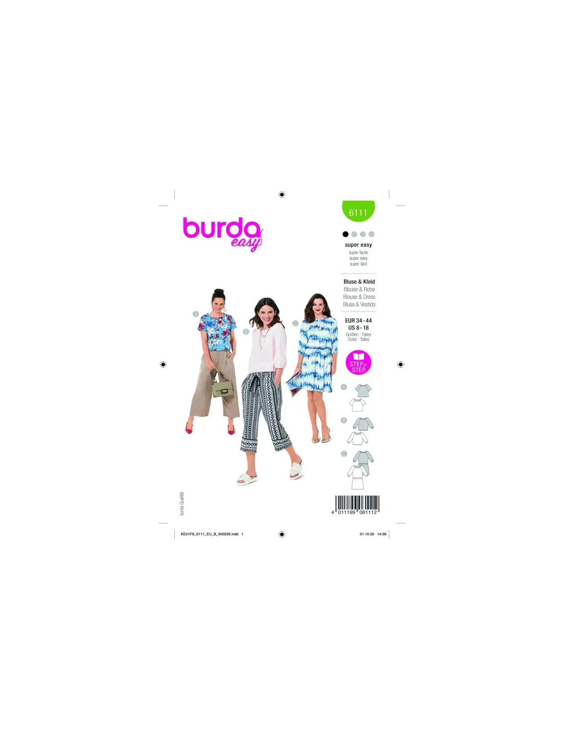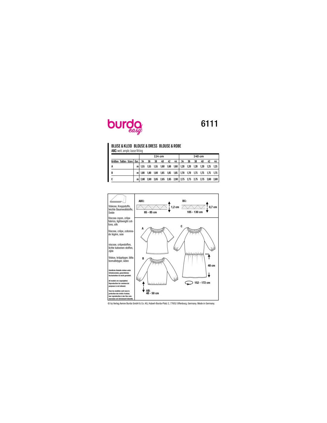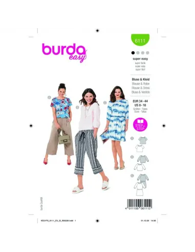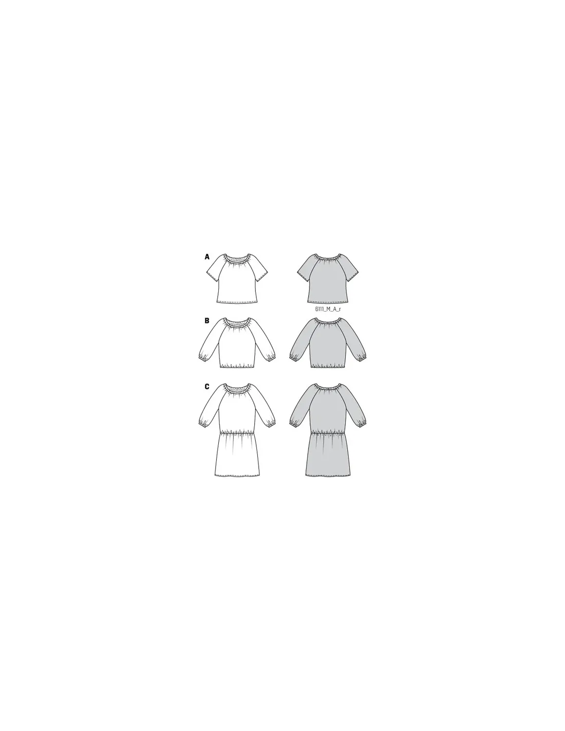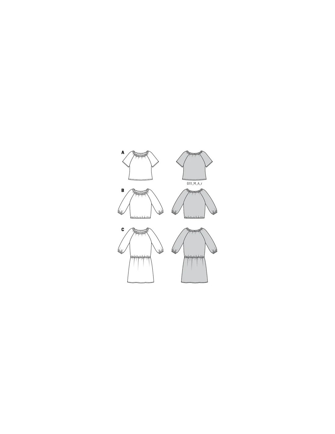 Des blouses lâches composées d'une encolure Carmen et d'une coulisse élastiquée qui conviennent parfaitement pour l'été. Selon l'évènement, on choisit la version à manches courtes ou à manches 3/4 resserrées par une coulisse élastiquée. Après avoir découvert ces blouses, on adoptera également la robe de coupe identique, dotée d'une taille élastiquée. Tissus conseillés: Viscose, crêpe, cotonnade légère, soieMercerie nécessaire: ABC : élastique, largeur 1,2 cm : 65 à 85 cm. BC : élastique, largeur 0,7 cm : 1,05 m à 1,30 m