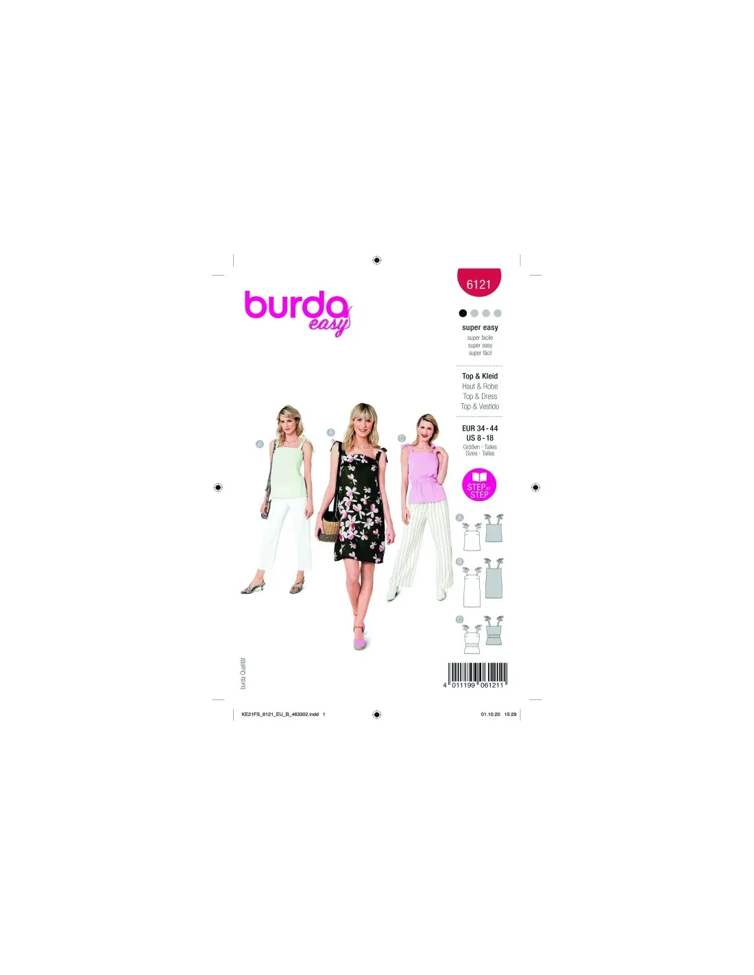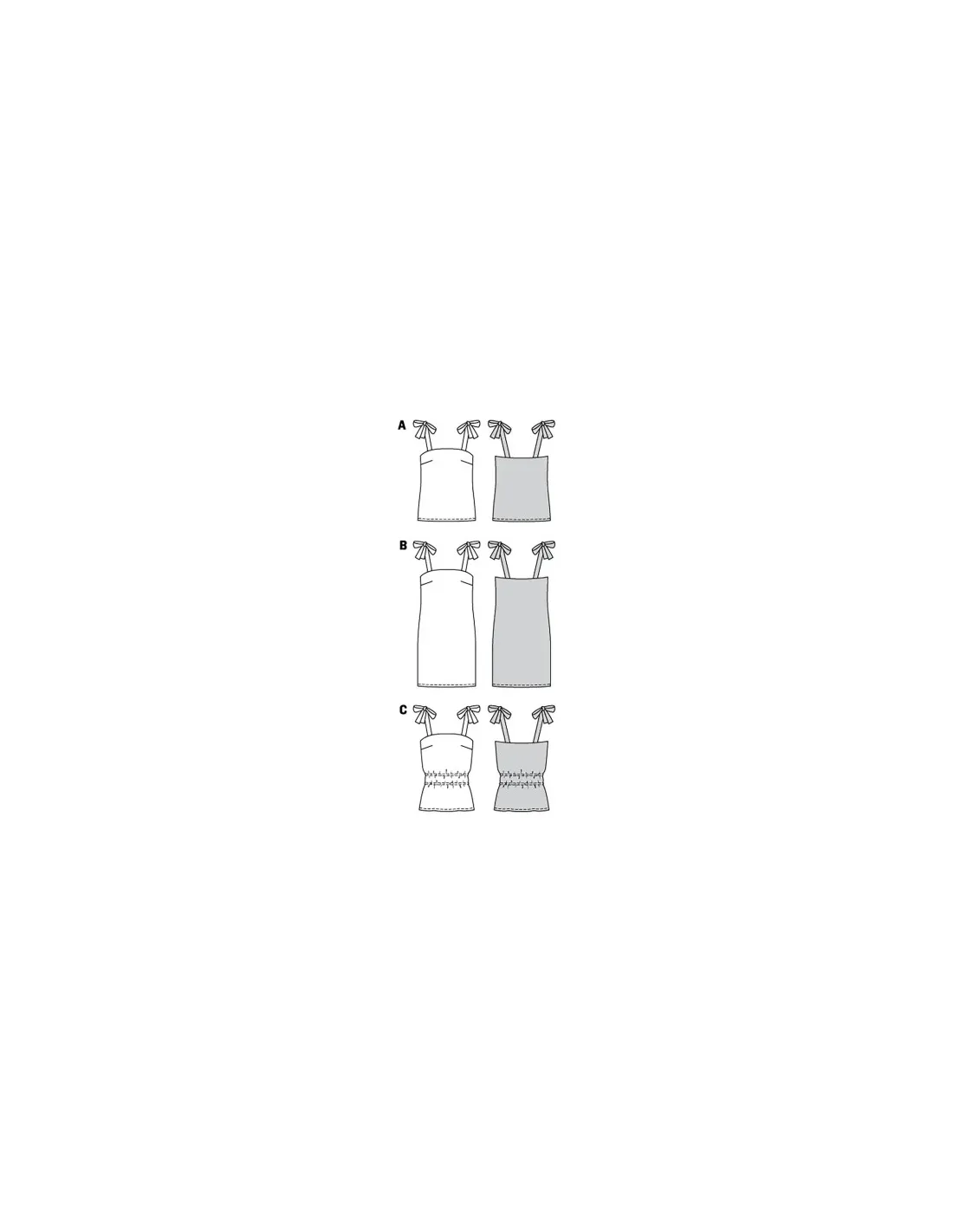 Pour accueillir l'été, des tops faciles à coudre et une robe courte à bretelles. Joliment nouées sur l'épaule, les bretelles dissimuleront aisément celles du soutien-gorge ou du bikini. Un smock élastique appuie le top B à la taille.Tissus conseillés: Cotonnade, fibres mélangées, viscose, soieMercerie nécessaire: ABC : entoilage thermocollant, C : fil élastique