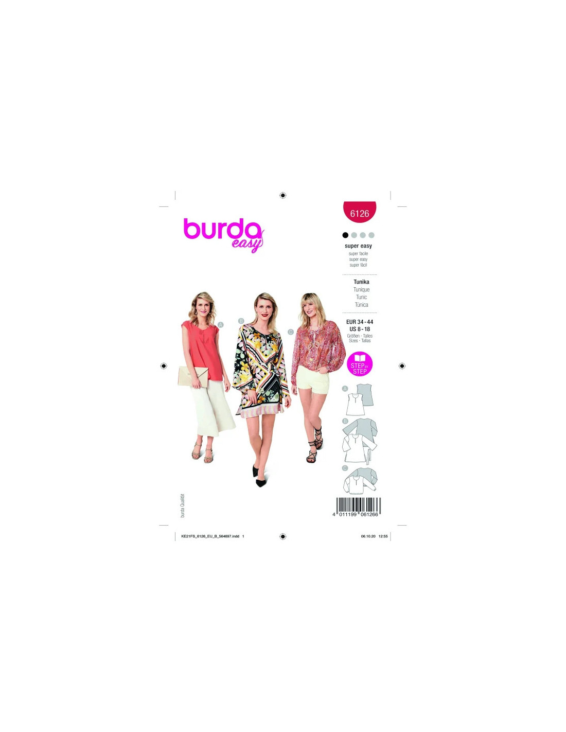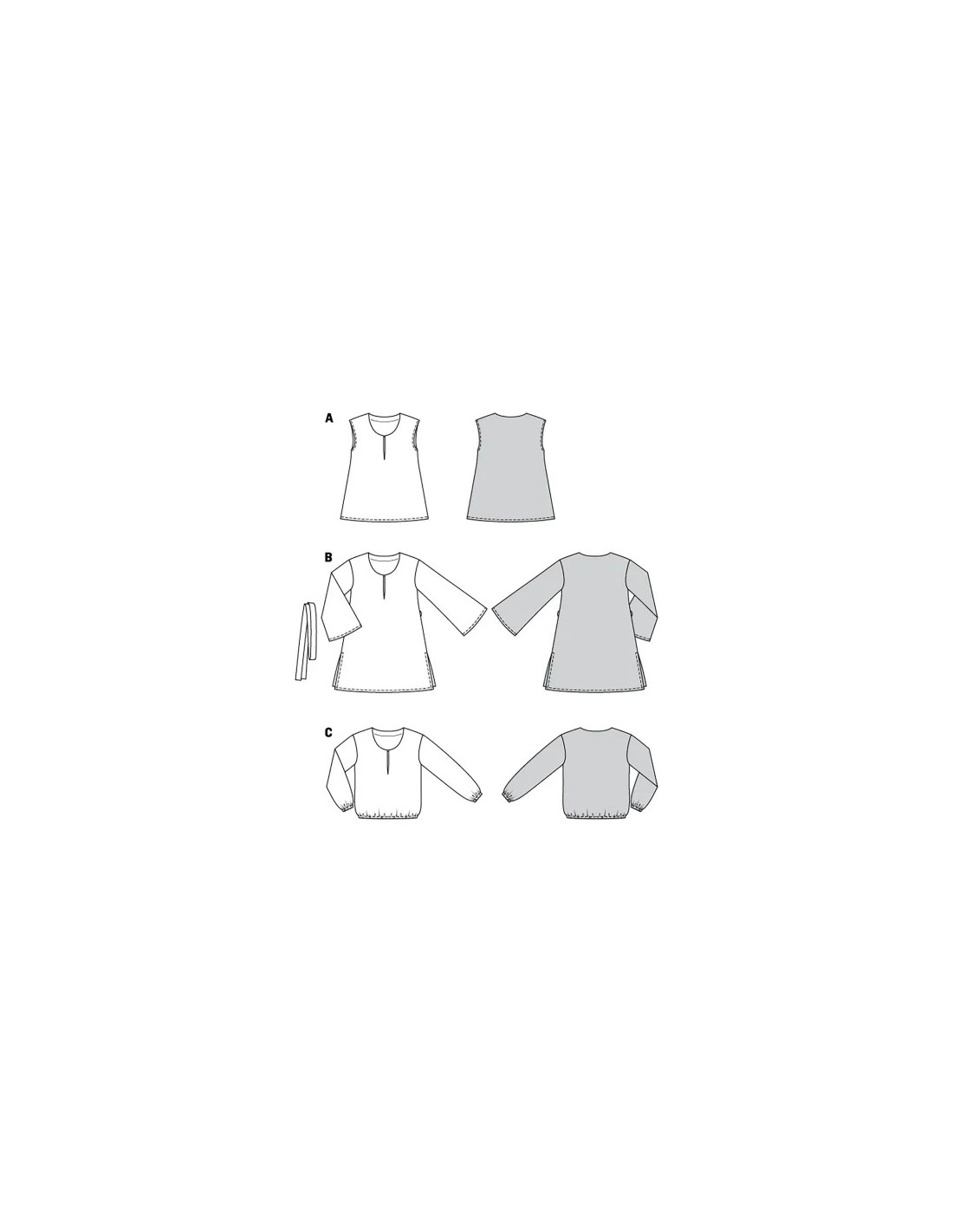Une tunique classique pour de nombreuses occasions. A sans manches et dans une légère ligne trapèze pour l'été. Avec des fentes latérales, des manches trompette et une ceinture à nouer, B cartonne également comme robe. Quant à la pièce C, un élastique fronce les manches et l'ourlet.Tissus conseillés: Viscose, crêpe, cotonnade légère, linMercerie nécessaire: ABC : entoilage thermocollant, 1 bouton. A : biais, largeur 4 cm : 0,85 - 1,00 m, C : élastique, largeur 1 cm : 1,40 - 1,65 m