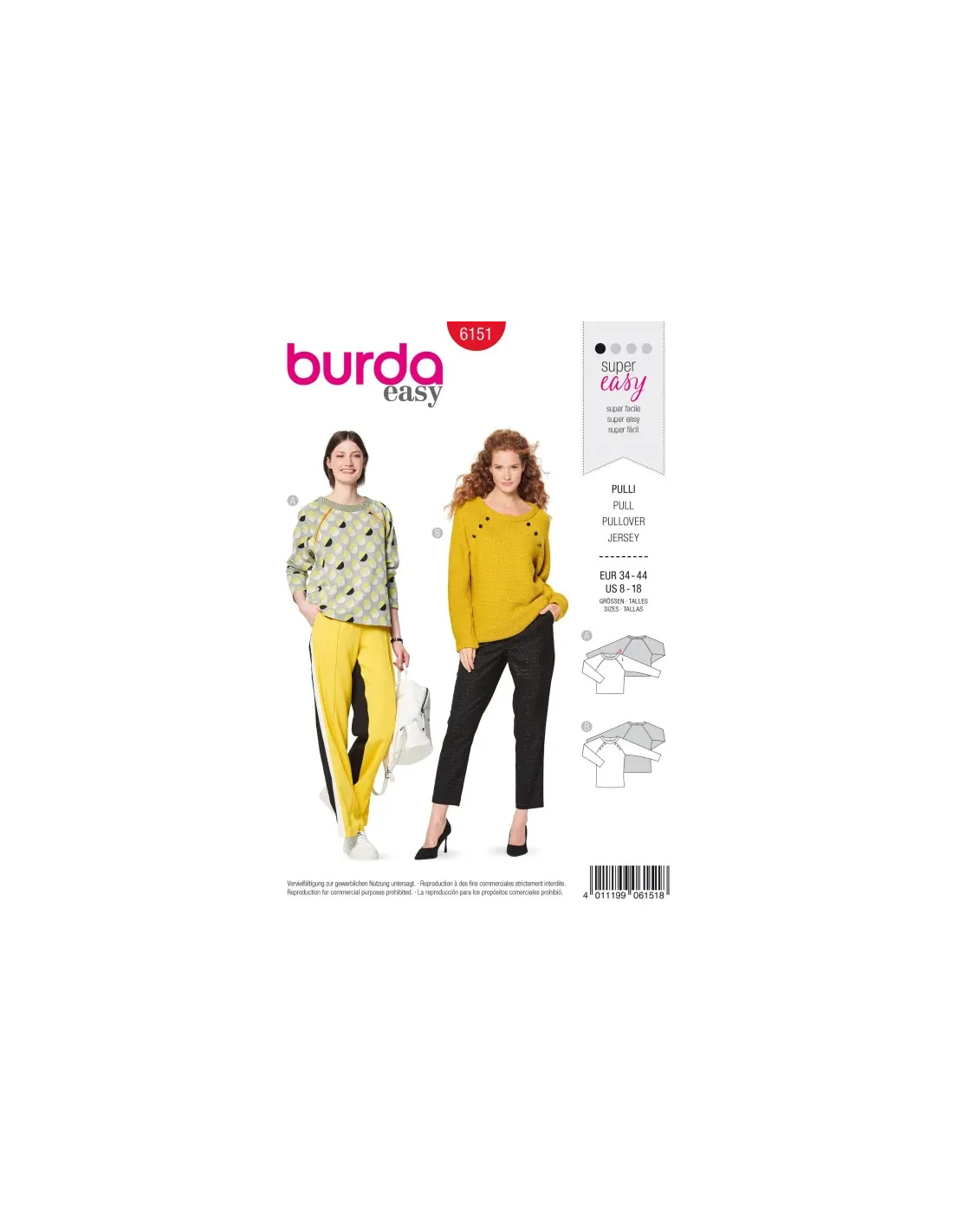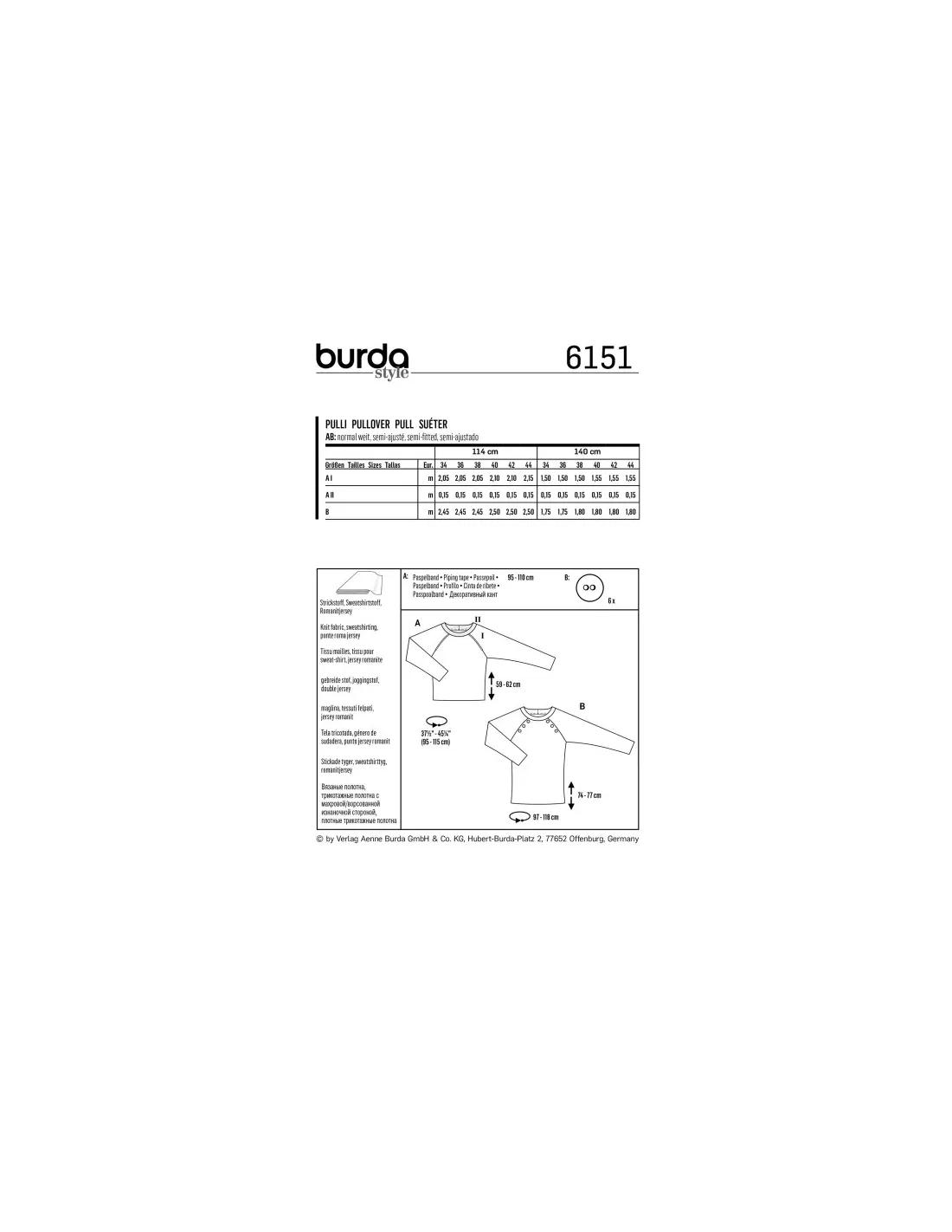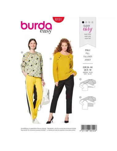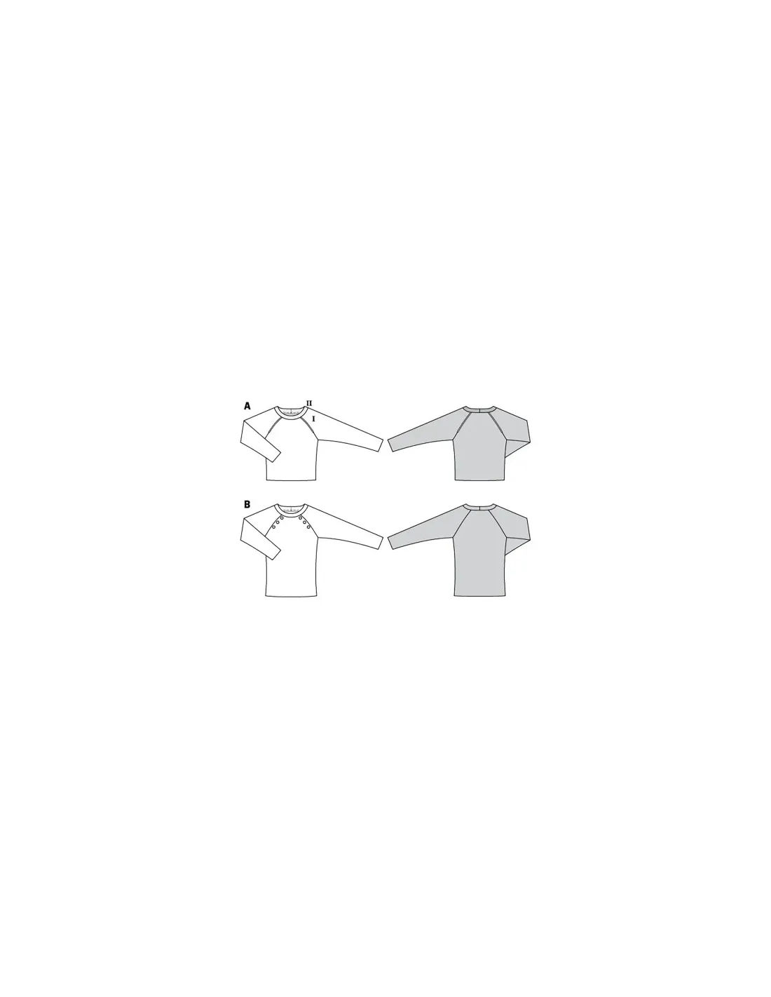 Pour le bureau toute l'année, des sweat-shirts décontractés en deux longueurs, agréables à porter et faciles à coudre. Un passepoil ou des boutons soulignent la couture raglan et un joli parement finit l'encolure ronde. Jouez avec les contrastes en utilisant un tissu rayé pour le sweat-shirt et un uni pour le parement par exemple. Niveau de difficulté: 1-Super Facile, Spécial DébutantsMercerie nécessaire: A : passepoil : 95 - 110 cm. B : 6 boutons.Tissus conseillés: Tissu mailles, tissu pour sweat-shirt, jersey romanite